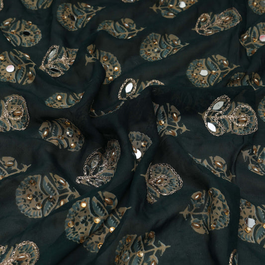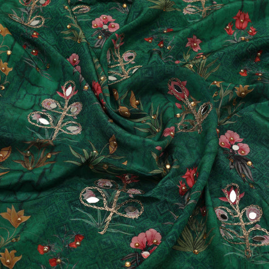 Green Color Crepe Position Print Embroidery Fabric (Cut Pieces 4Mtr)