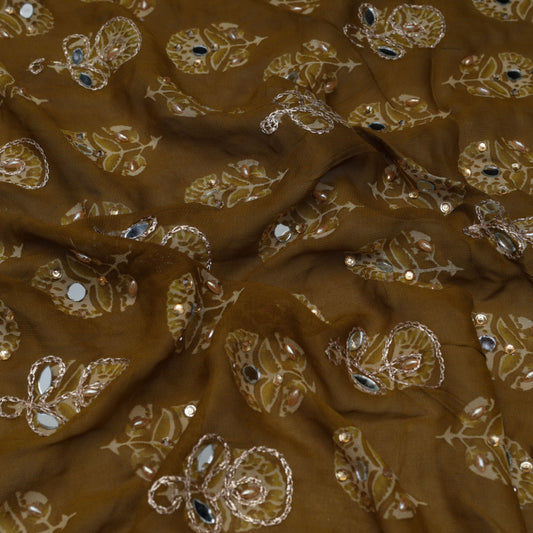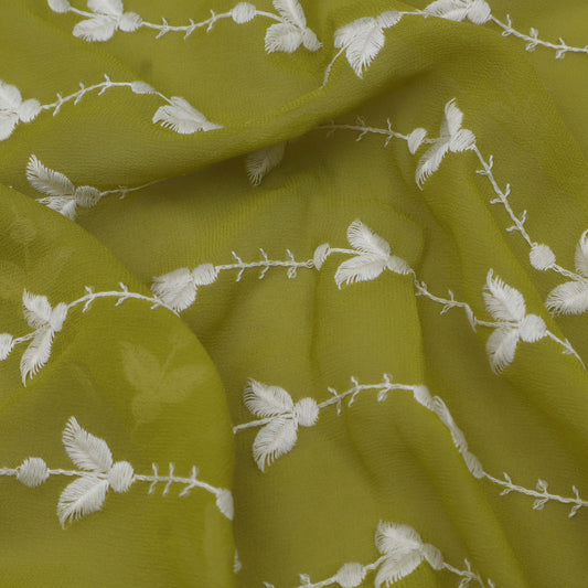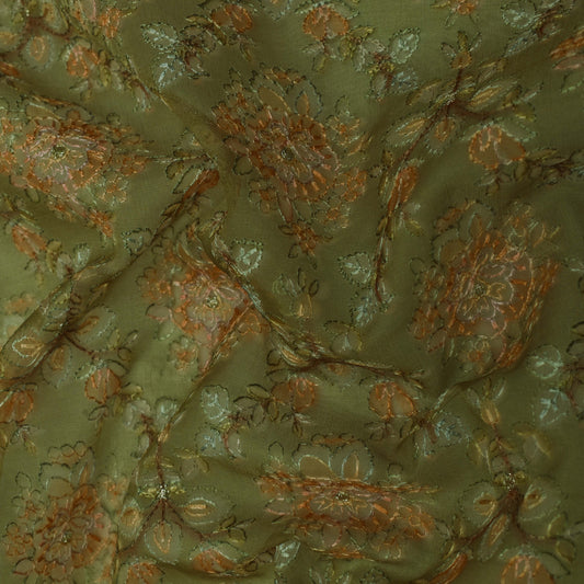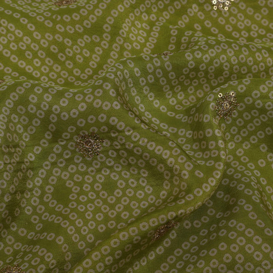 Mehndi Green Color Chinon Position Print Embroidery Fabric