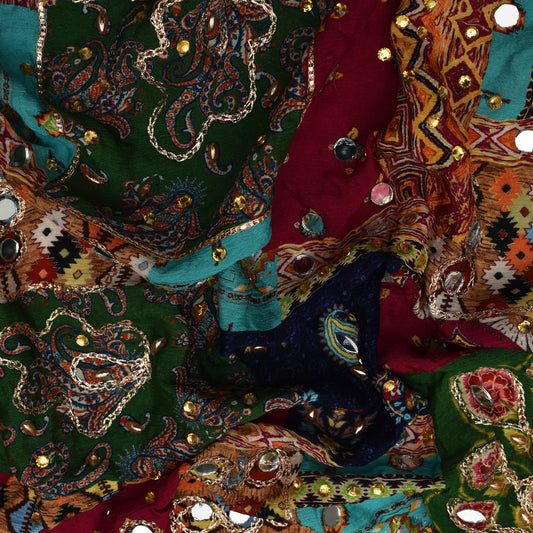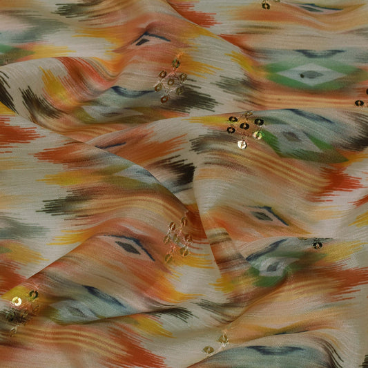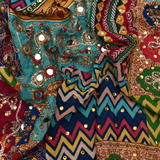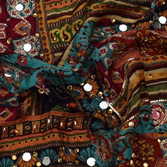 Multi Color Chinon Print Mirror Work Fabric
