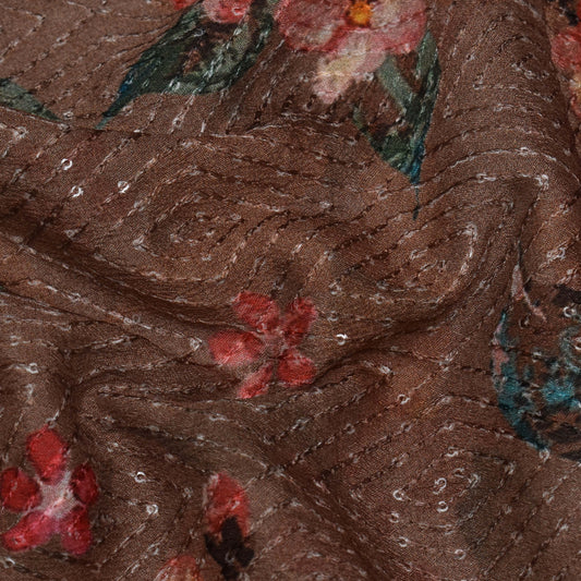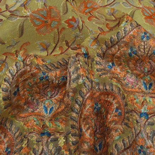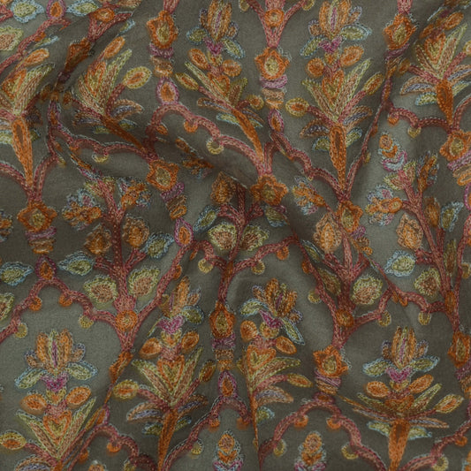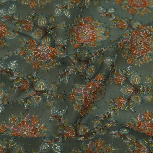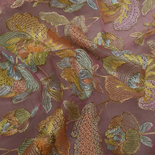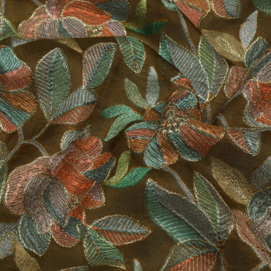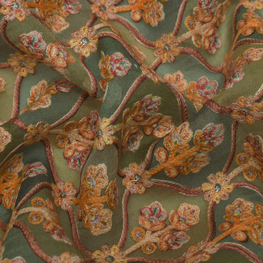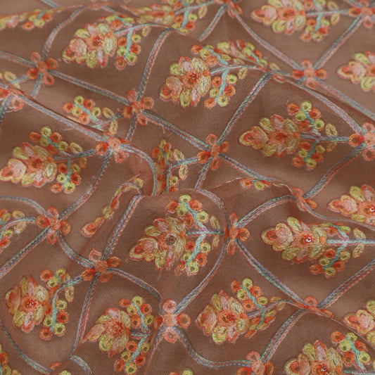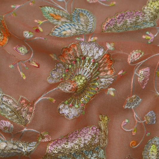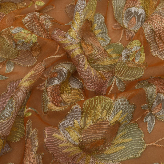 Orange Multi Colored Organza Embroidery Designer Fabric
