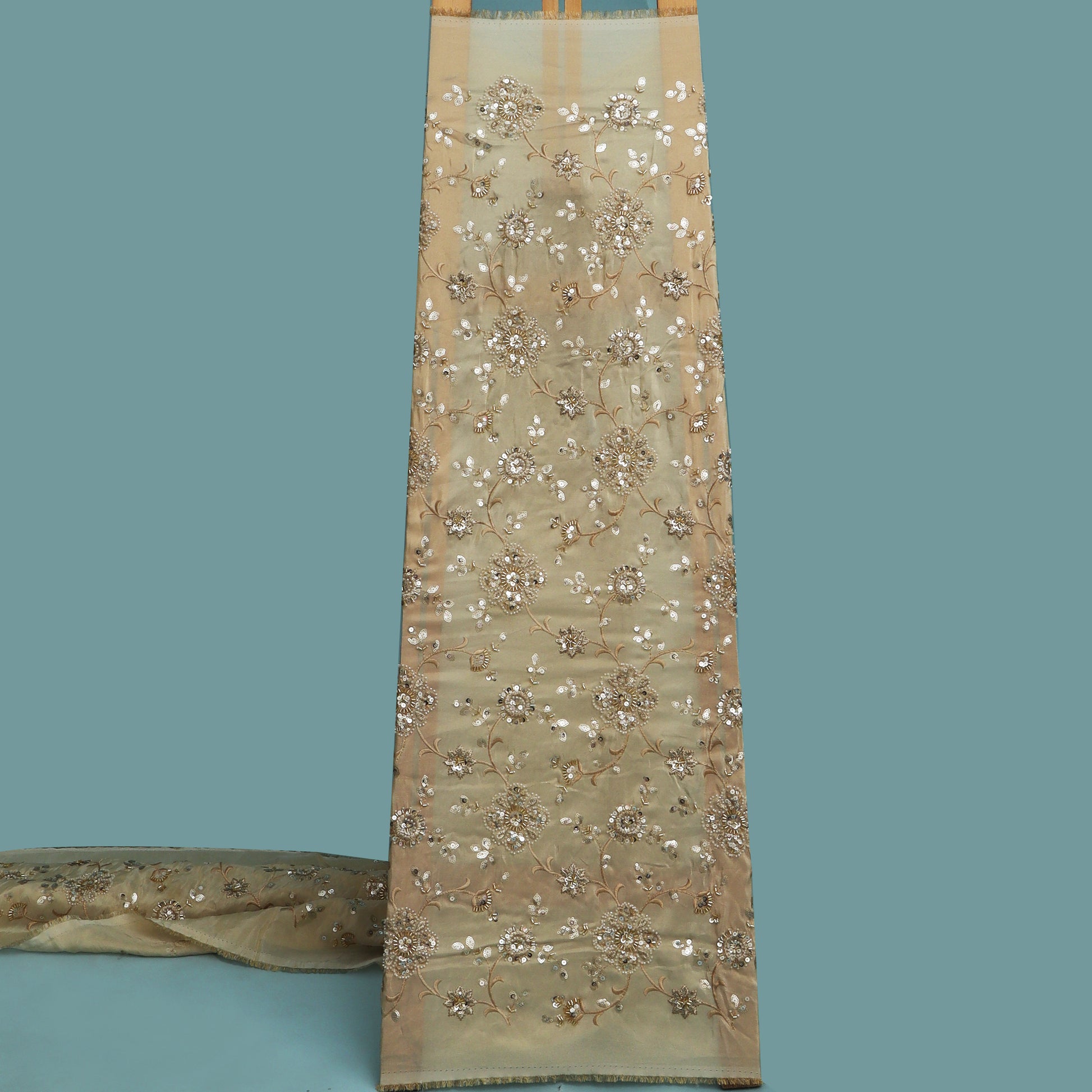 This Beige Color Tissue Embroidery Fabric is a perfect choice for adding a touch of elegance to your projects. The embroidered design adds a classic and sophisticated look, while the tissue fabric provides a lightweight and airy feel. Create stunning apparel, home decor, and more with this versatile and high-quality fabric.
