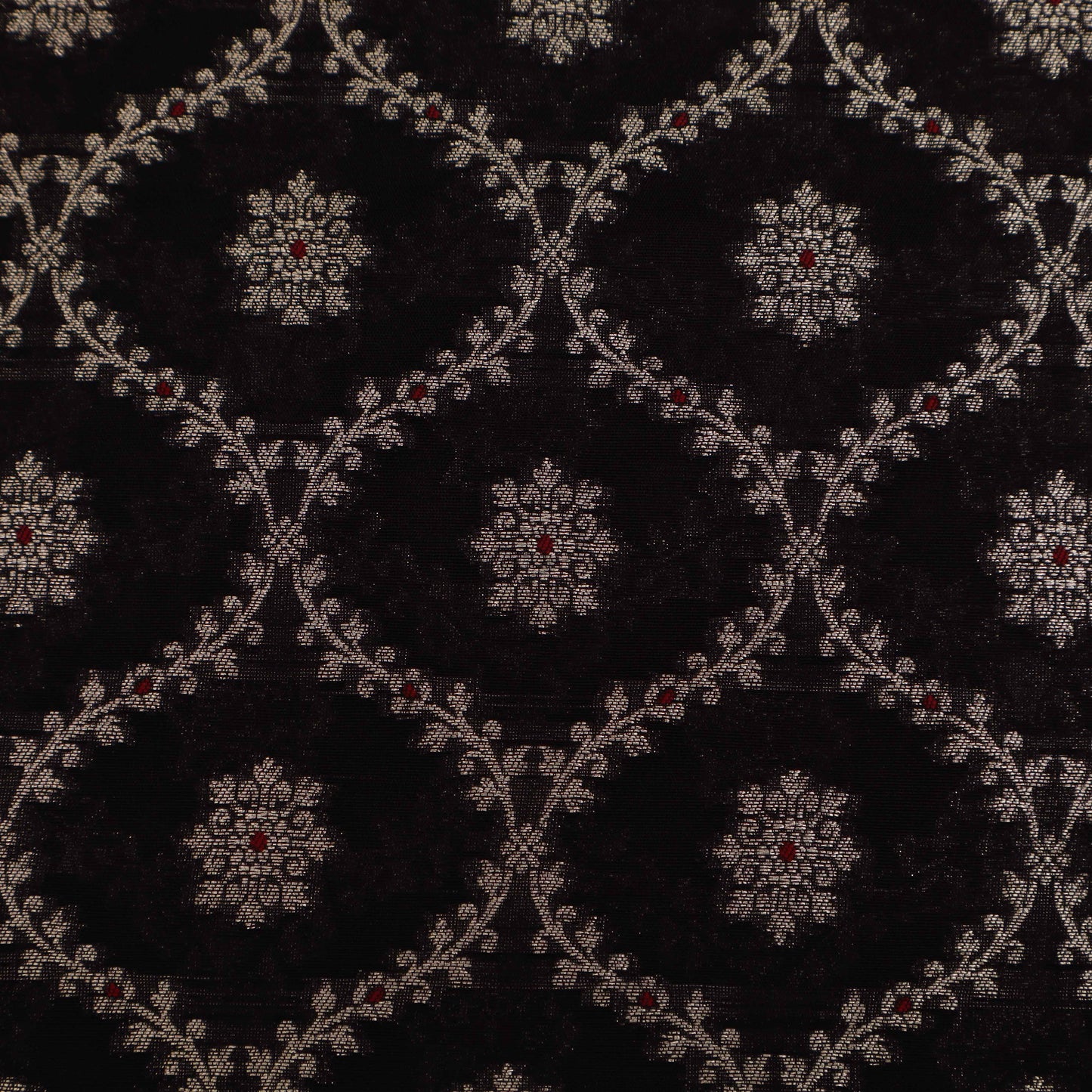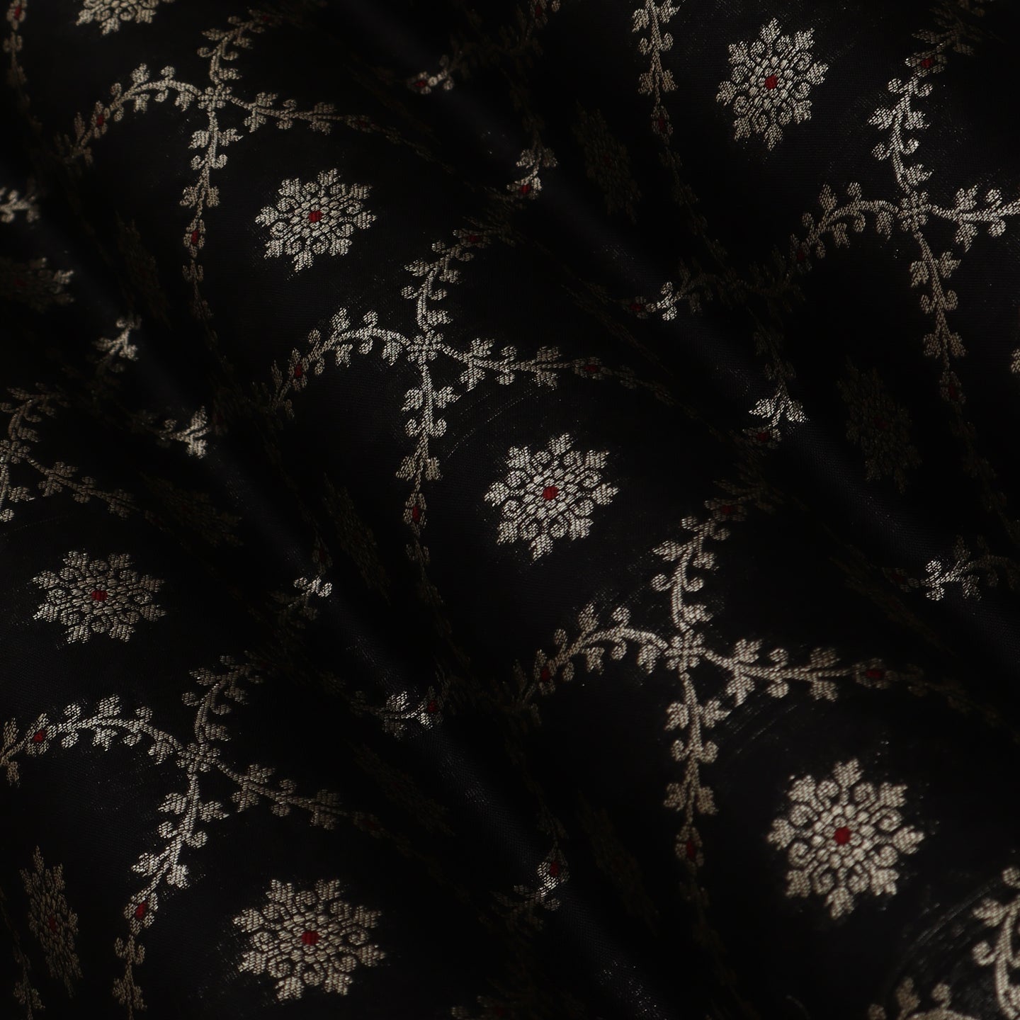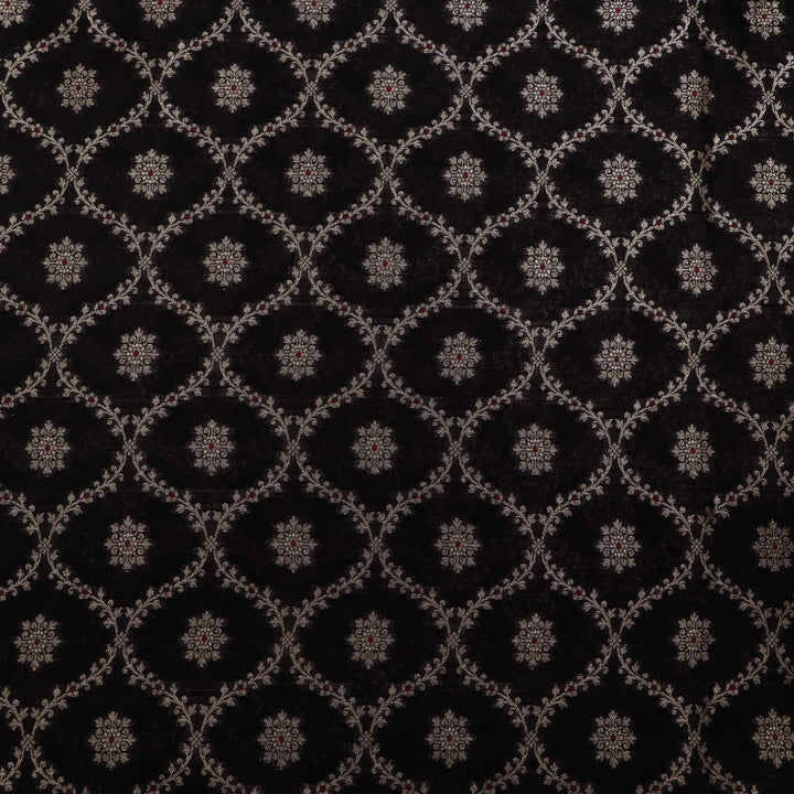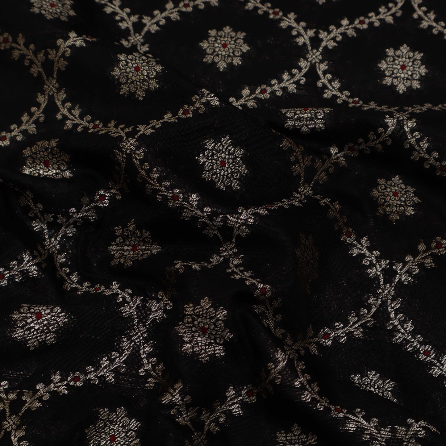 "Experience the luxury of this Black Color Katan Meena Jaal Brocade Fabric. The intricate detailing of this fabric will elevate any garment, adding an elegant touch. Made with the highest quality materials, this fabric offers durability, comfort, and style. Perfect for creating timeless and sophisticated outfits."