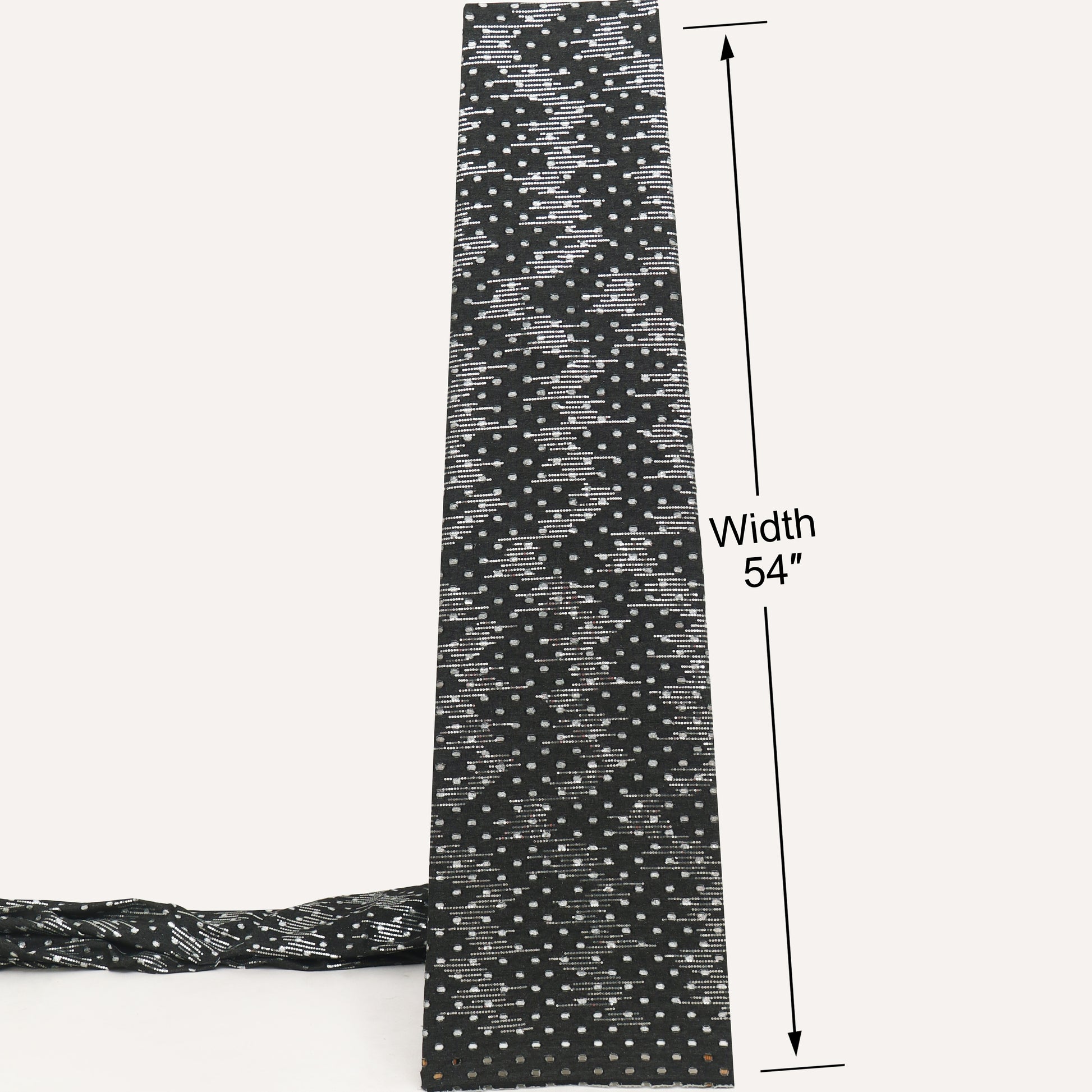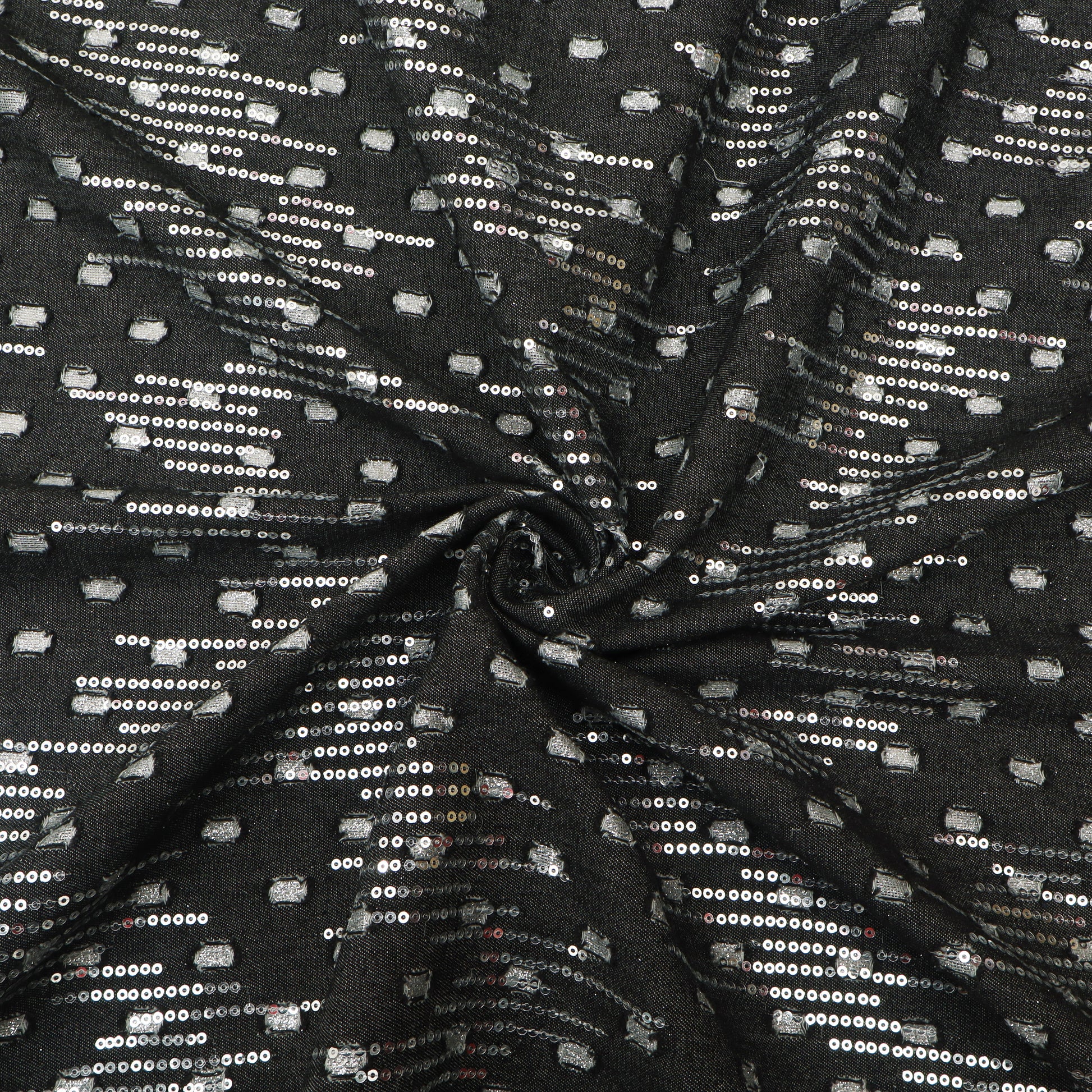Upgrade your festive and partywear collection with this black silver sequin wave embroidered fabric. Designed with elegant curved wave patterns highlighted by shimmering silver sequins, this fabric creates a rich, textured look with a graceful shine.