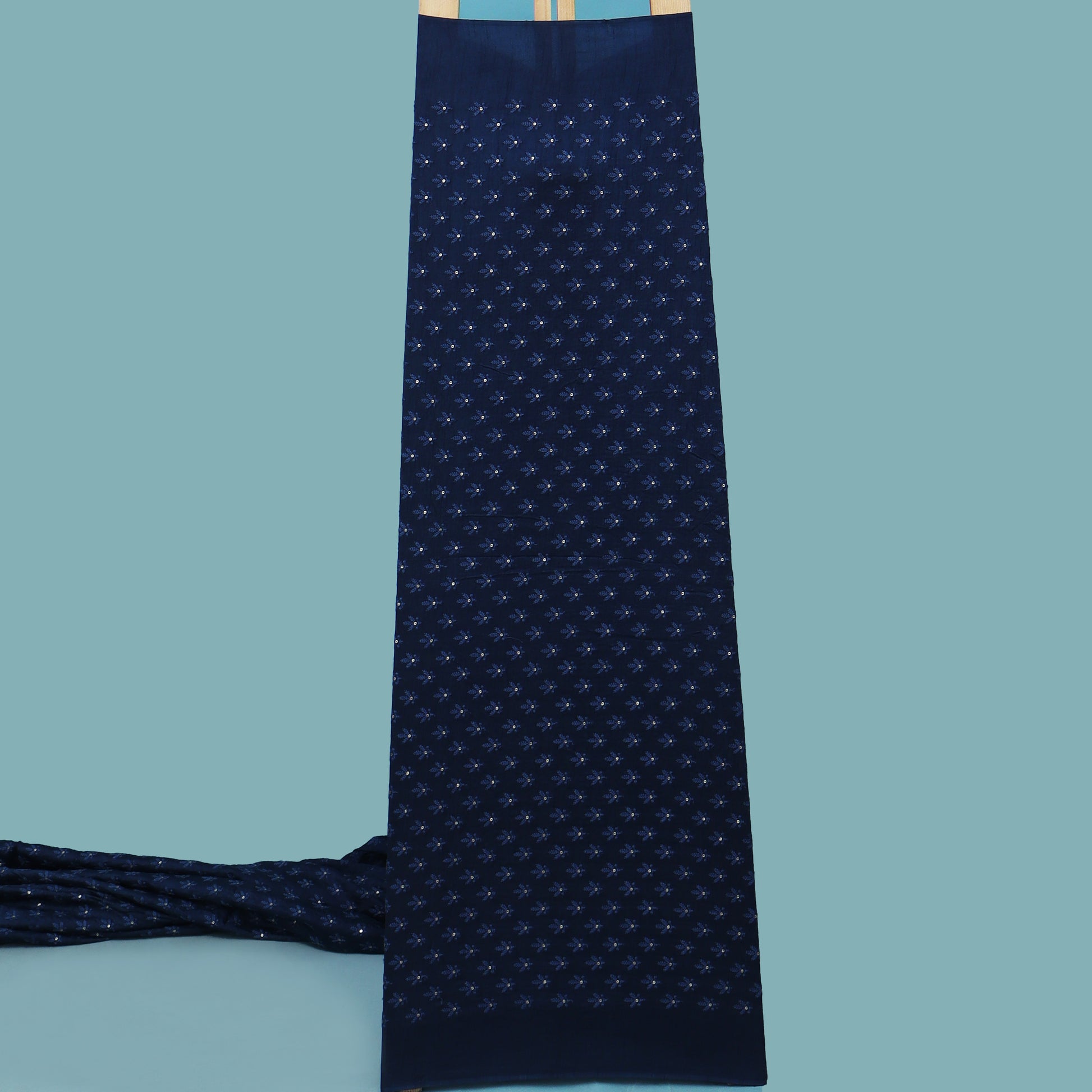 Expertly crafted from high-quality blue color slub silk, this fabric features intricate booti designs for a touch of elegance. Soft and lightweight, it is perfect for creating stunning dresses, blouses, and scarves. Upgrade your wardrobe with this premium fabric that offers both style and comfort.