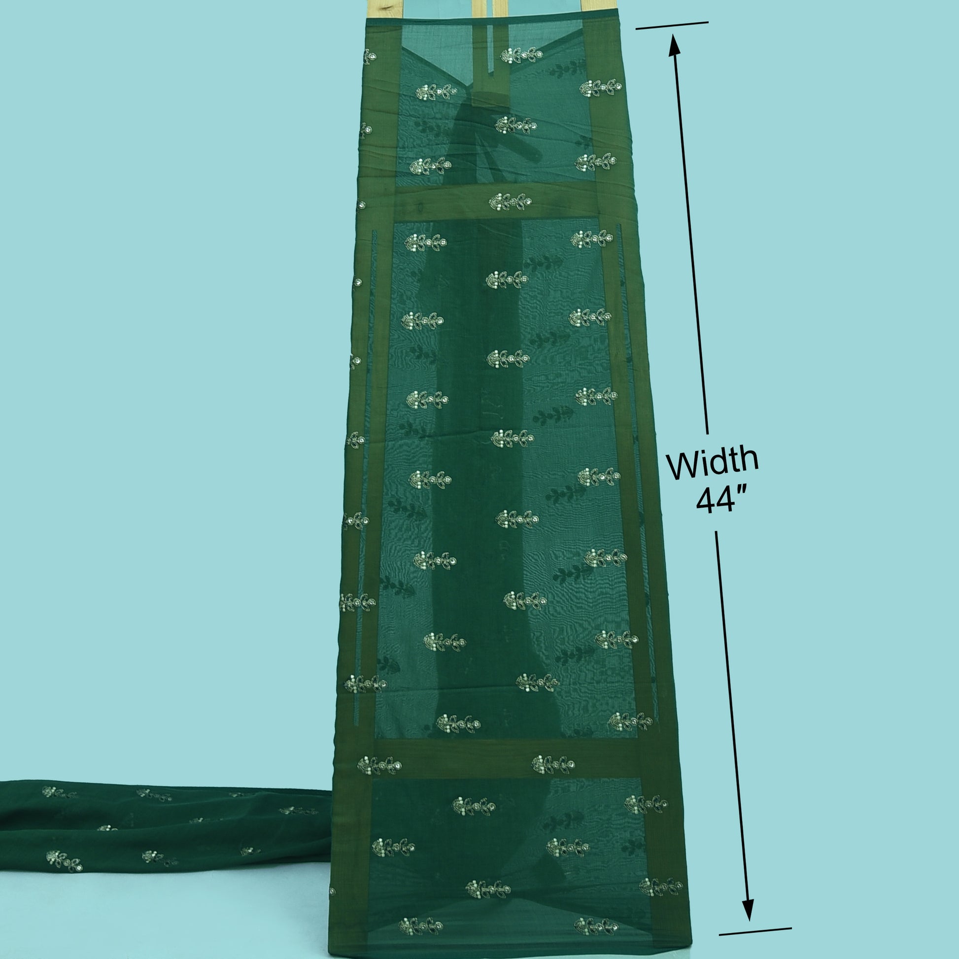 This Bottle Green Color Chanderi Booti Fabric is expertly crafted with rich chanderi material and intricate booti design. Made with beautiful bottle green color, this fabric is perfect for creating elegant and sophisticated garments. Enjoy the high-quality and timeless appeal of this fabric for your next sewing project.