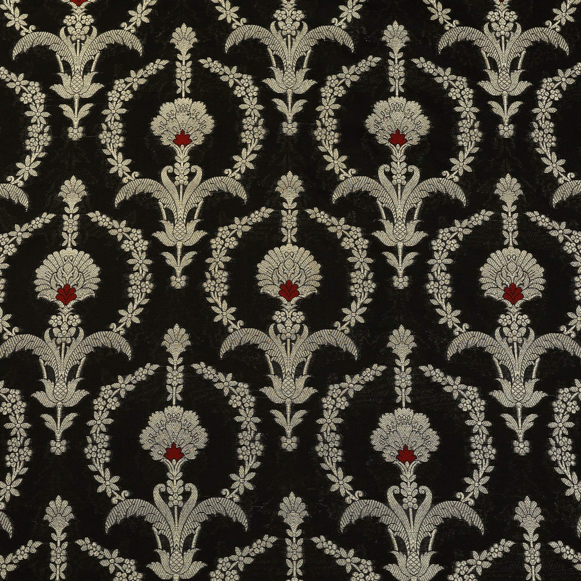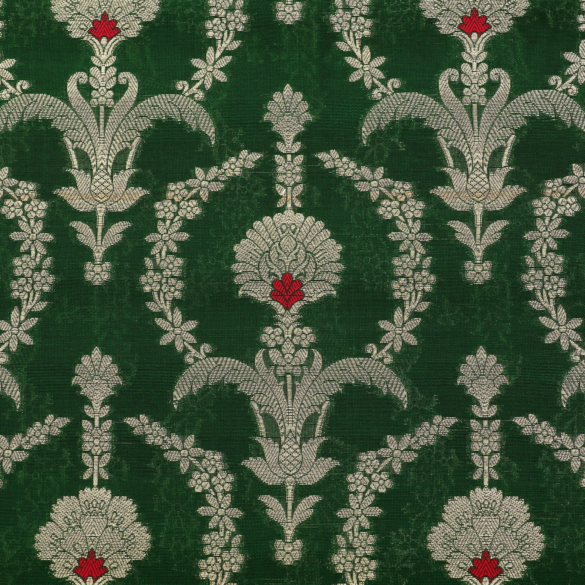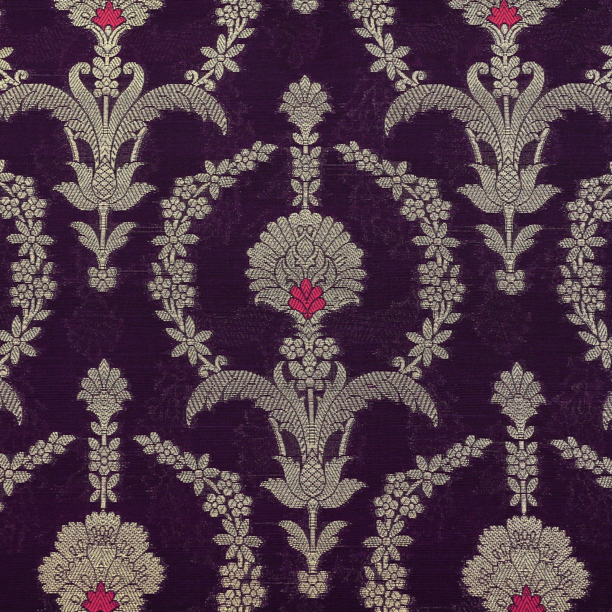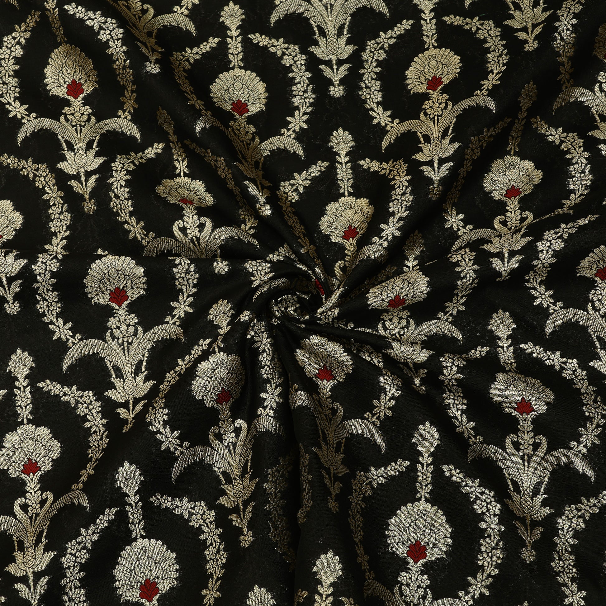 Crafted using refined weaving techniques, this Chinia brocade fabric showcases beautifully developed motifs across a smooth and structured surface. Its luxurious appearance enhances the richness of festive and ceremonial attire.