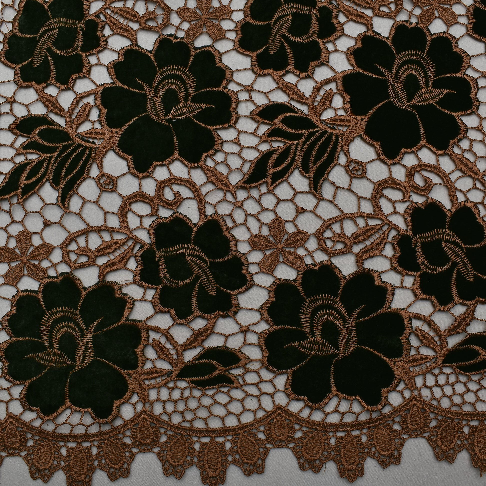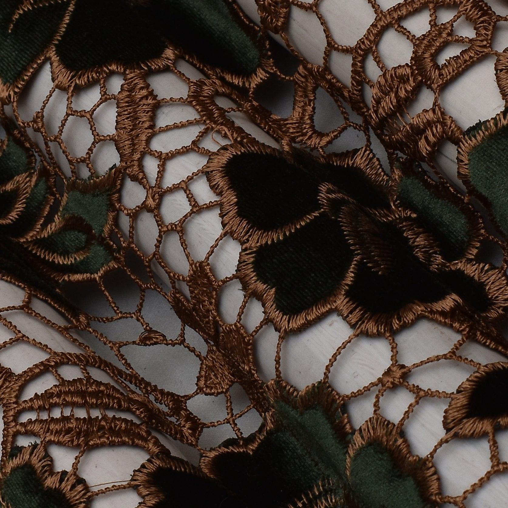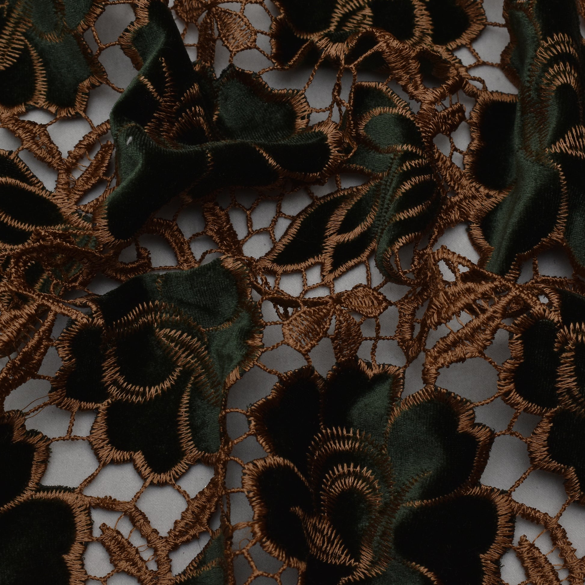 This dark green velvet fabric features intricate cut work for added texture and visual interest. Made from luxurious velvet material, it adds a touch of elegance and sophistication to any project. Perfect for creating high-end garments, accessories, and home decor items. Expertly crafted for quality assurance.