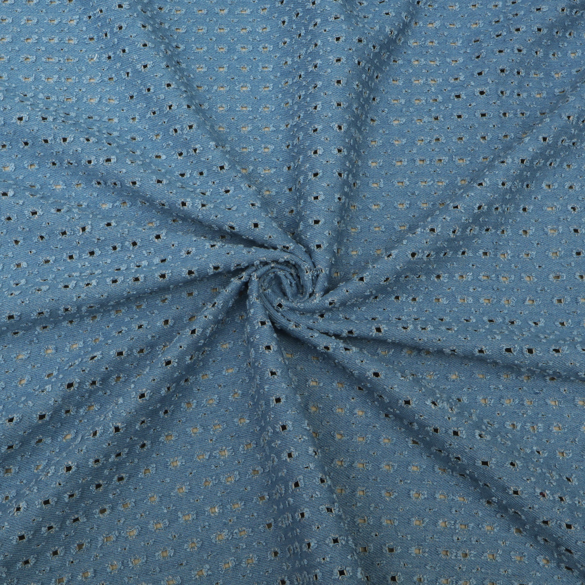 The embroidered motifs add texture, depth, and a handcrafted appeal to the sturdy denim surface, transforming a classic fabric into a fashion-forward statement. Despite its structured base, Denim Embroidery Fabric offers a comfortable drape, making it suitable for both structured and flowy silhouettes.