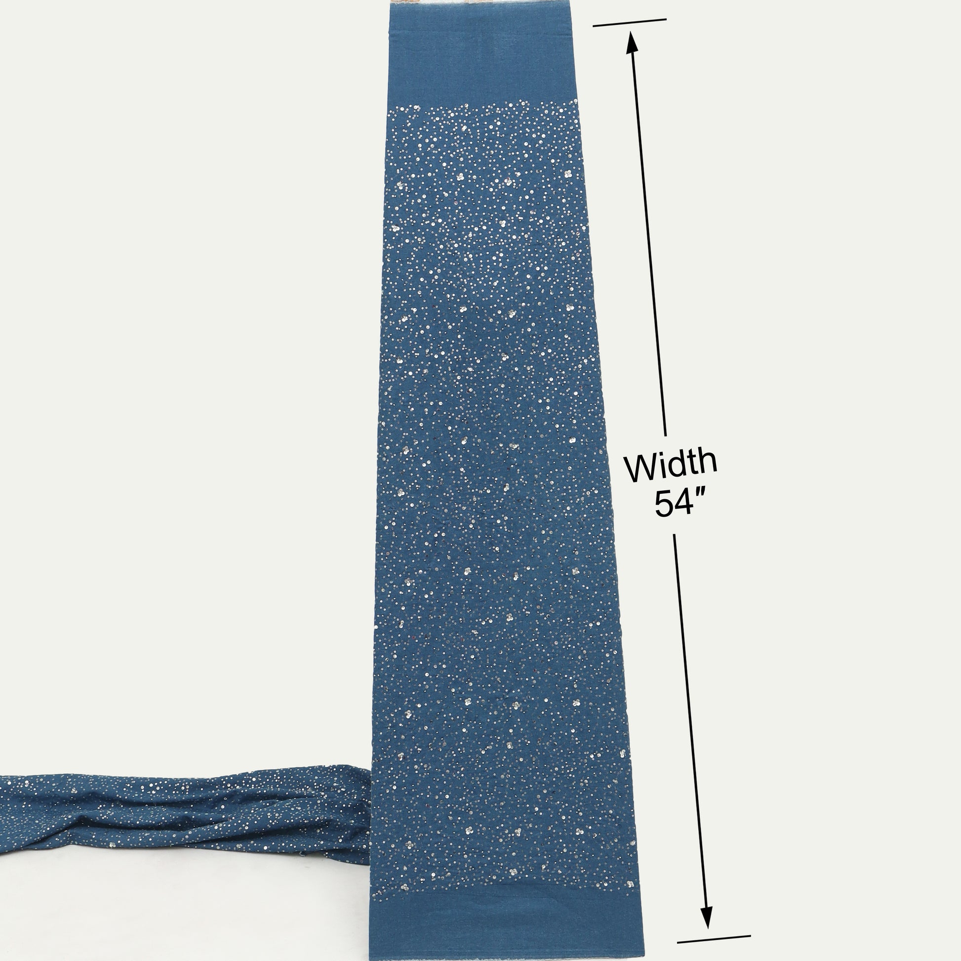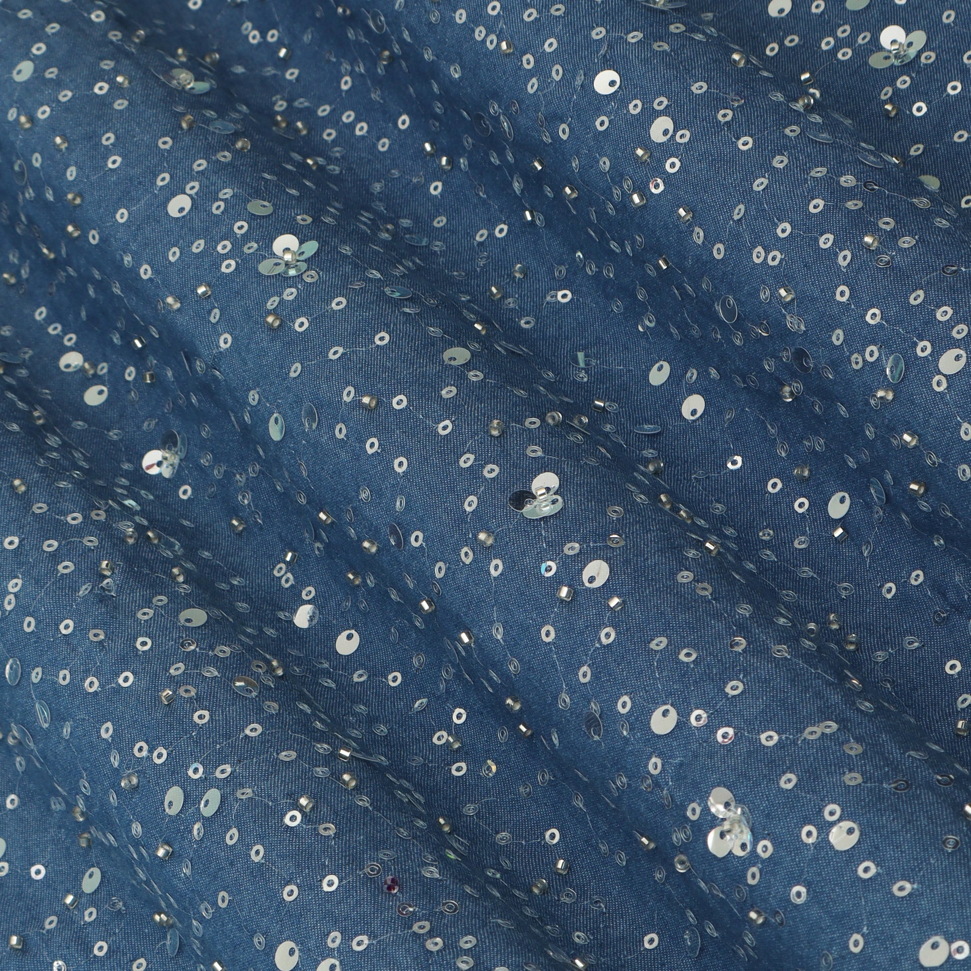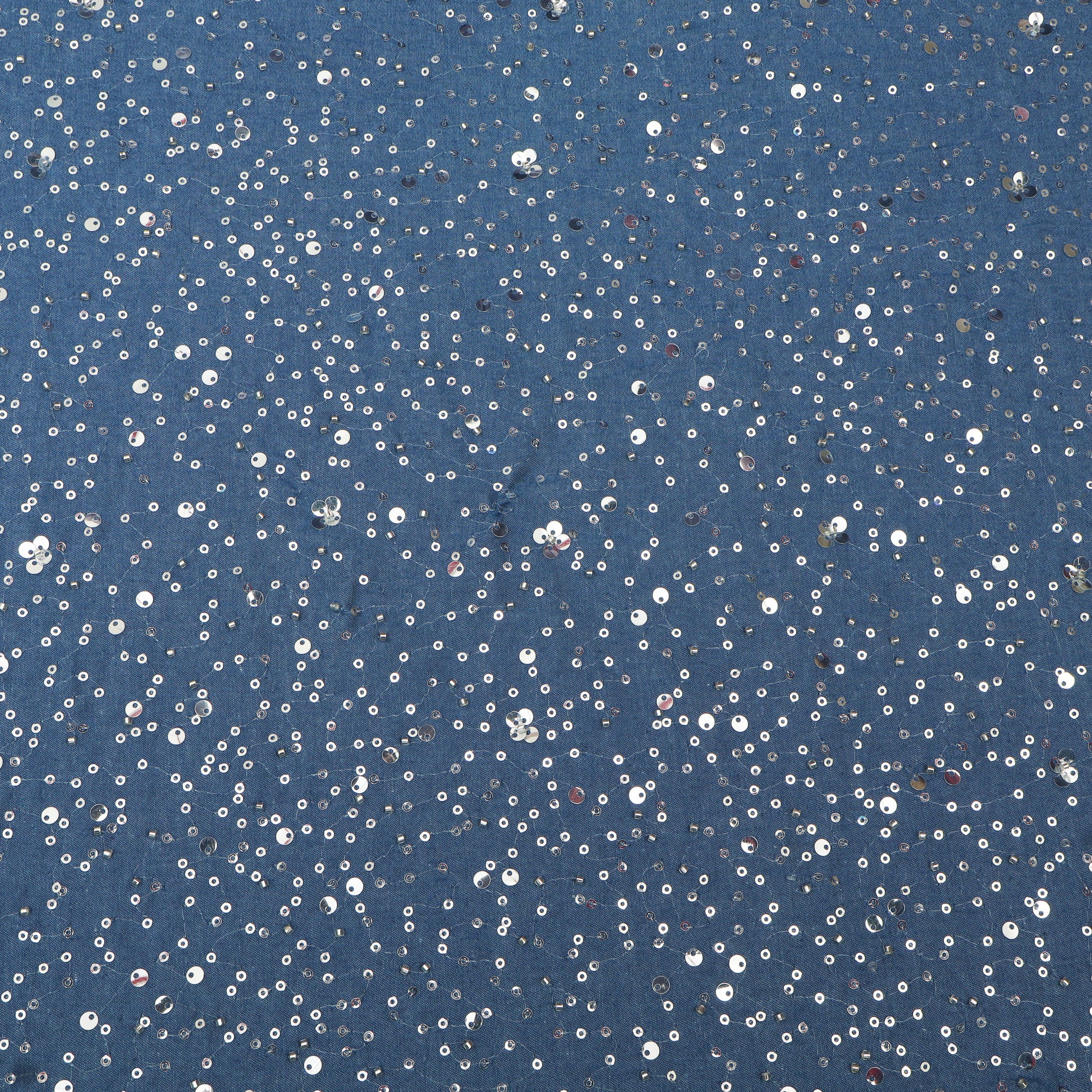 Perfect for dresses, jackets, skirts, coord sets, tops, kurtas, shirts, and contemporary outfits, Denim Sequins Embroidery Fabric is well-suited for festive occasions, parties, and stylish casual looks.
