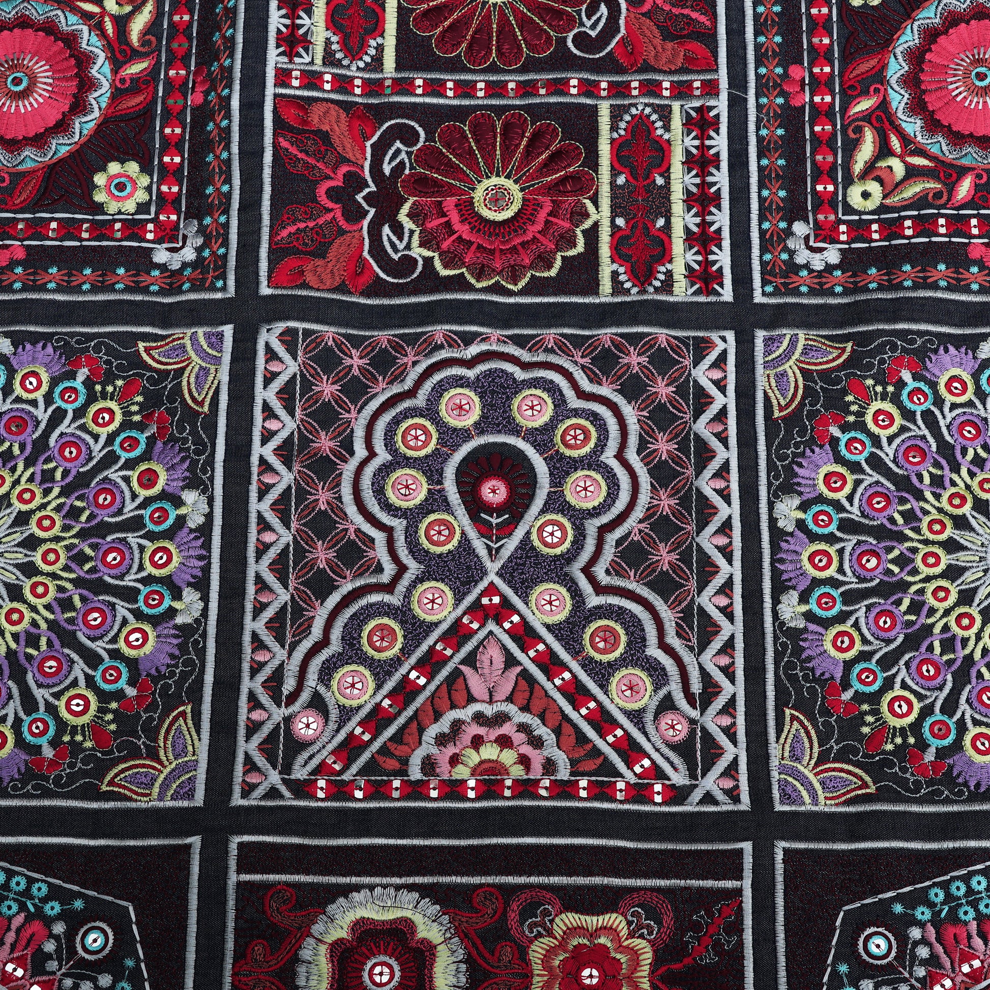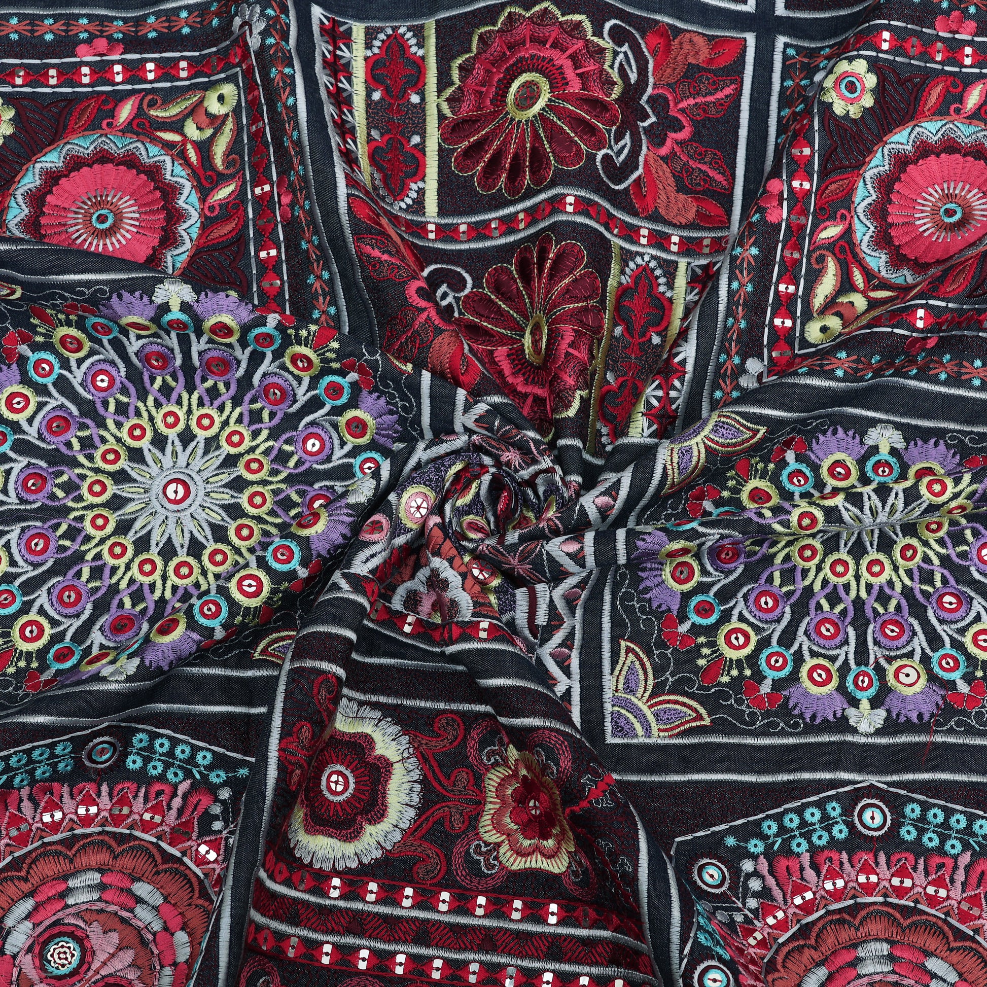 Add a touch of elegance and tradition to your creations with this premium multicolor embroidered Denim fabric. Crafted with intricate floral and ethnic motifs, this fabric features rich thread embroidery on a dark base, creating a bold and luxurious look.