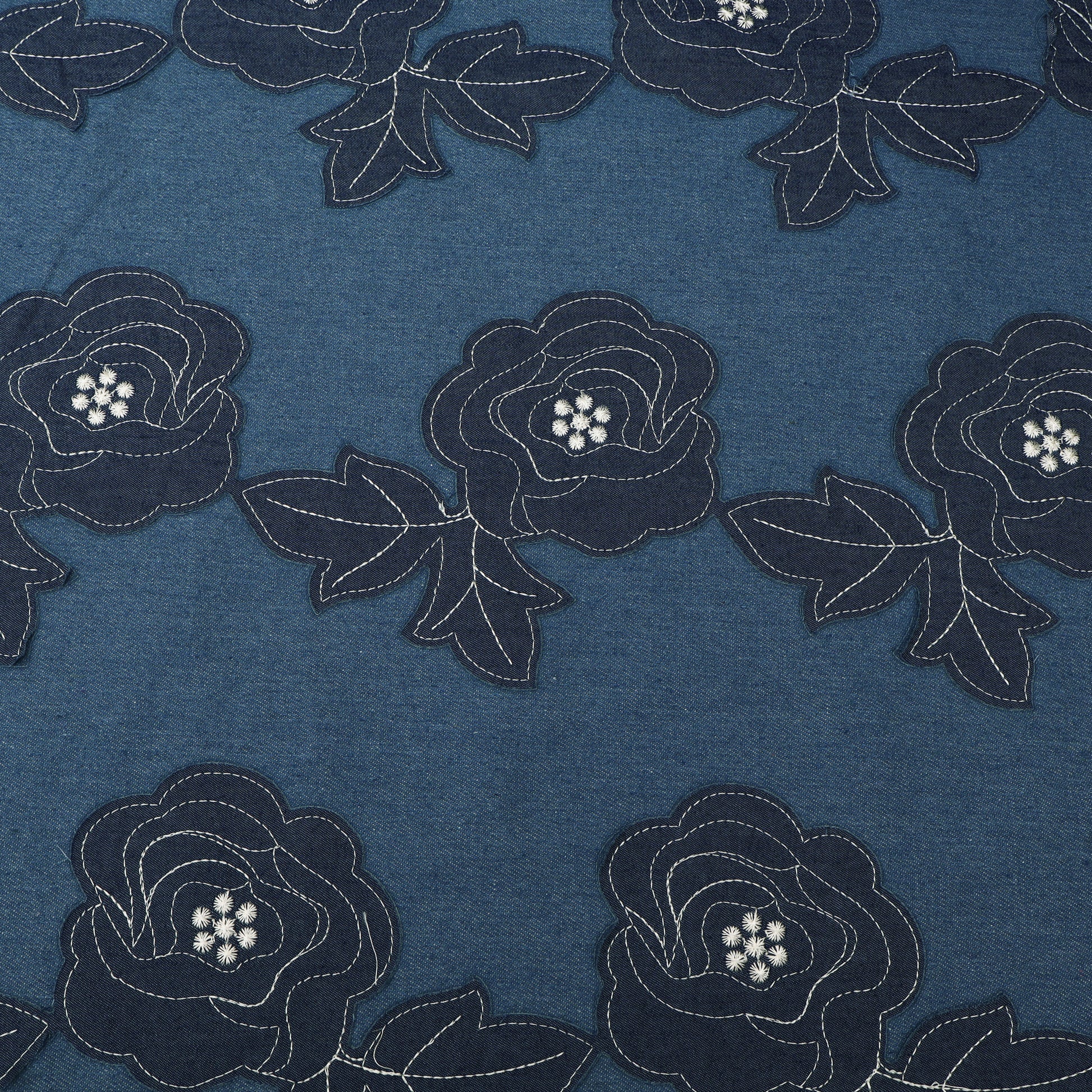 The patch work elements bring a layered, artisanal look to the sturdy denim surface, while the embroidery refines the overall finish with delicate detailing. Structured yet comfortable, this fabric offers a balanced drape, making it suitable for both statement and everyday fusion wear.