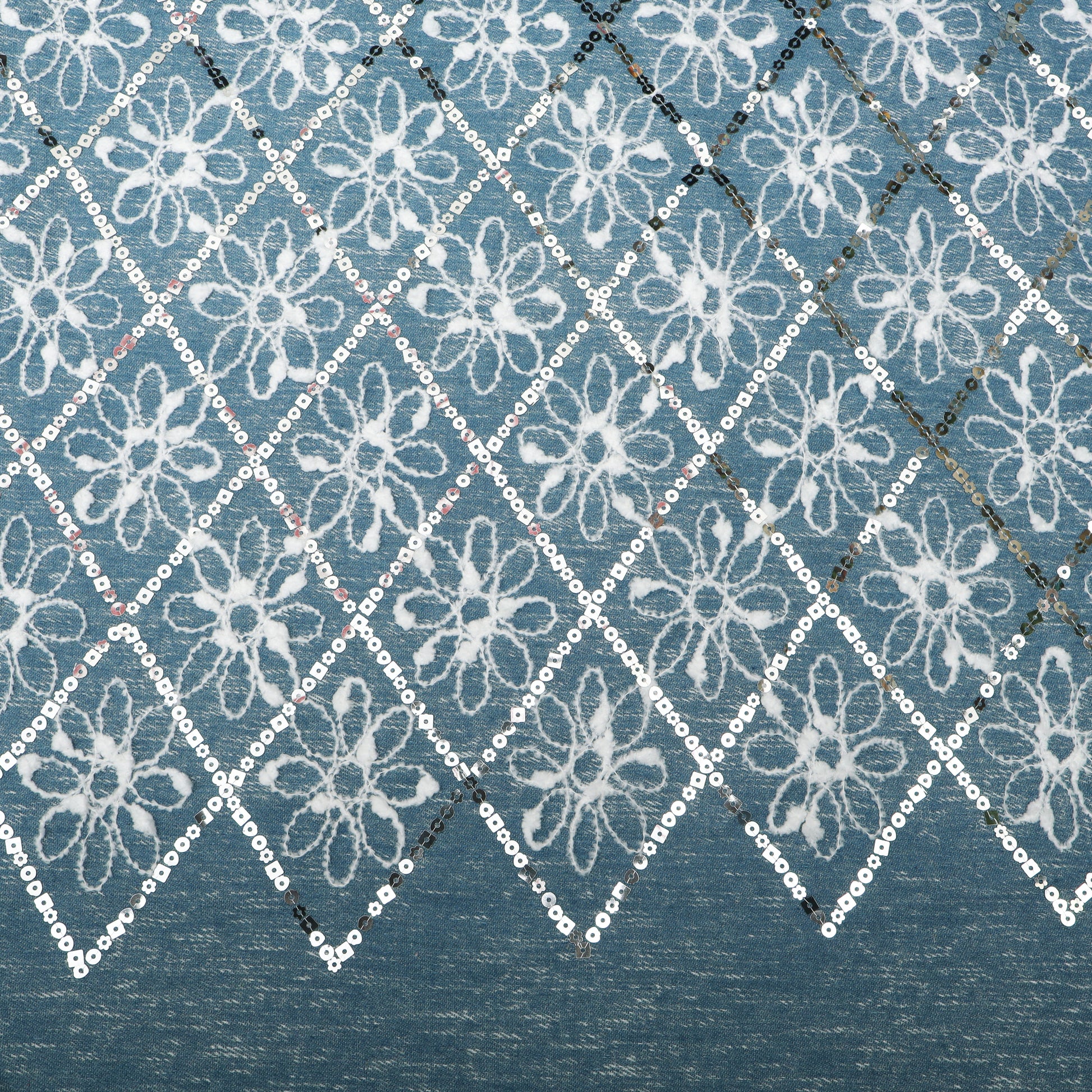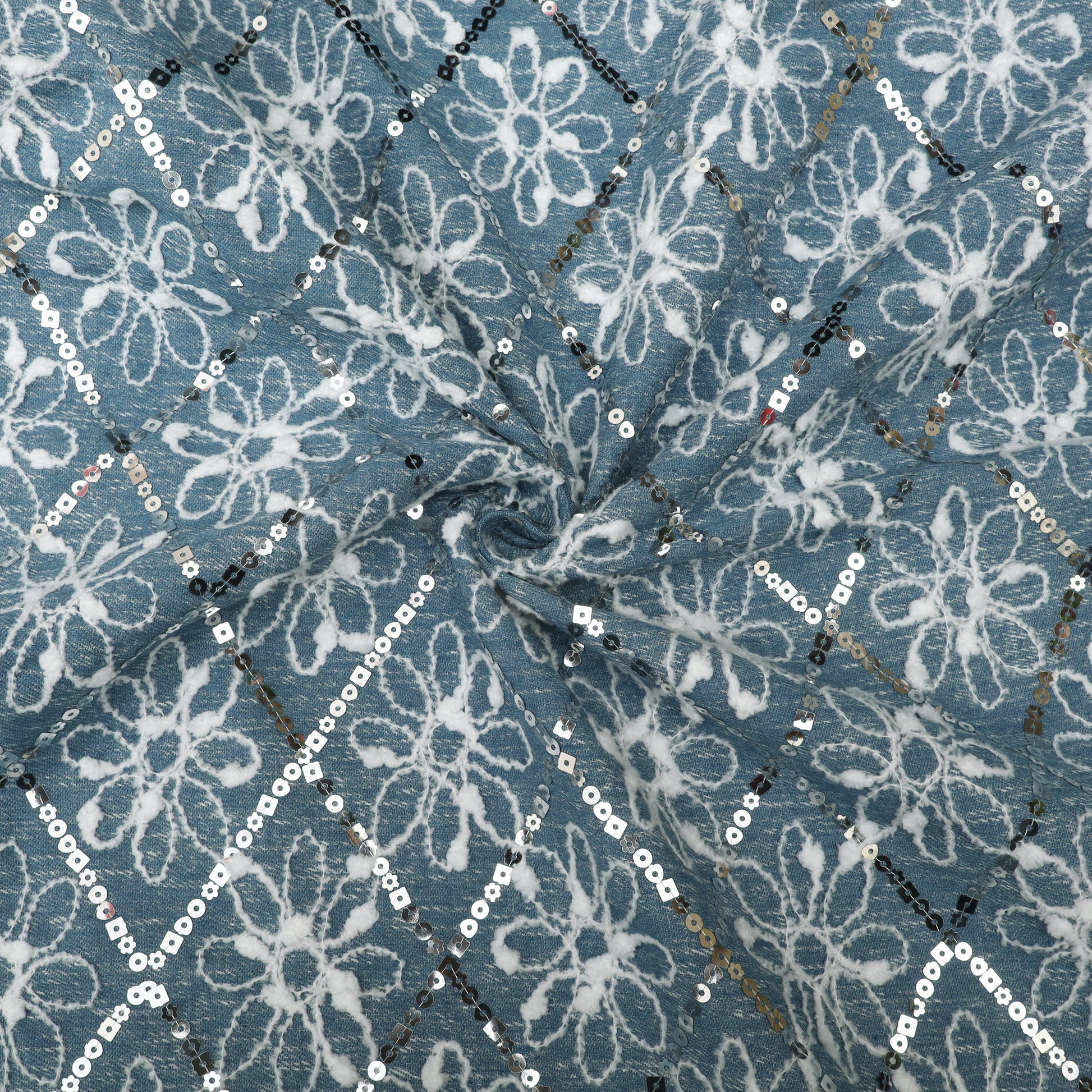Ideal for dresses, jackets, skirts, coord sets, kurtas, tops, and contemporary fusion outfits, Floral Sequins Denim Embroidery Fabric is perfect for festive occasions, parties, and stylish casual looks that demand a touch of glamour.