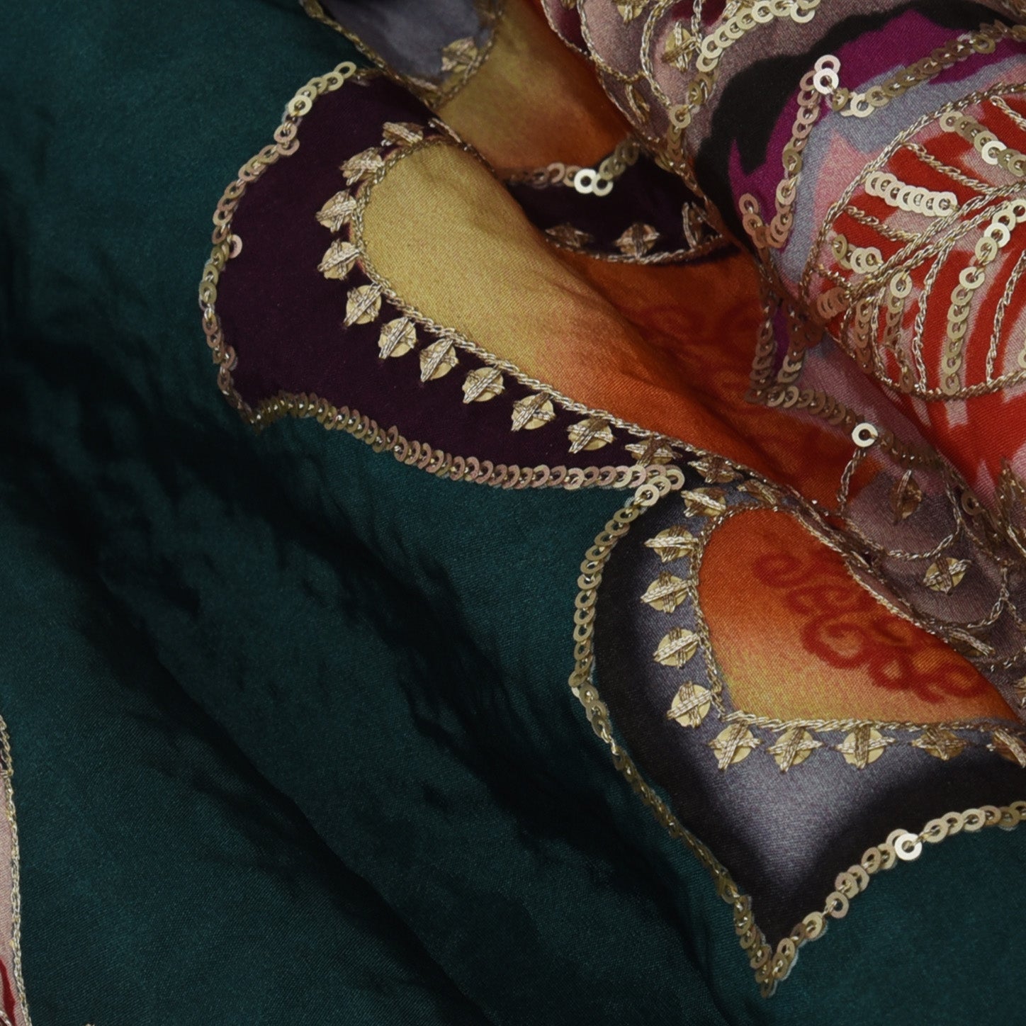 Green Color Crepe Position Print Embroidery Fabric