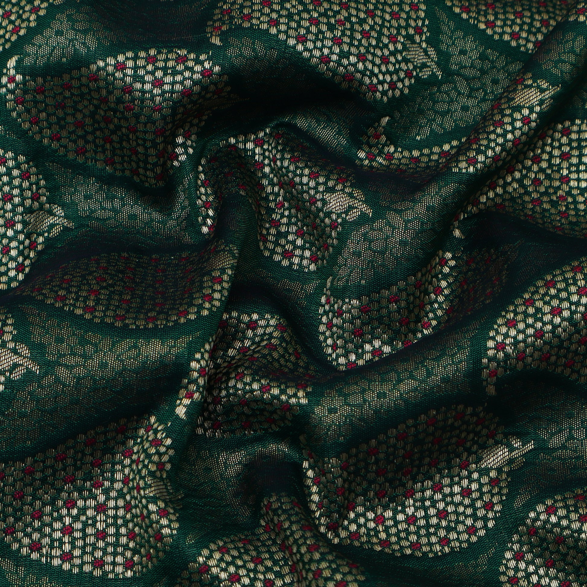 Experience the luxurious feel of our Green Color Katan Meena Brocade Fabric. Made from high quality materials, this fabric offers a smooth and elegant texture. Its vibrant green color adds a touch of opulence to any project. Elevate your wardrobe or home decor with this stunning fabric.