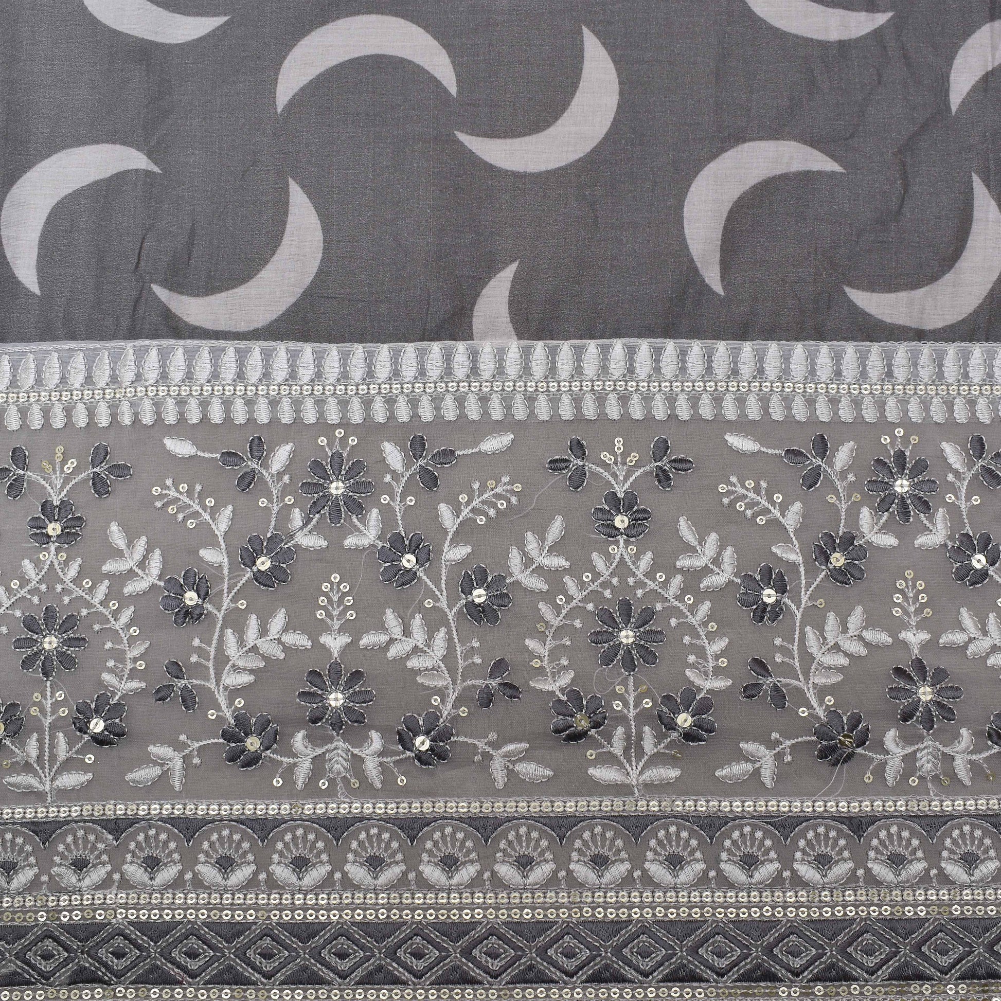 Grey Color Mulmul Print Border Embroidery Fabric