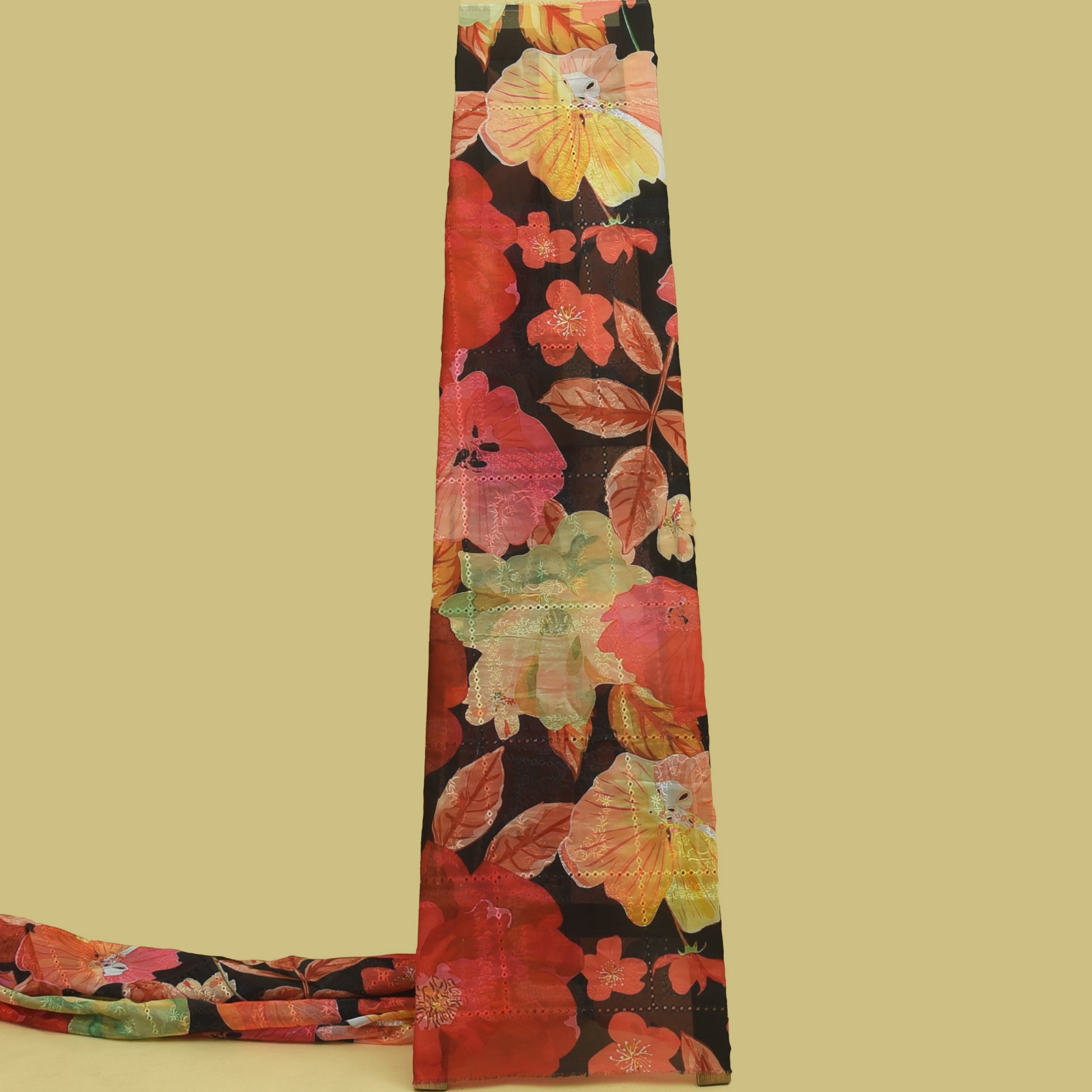 Introducing our Multicolor Organza Print Embroidery Fabric - the perfect fabric for adding a touch of elegance and sophistication to any project. Featuring beautiful multicolor print and delicate embroidery, this fabric is sure to impress. Made from high quality organza material, it offers a lightweight, airy feel while still providing durability and strength. Elevate your creations with this stunning fabric today.