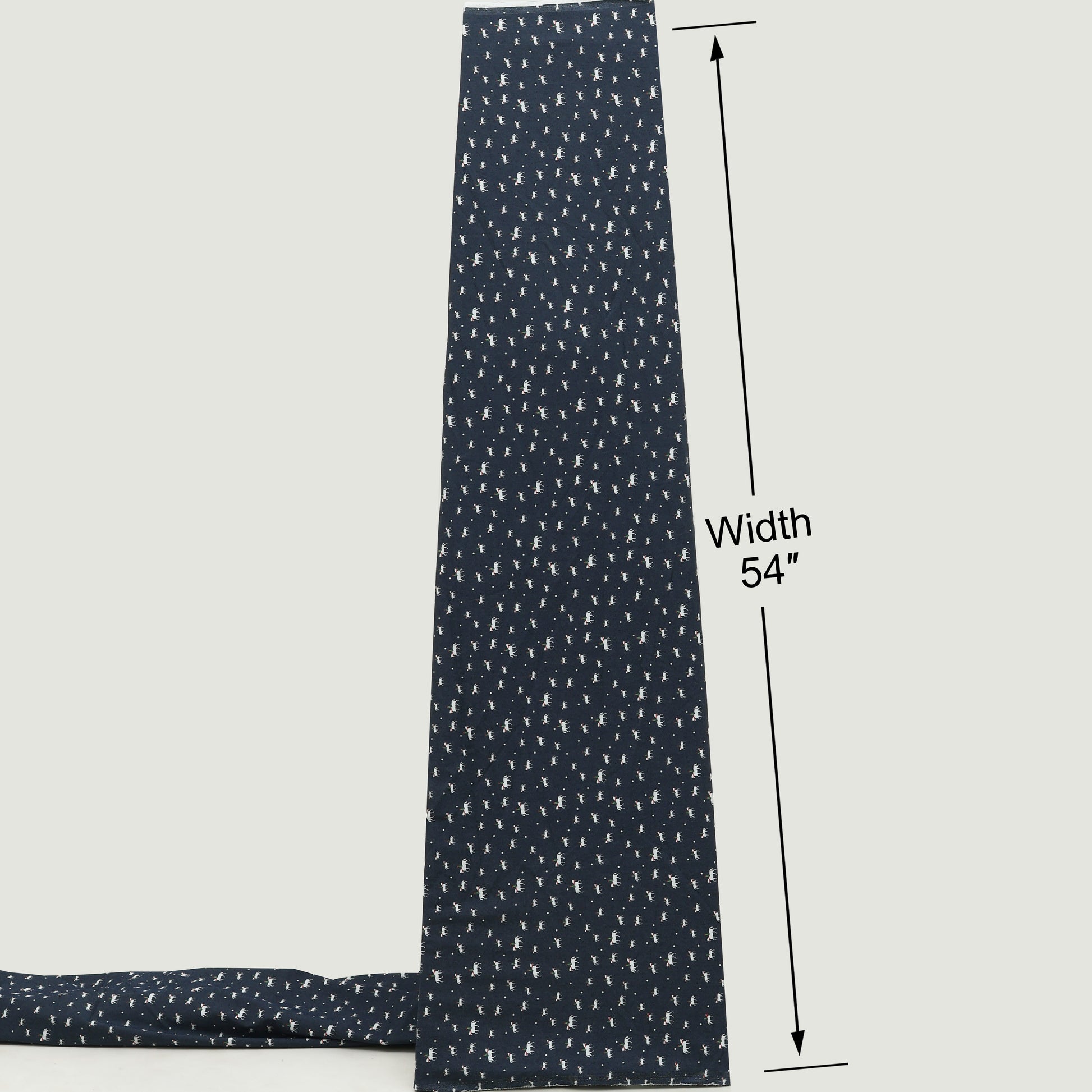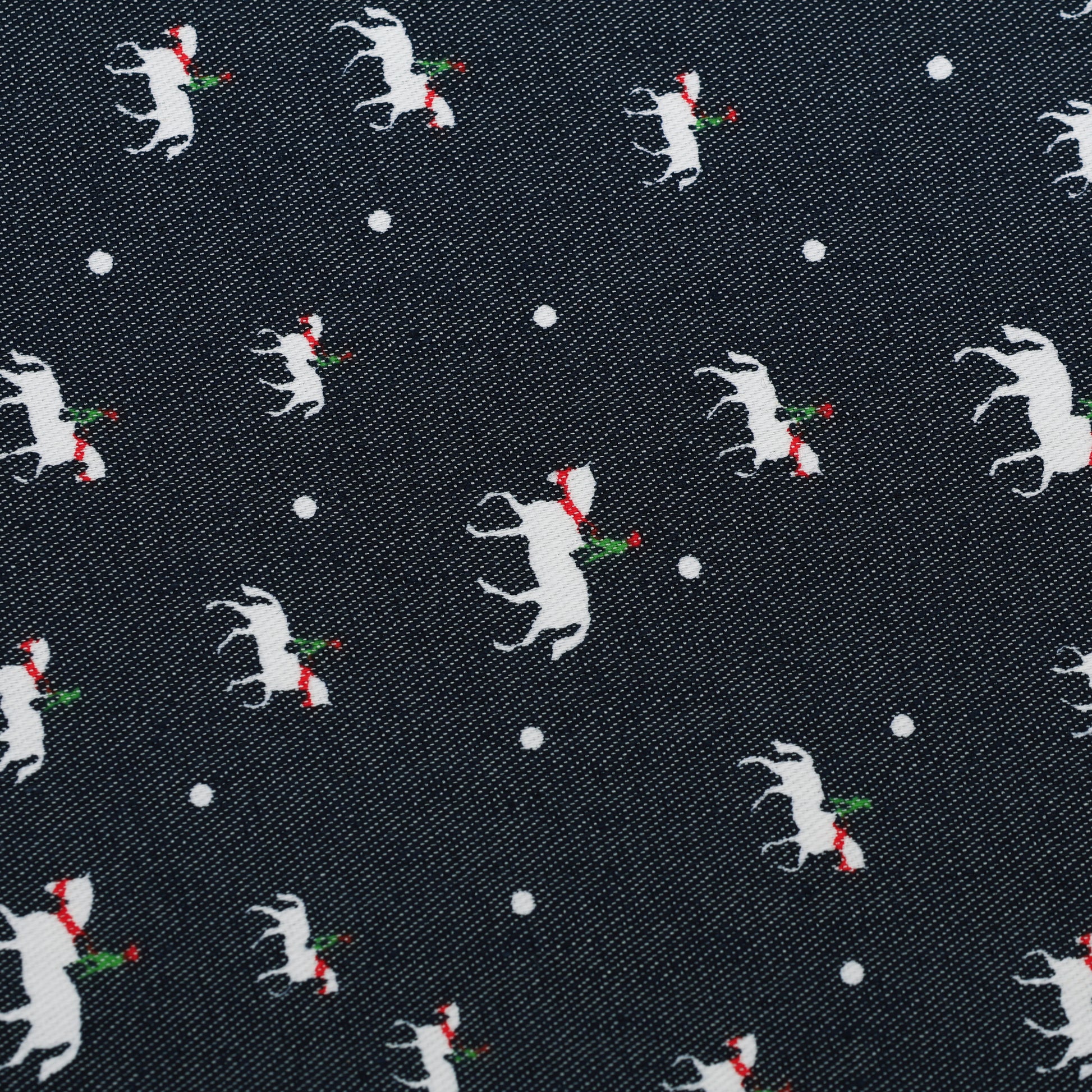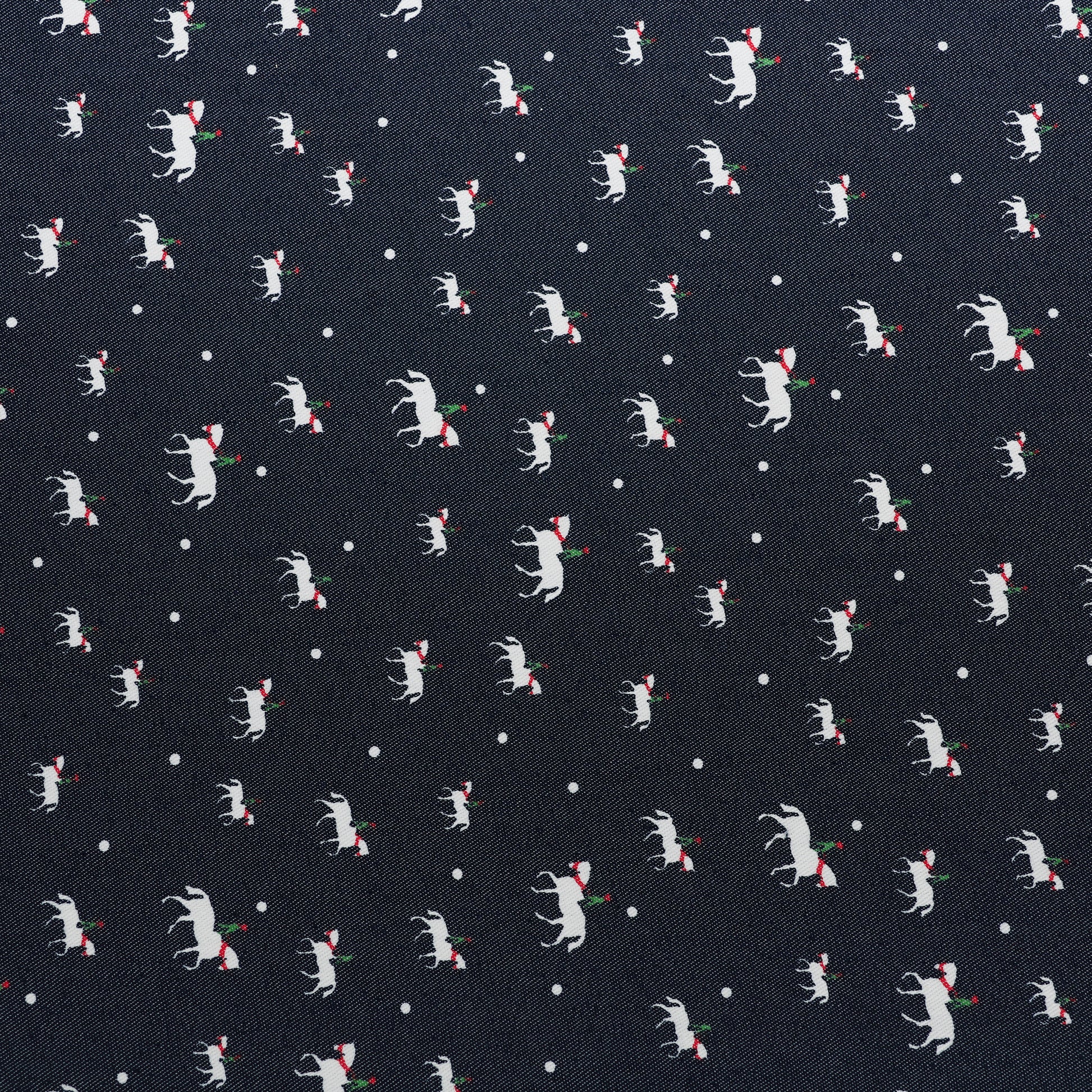 Add a fun and stylish touch to your collection with this navy blue animal printed Denim fabric. Featuring a charming all-over white animal motif with subtle red and green accents on a deep navy base, this fabric offers a playful yet classy look.