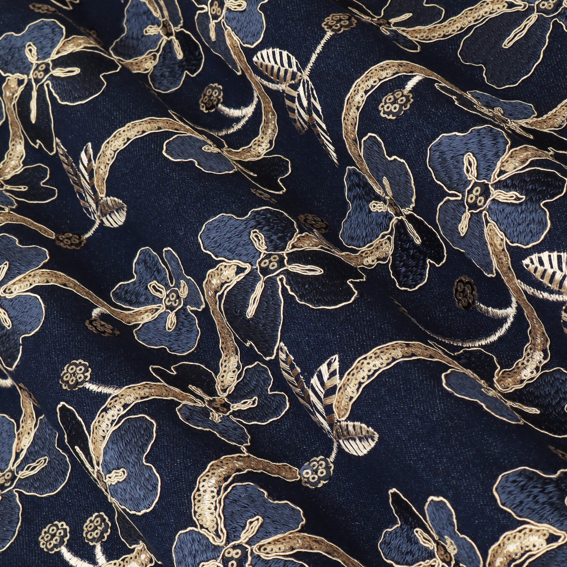 Elevate your designer collection with this navy blue floral Denim fabric, beautifully detailed with antique gold thread and tonal blue embroidery. The fabric showcases elegant floral motifs with flowing vine patterns, combining matte thread work with subtle textured highlights for a refined, luxurious finish.