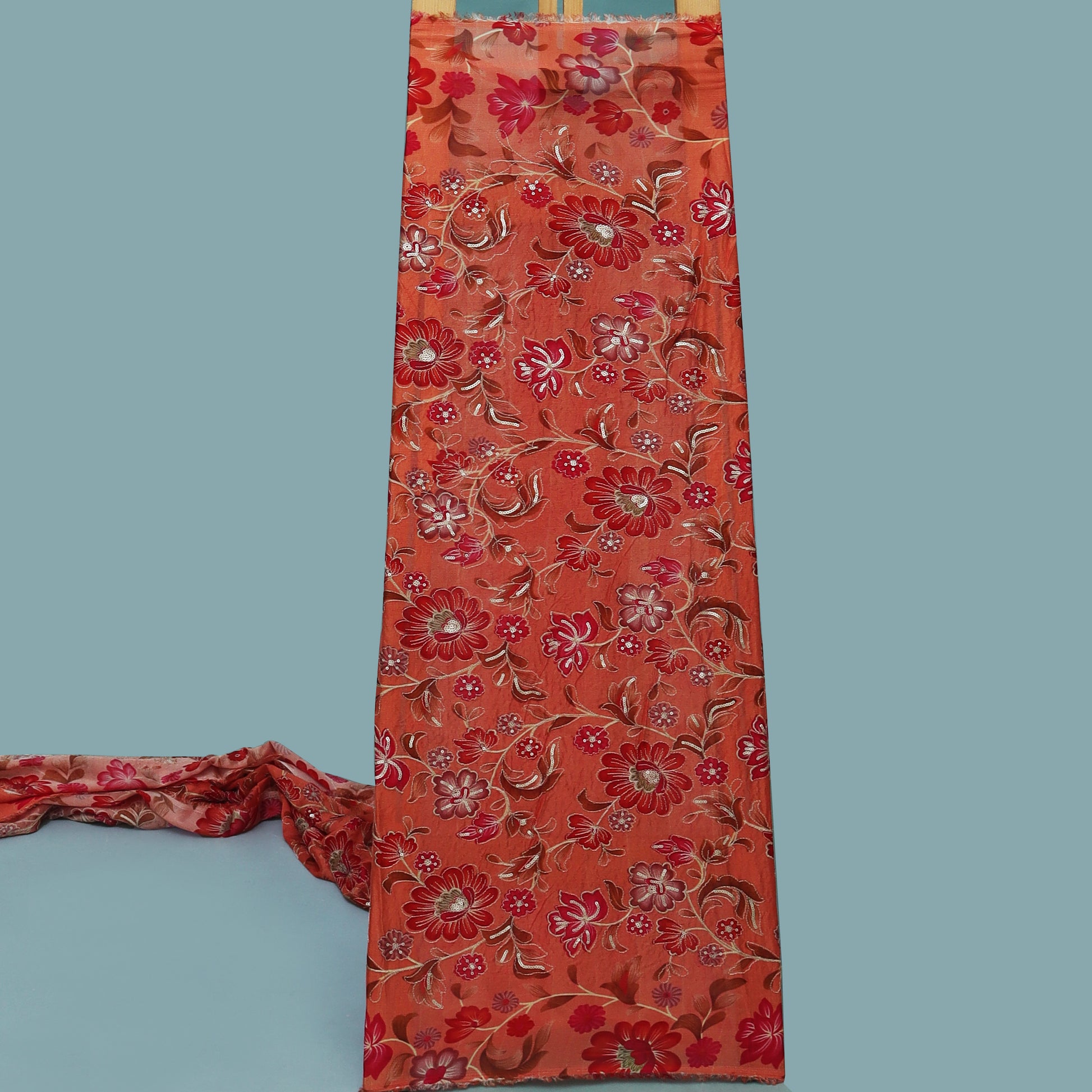 This Peach Color Chinon Position Print Embroidery Fabric is an exquisite choice for any fashion project. With its unique position print and delicate embroidery, it adds a touch of elegance and sophistication. Made from high-quality Chinon fabric, it provides comfort and durability along with a stunning appearance.