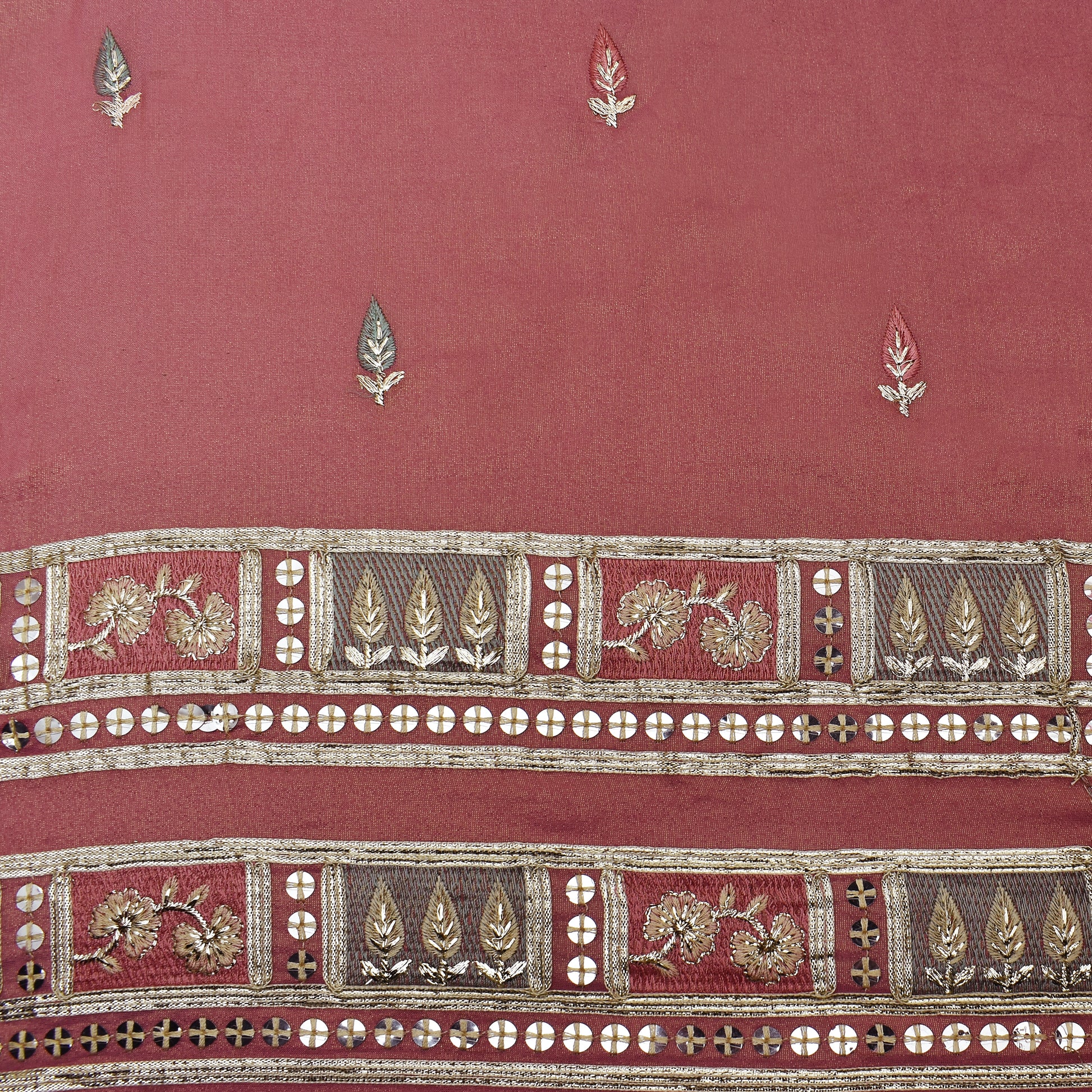 Made from delicate tissue fabric and accented with intricate booti embroidery, this pink fabric is perfect for creating elegant and feminine clothing and home décor. The lightweight and sheer material adds a touch of delicate sophistication.