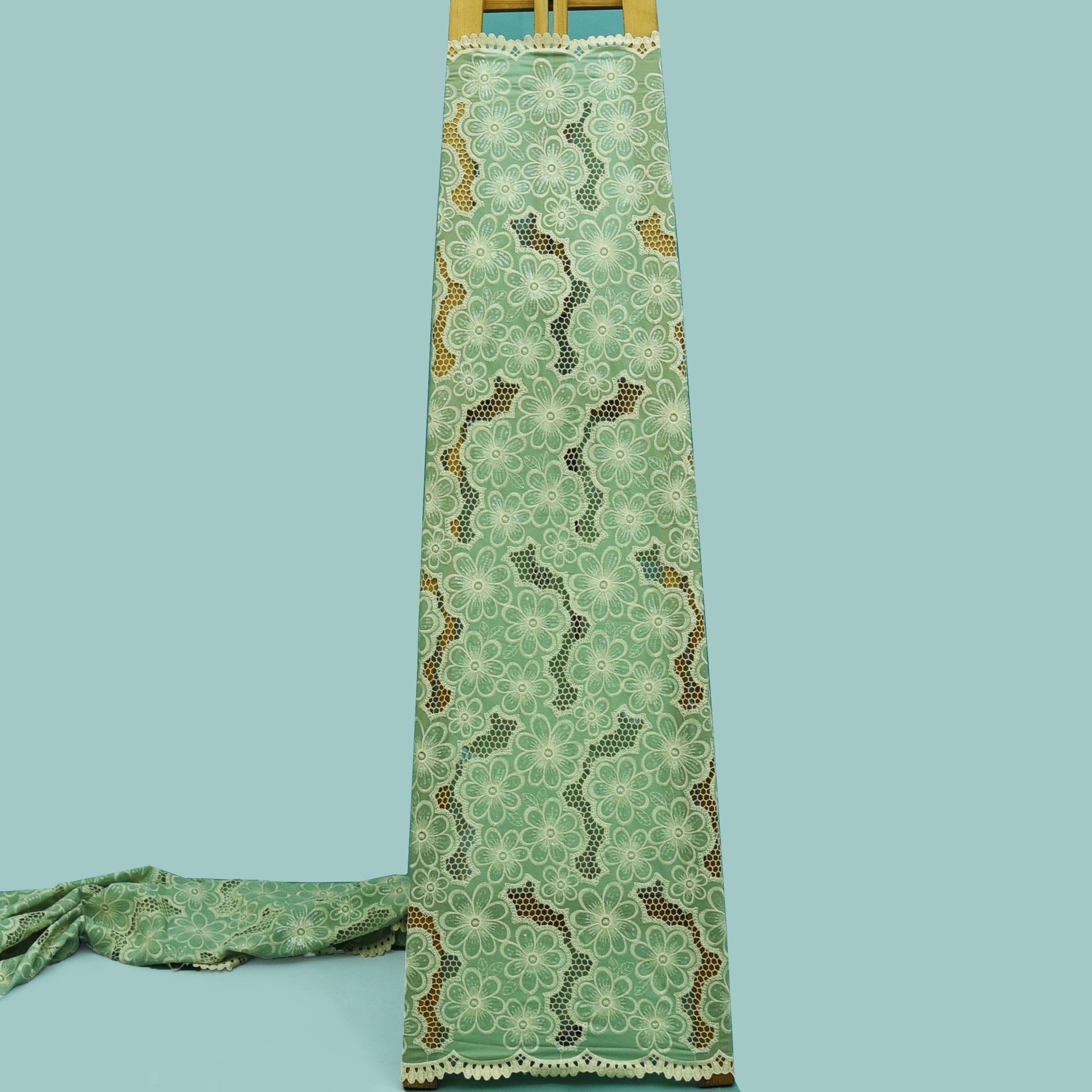 This Pista Green crepe embroidery fabric is perfect for creating stylish and elegant garments. Made from high-quality material, this fabric offers a smooth and comfortable feel. The intricate embroidery adds a delicate touch to any project. Elevate your creations with this beautiful fabric.