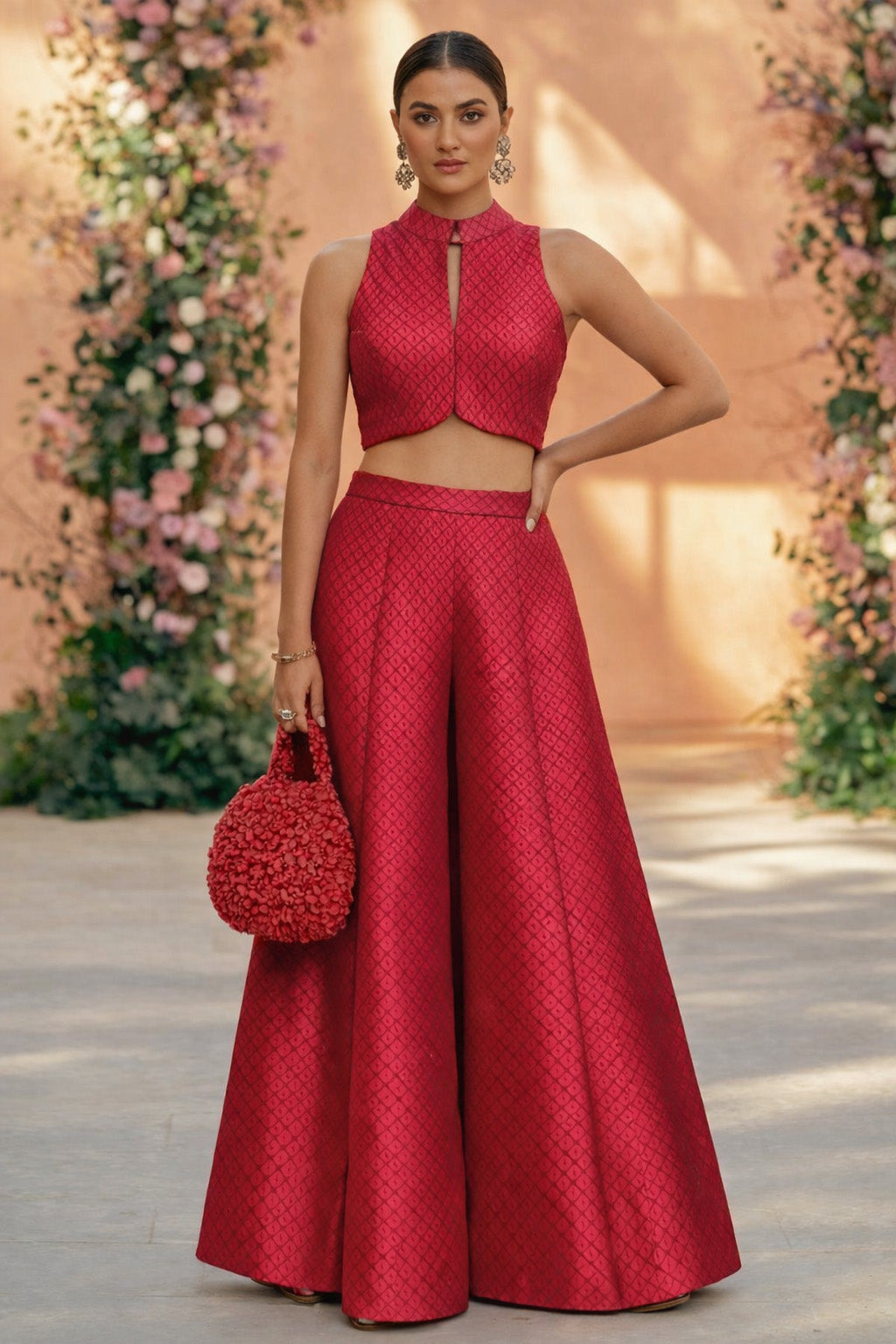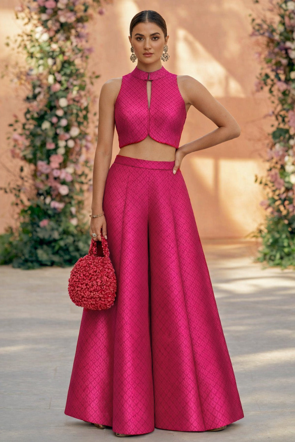 The brocade motifs are finely woven into the dupion base, creating a luxurious surface that looks regal yet refined. Its structured fall makes it ideal for silhouettes that require shape and definition, while the silk base ensures comfort and durability.