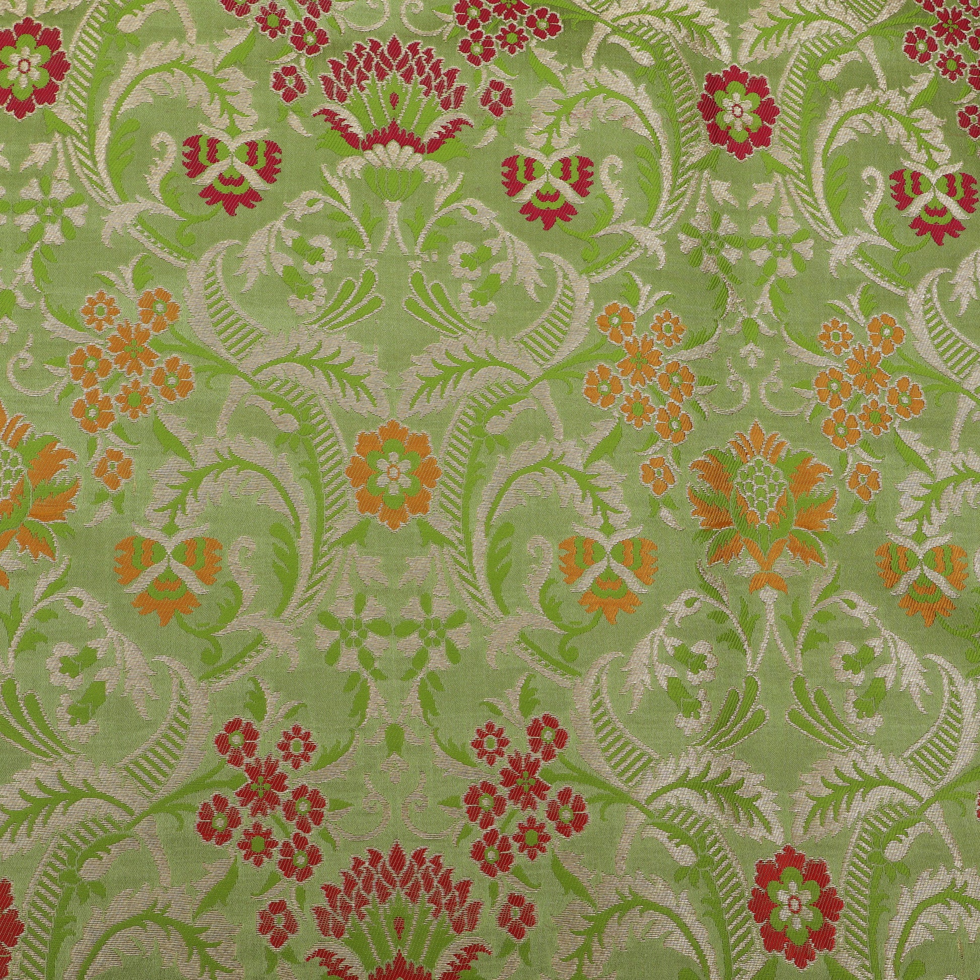 Heavier and more structured than most brocades, Pure Kimkhab Brocade offers a majestic fall and a richly embossed surface, making it ideal for statement creations. The elaborate zari work dominates the fabric, creating a bold, luxurious look that instantly elevates any ensemble.