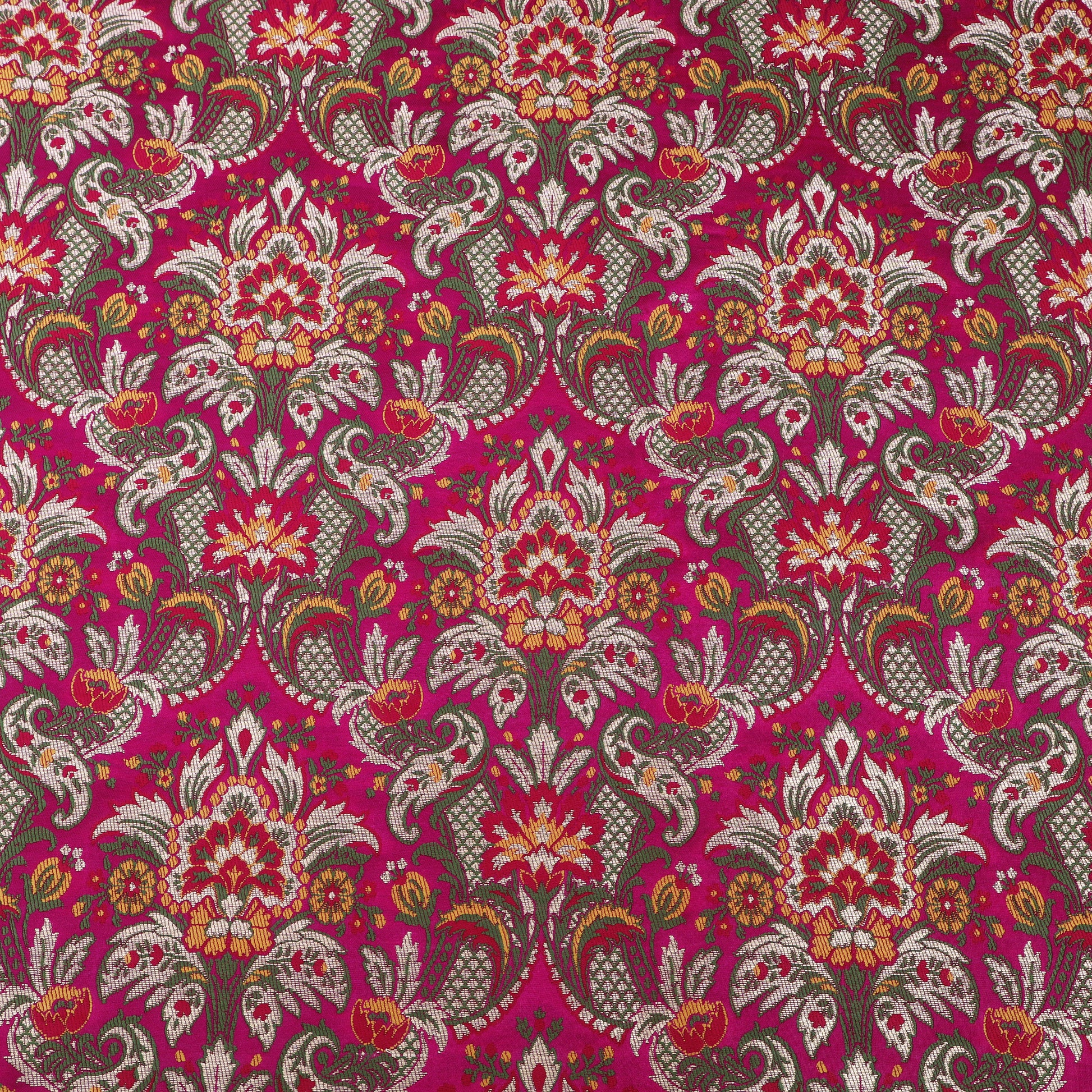 Heavier and more structured than most brocades, Pure Kimkhab Brocade offers a majestic fall and a richly embossed surface, making it ideal for statement creations. The elaborate zari work dominates the fabric, creating a bold, luxurious look that instantly elevates any ensemble.