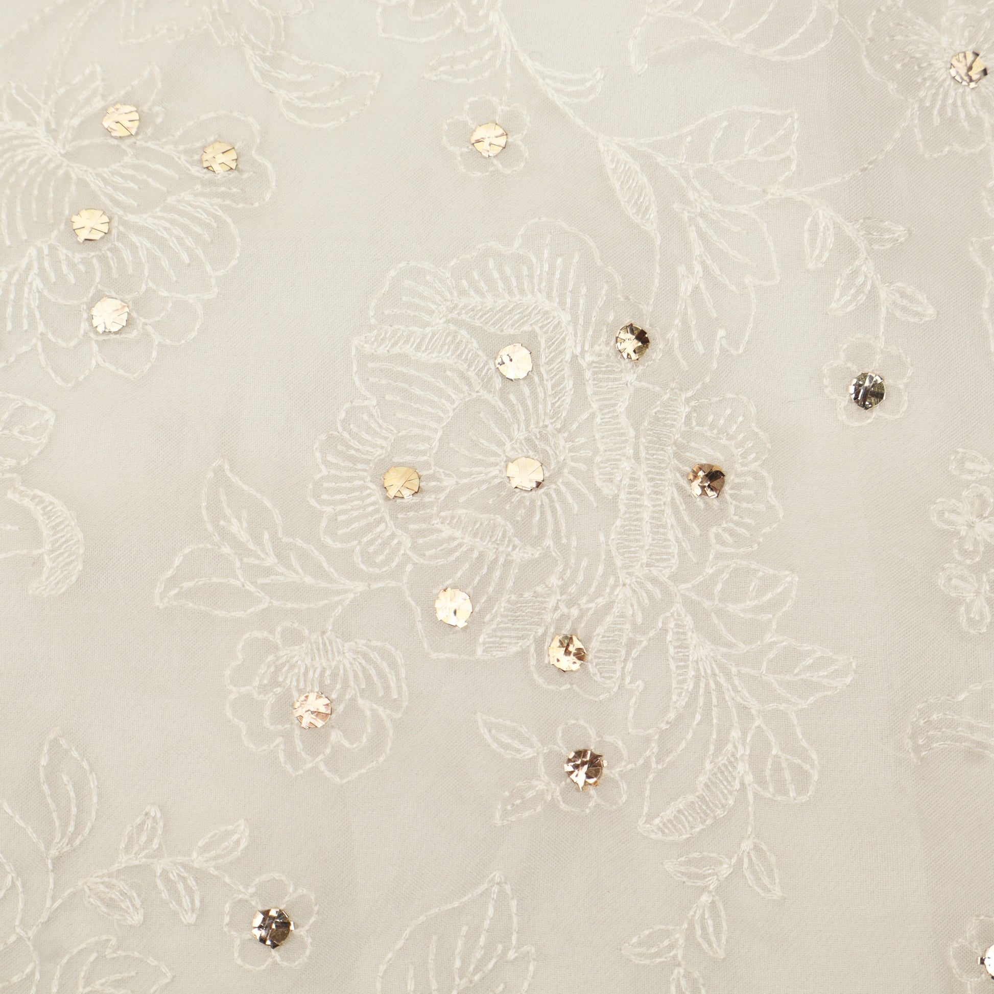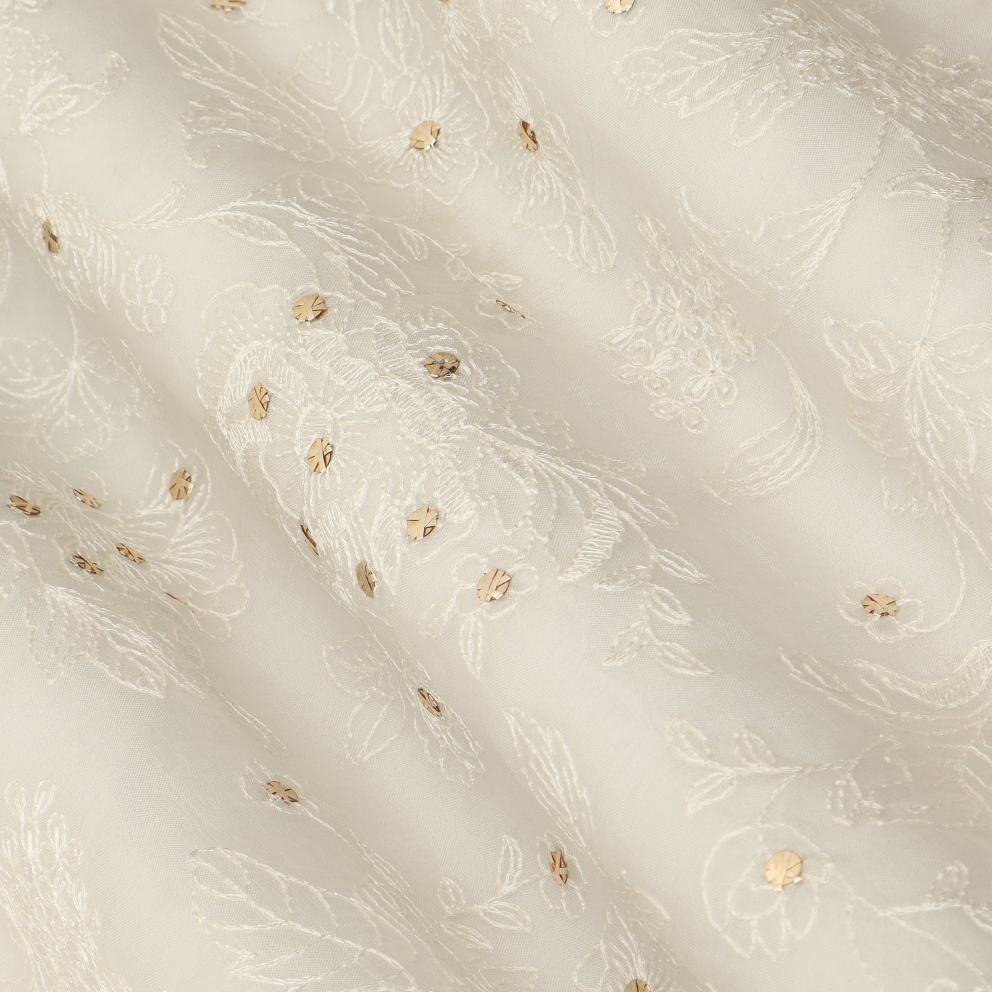 The fine embroidery enhances the beauty of organza without weighing it down, making it perfect for layered silhouettes and statement garments. Available in White rich pastel variants, this fabric is ideal for designers, boutiques, and premium occasion wear collections.