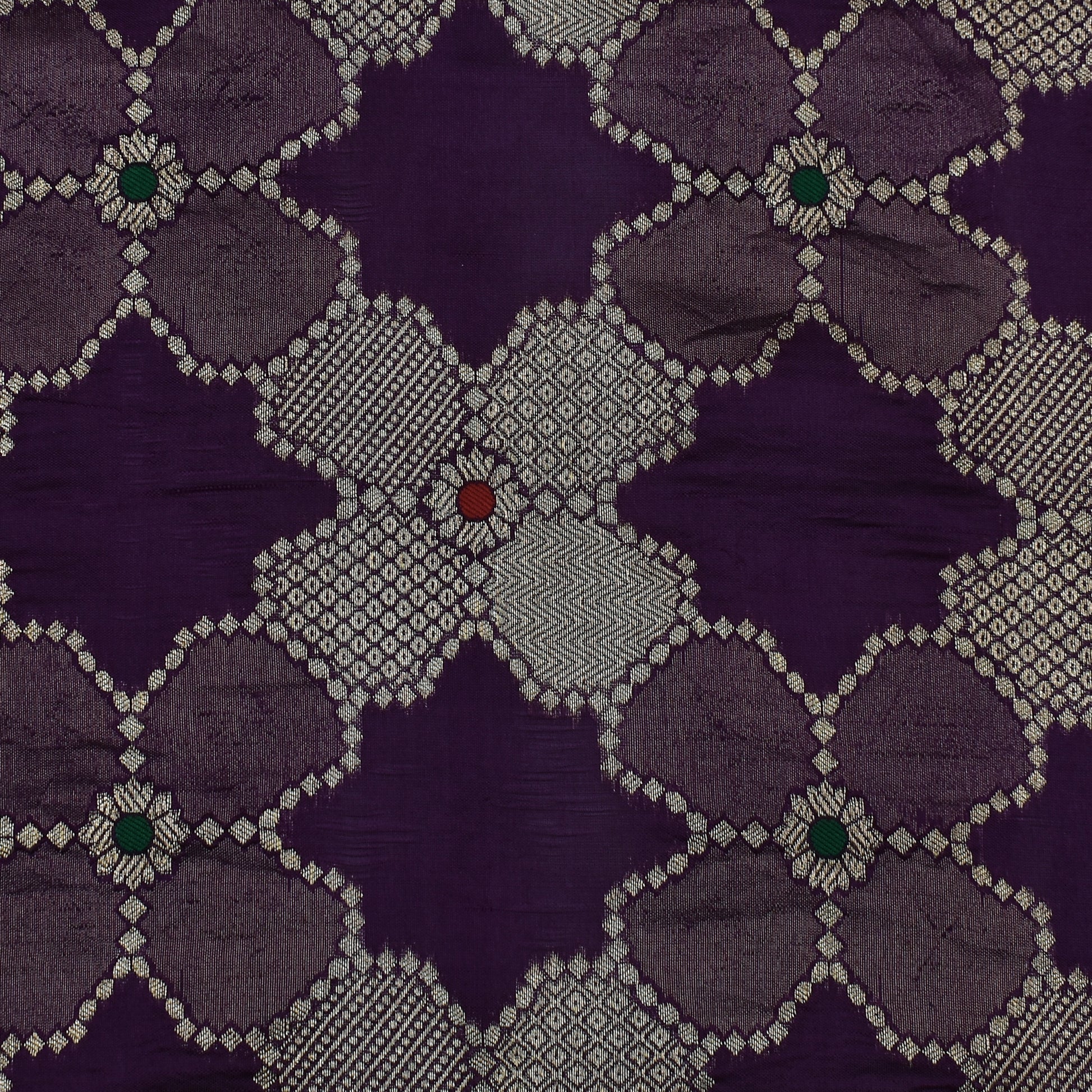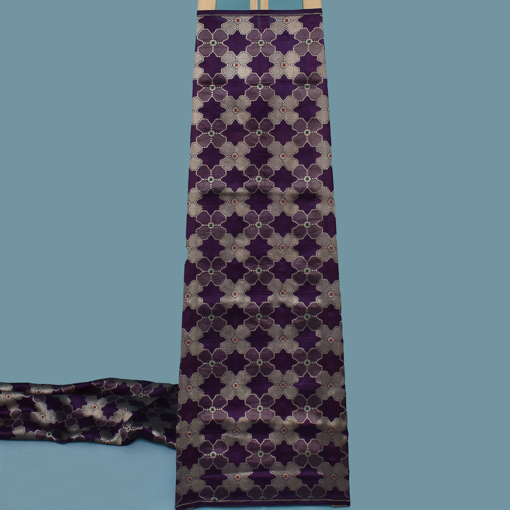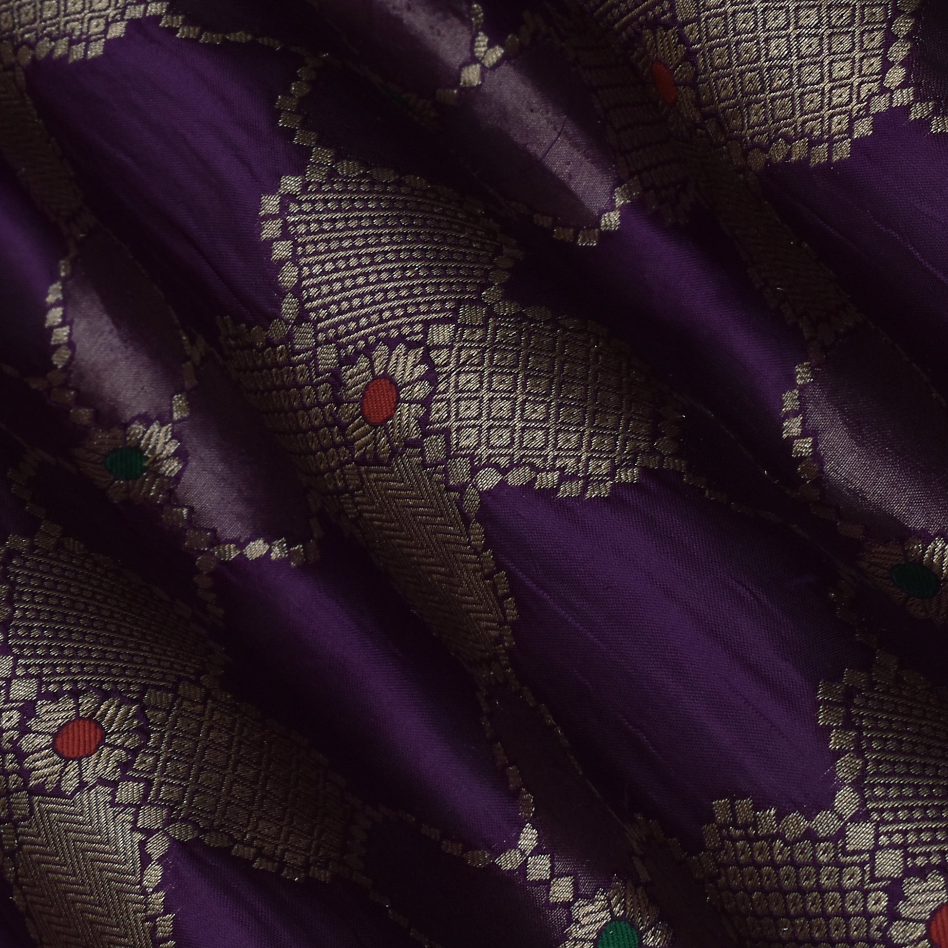 Made from the highest quality of Katan silk, this purple brocade fabric showcases stunning Meena work, adding a touch of traditional elegance to any outfit. With its smooth texture and vibrant color, this fabric is perfect for creating luxurious and eye-catching pieces. Elevate your wardrobe with this exquisite fabric.