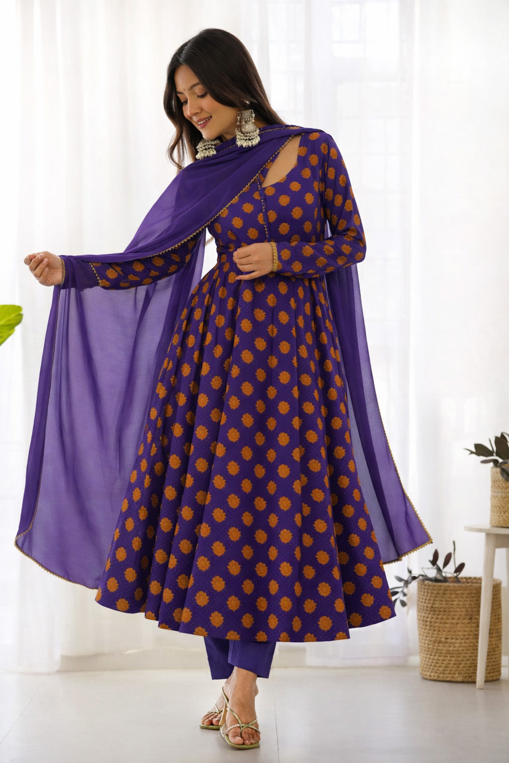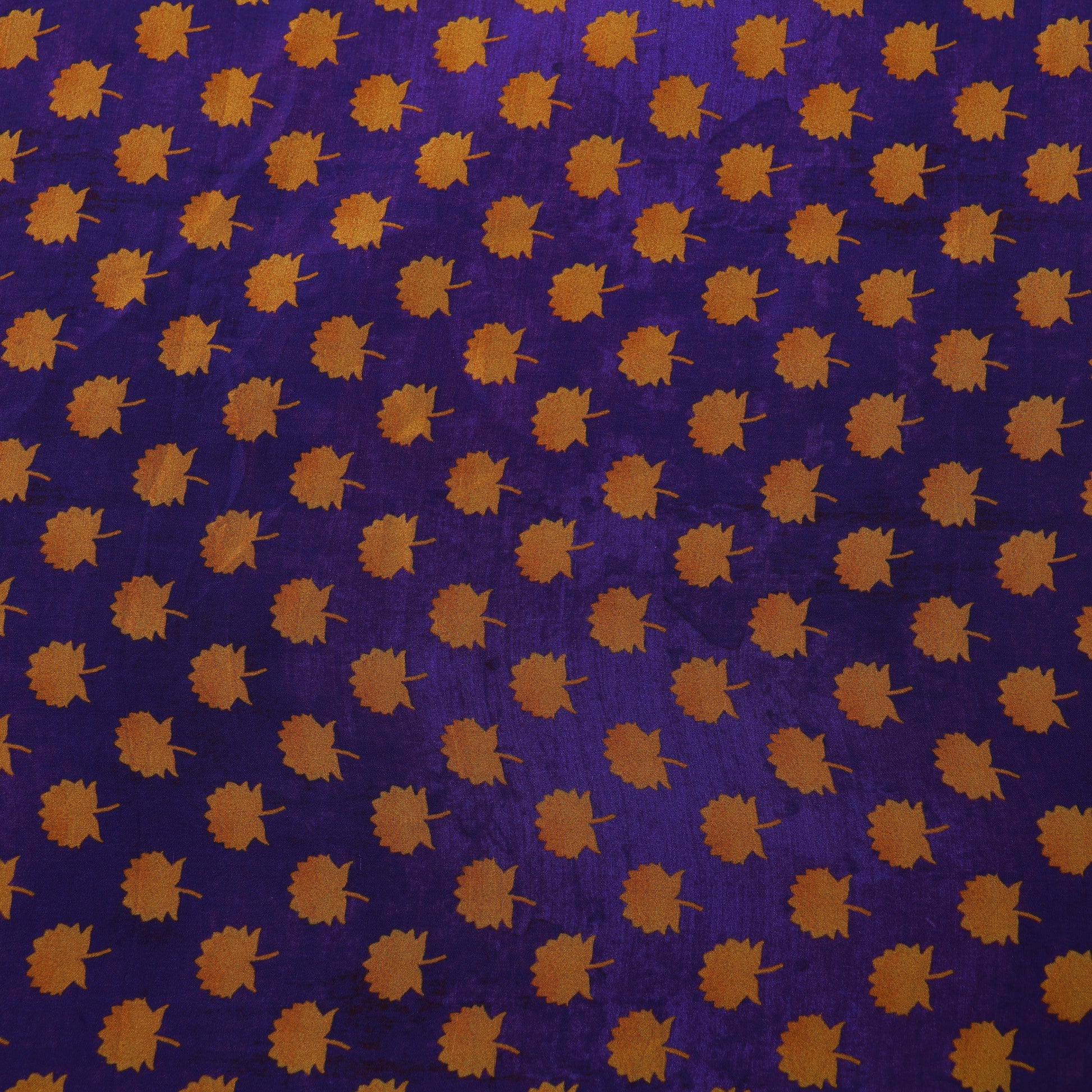 Purple Color Satin Hydra Print Fabric features a smooth, glossy satin base with a rich purple tone and stylish hydra print. The natural sheen of satin enhances the print, giving the fabric a luxurious and elegant look. Soft to touch with a graceful drape, this fabric is ideal for party wear, festive outfits, and designer creations.