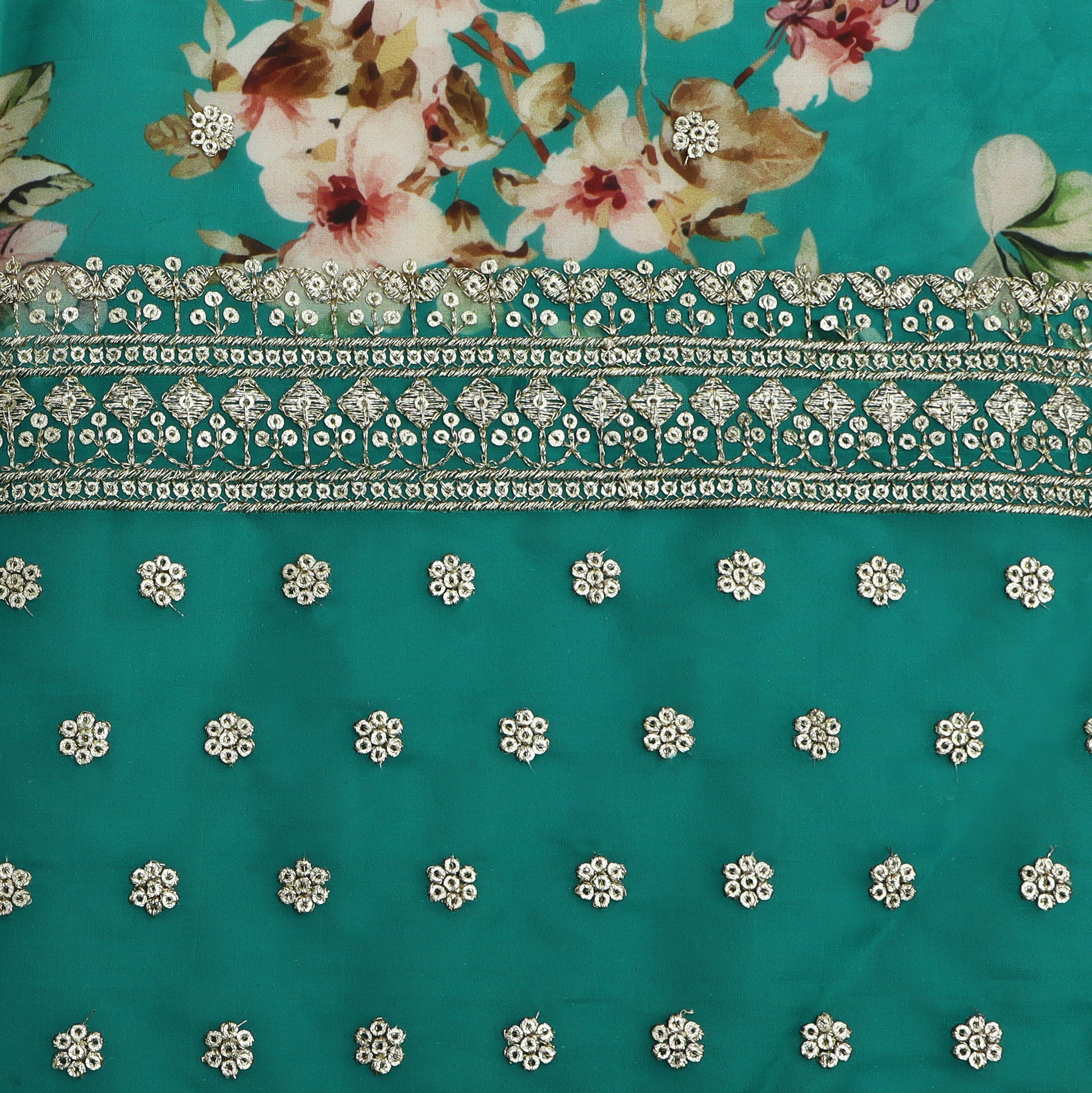 Expertly crafted with a delicate organza fabric, our Rama Green Color Print Embroidery Fabric adds a touch of elegance to any project. The intricate embroidery detailing and vibrant green color make it a versatile choice for any occasion. Create stunning pieces with this high-quality fabric.