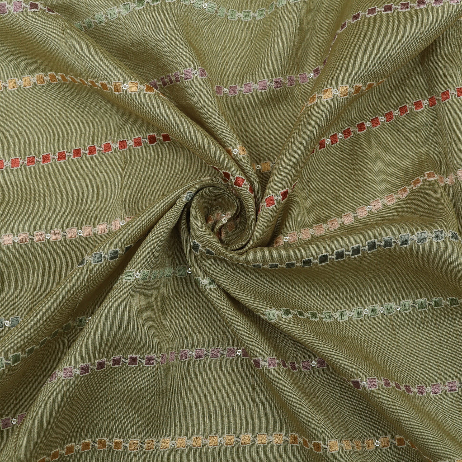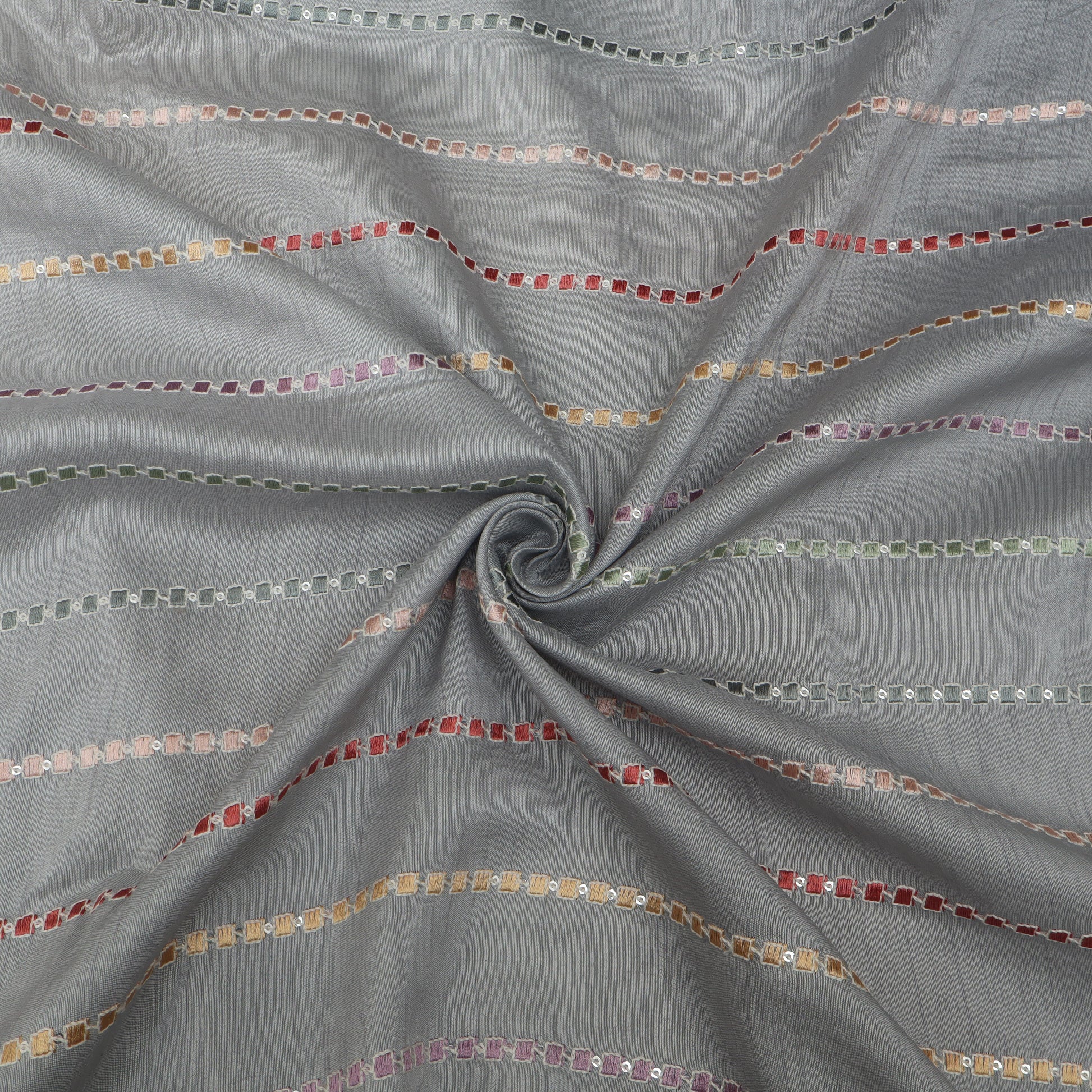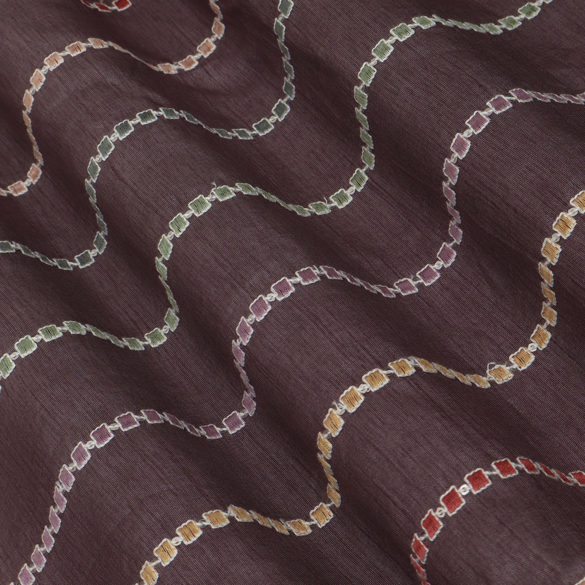 This elegant Raw Silk Embroidery Fabric showcases a refined blend of texture and craftsmanship. Crafted on a rich, earthy-toned raw silk base, the fabric features delicate linear embroidery arranged in graceful horizontal patterns. The subtle multicolour threadwork adds depth and visual interest without overpowering the fabric’s natural sophistication.