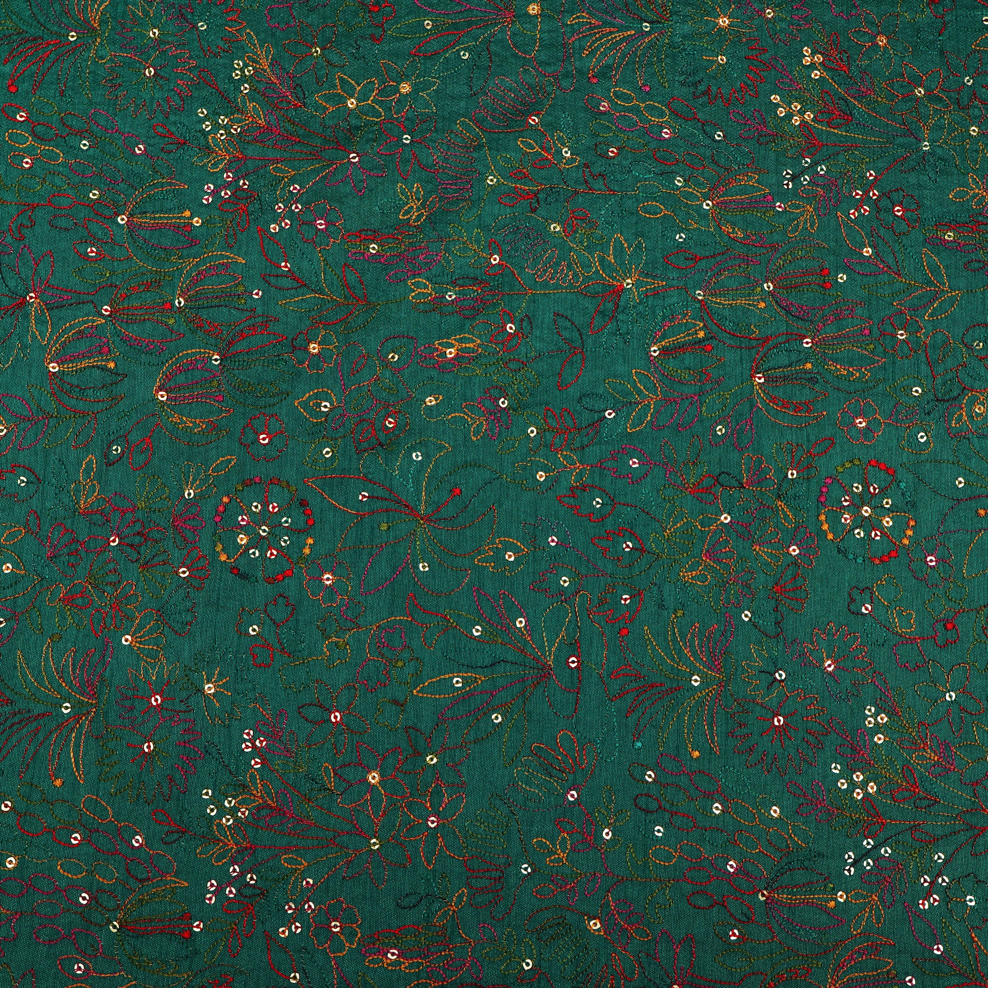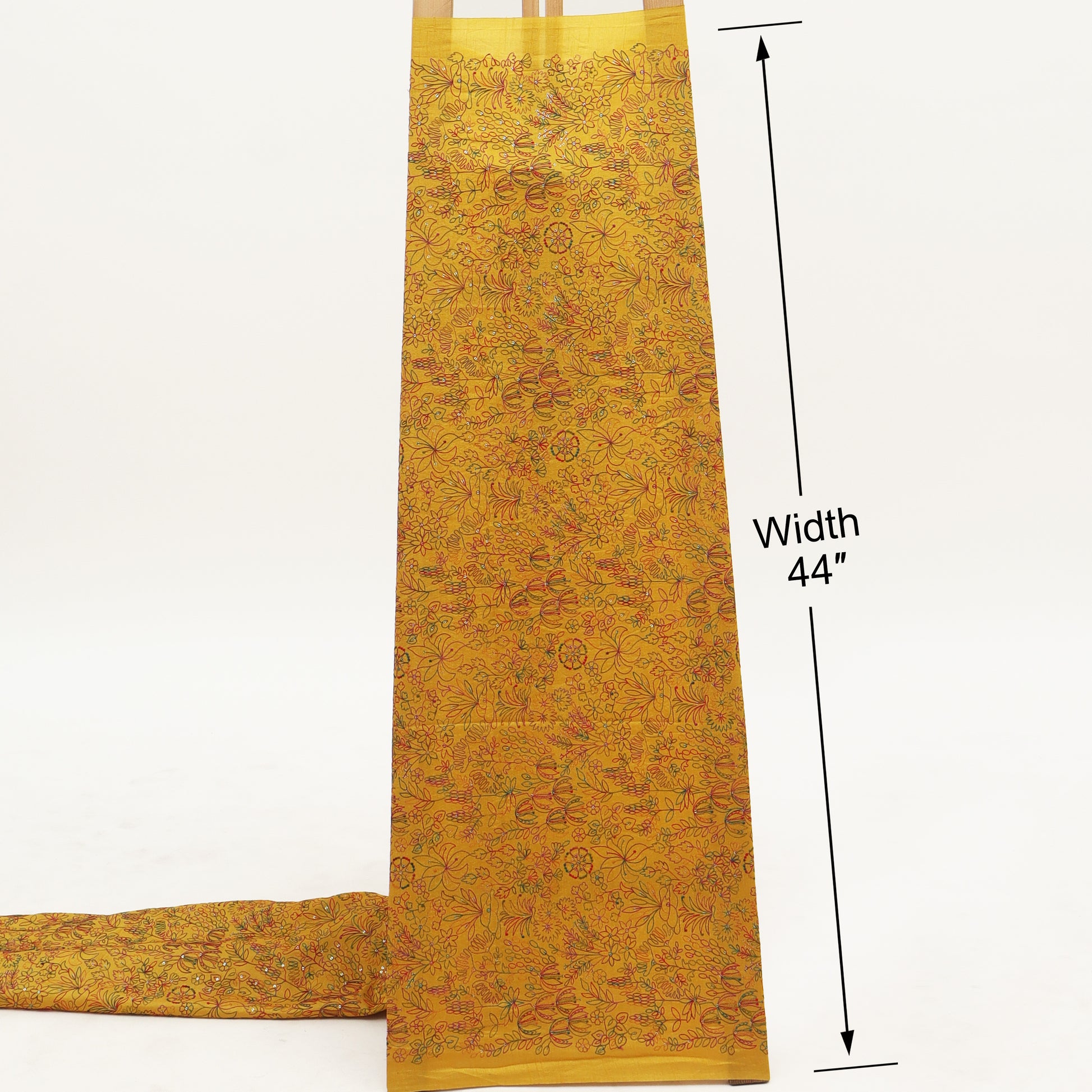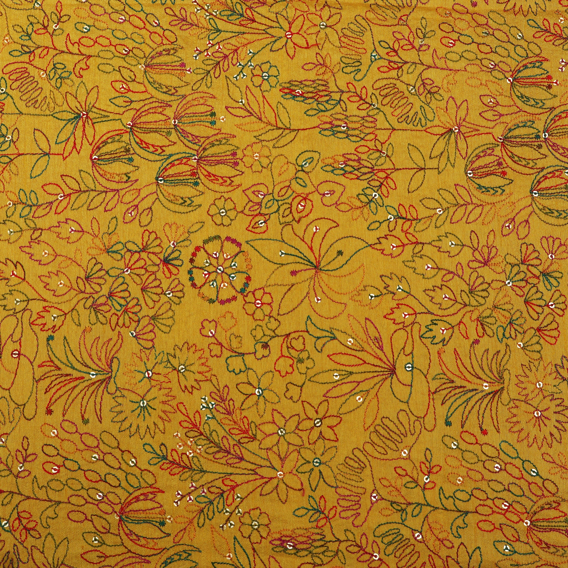 Celebrate timeless elegance with this exquisite Raw Silk Embroidery Fabric, crafted on a rich mustard yellow base. The fabric is beautifully adorned with intricate multicolor floral and foliage embroidery, delicately stitched in hues of teal, red, pink, and green. Fine detailing and subtle sequin accents add a gentle shimmer, enhancing the fabric’s luxurious appeal without overpowering its natural charm.