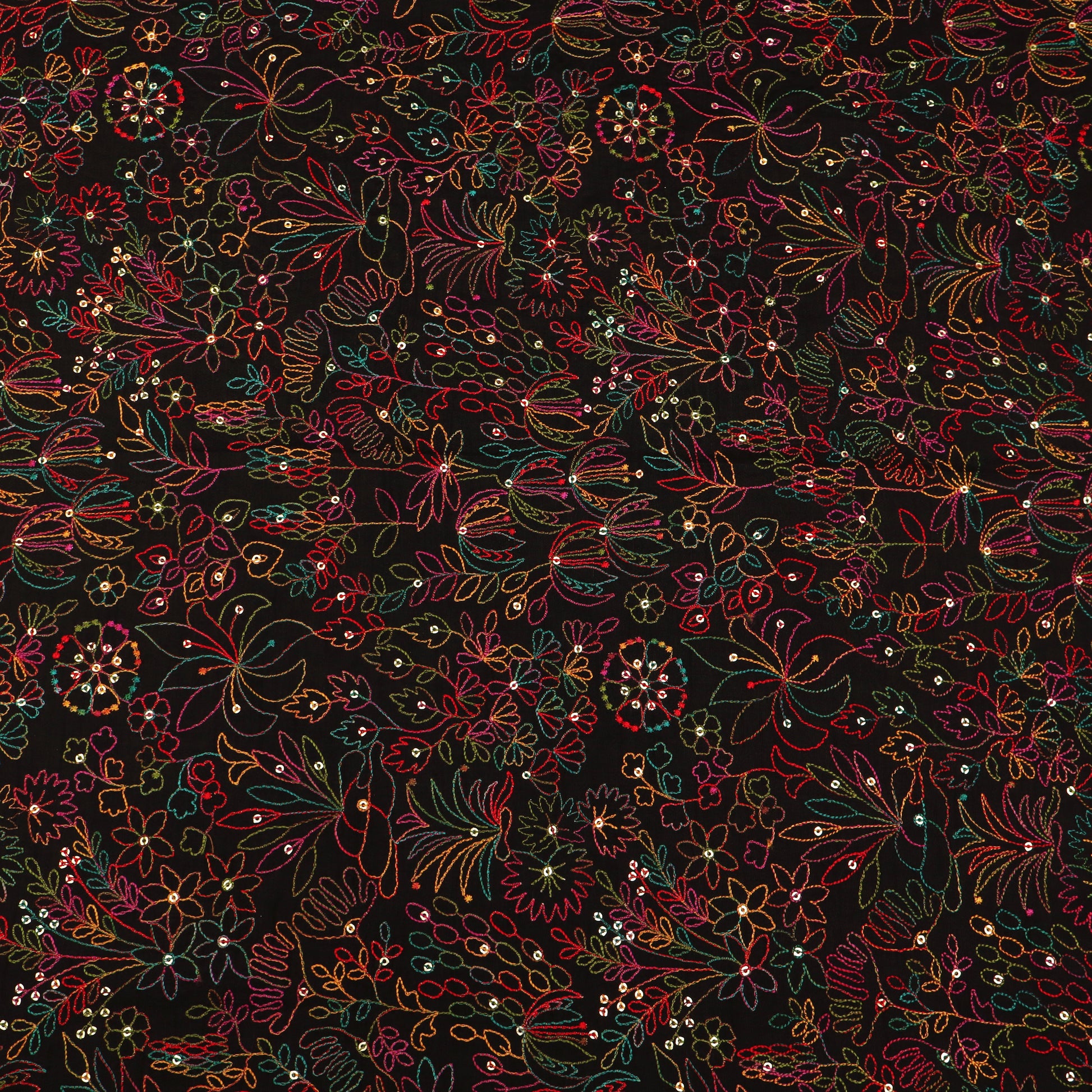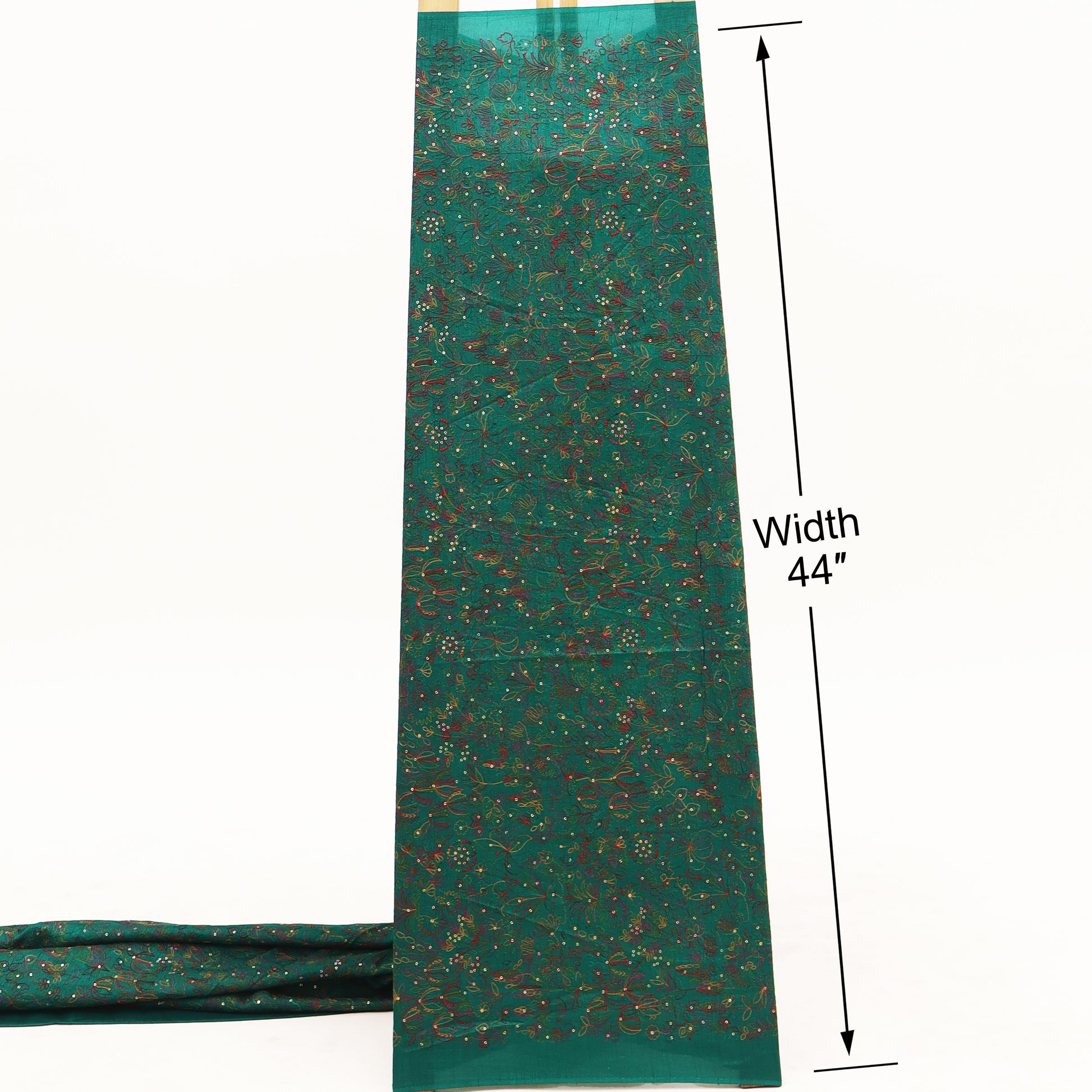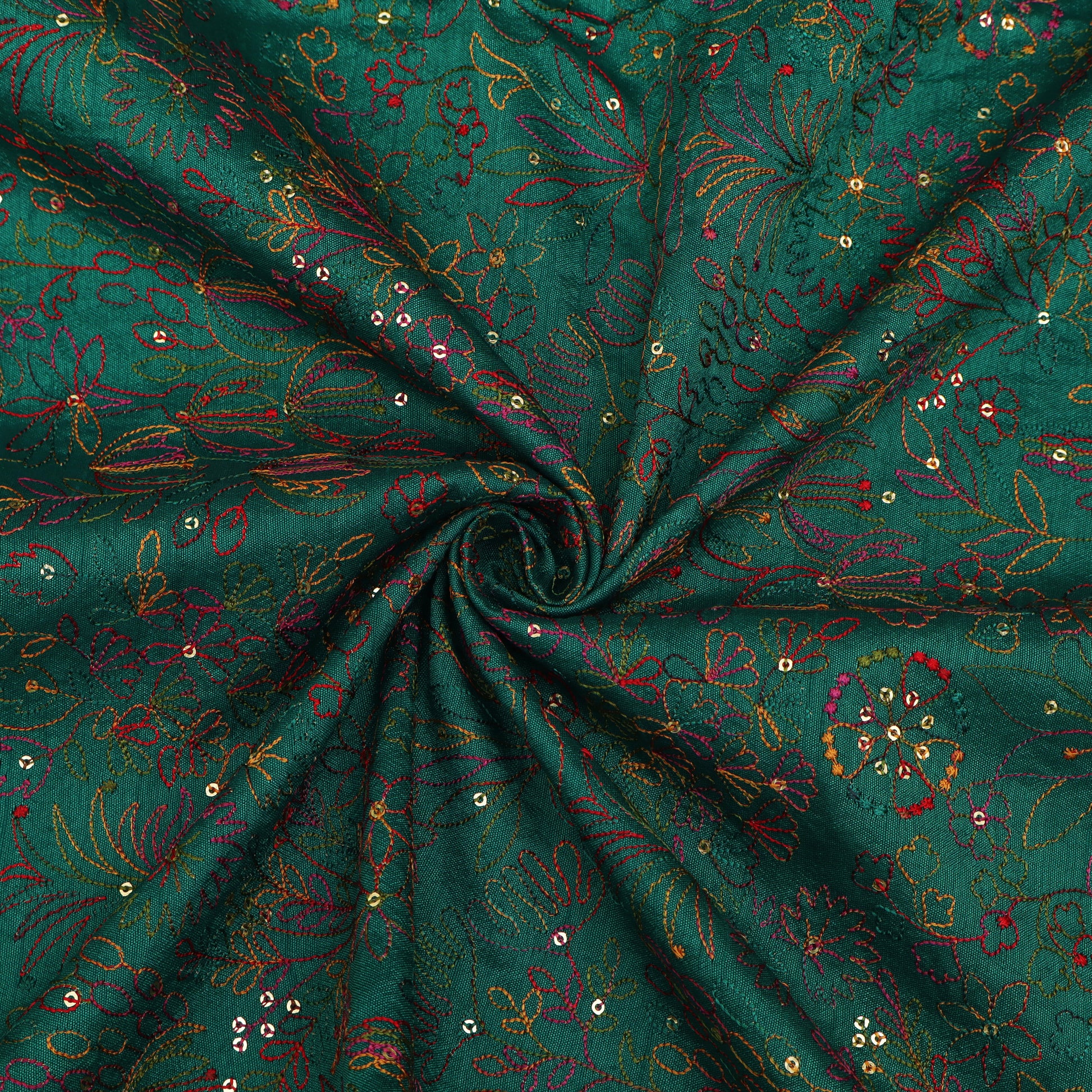 Celebrate timeless elegance with this exquisite Raw Silk Embroidery Fabric, crafted on a rich mustard yellow base. The fabric is beautifully adorned with intricate multicolor floral and foliage embroidery, delicately stitched in hues of teal, red, pink, and green. Fine detailing and subtle sequin accents add a gentle shimmer, enhancing the fabric’s luxurious appeal without overpowering its natural charm.