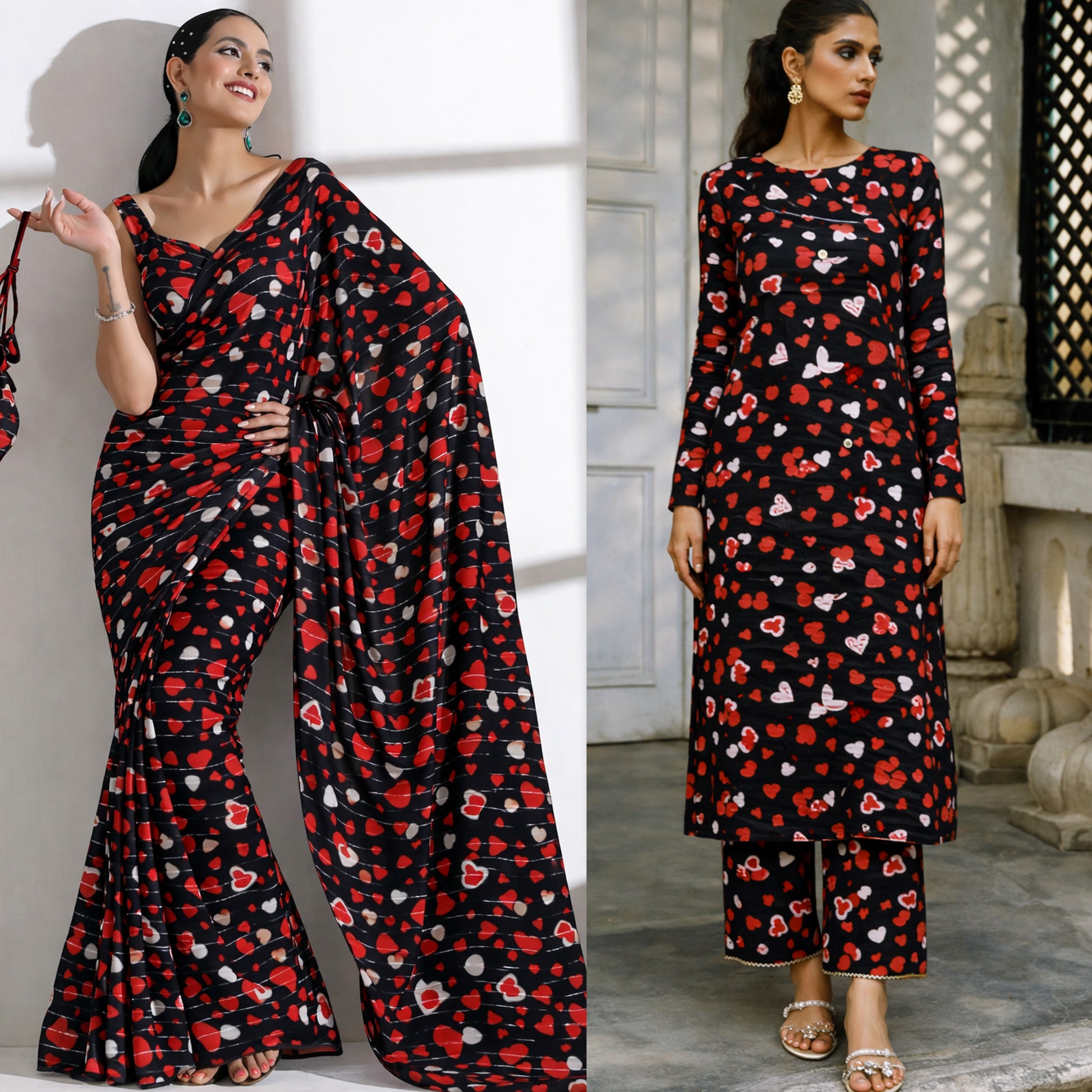 Red And White Heart Design Brasso Valvet Fabric, this burnout velvet fabric offers depth, softness, and fluid movement. The velvet motifs add richness, while the lightweight background ensures comfort and graceful wearability.
