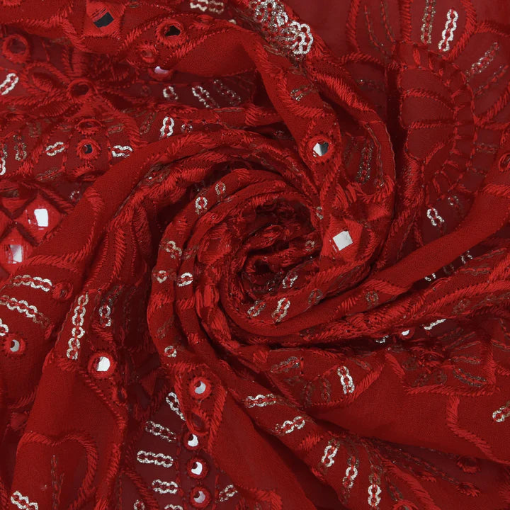 This high-quality Red Georgette Embroidery Fabric features intricate embroidery and a vibrant red color. Made from premium materials, it is perfect for adding a touch of elegance to any outfit. With its lightweight and delicate texture, it is ideal for creating beautiful and stylish garments.