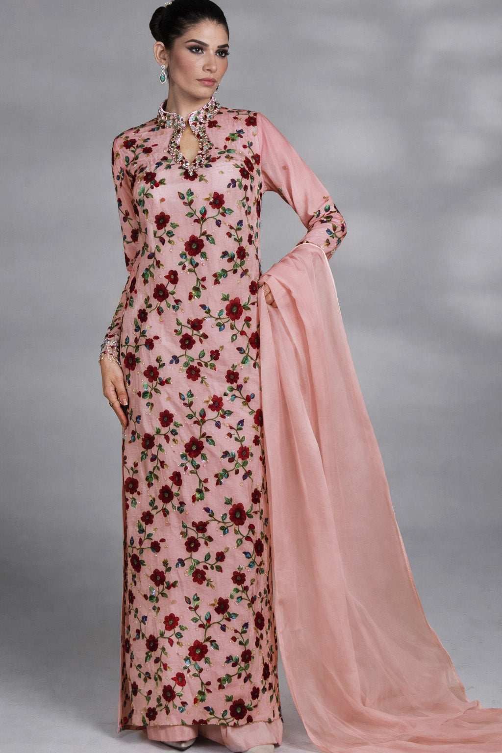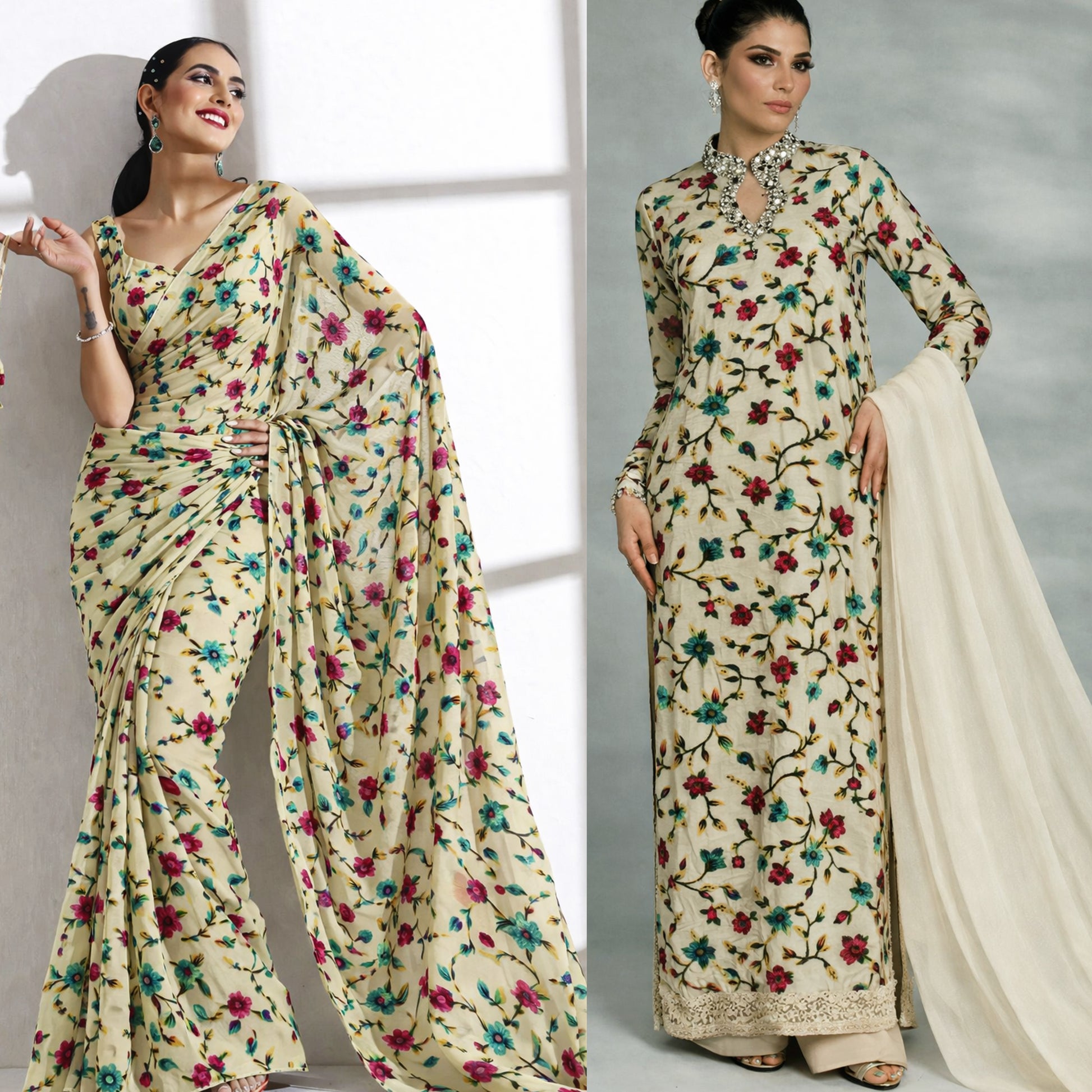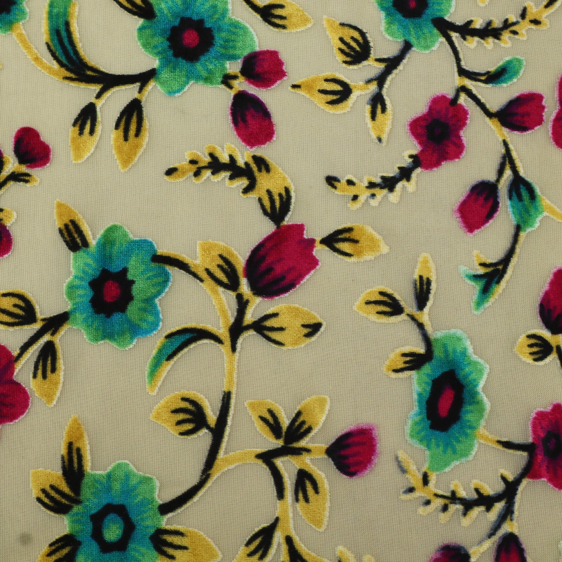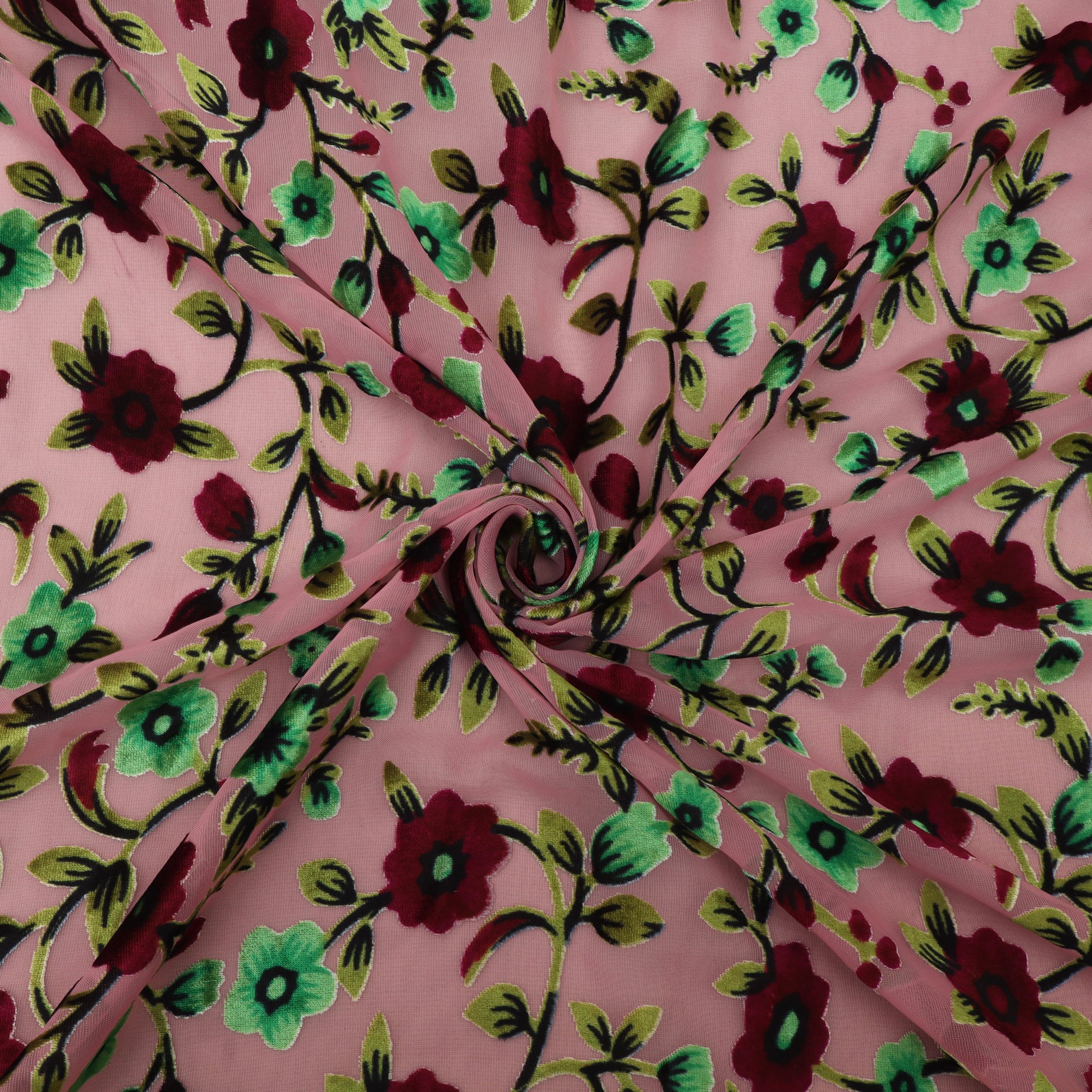 Featuring expressive floral patterns with a velvet-touch finish, this burnout fabric offers a perfect balance of structure and fluidity. The sheer foundation adds lightness, while the textured motifs elevate the fabric’s luxury feel for high-fashion creations.