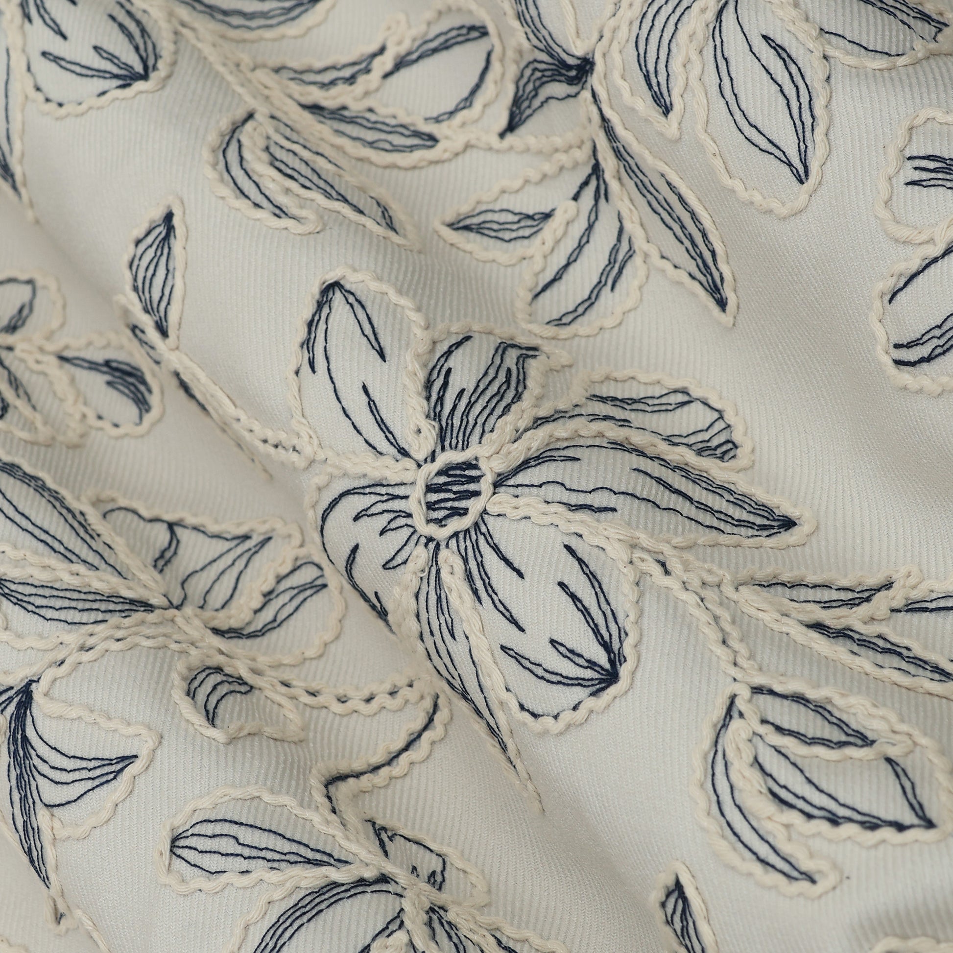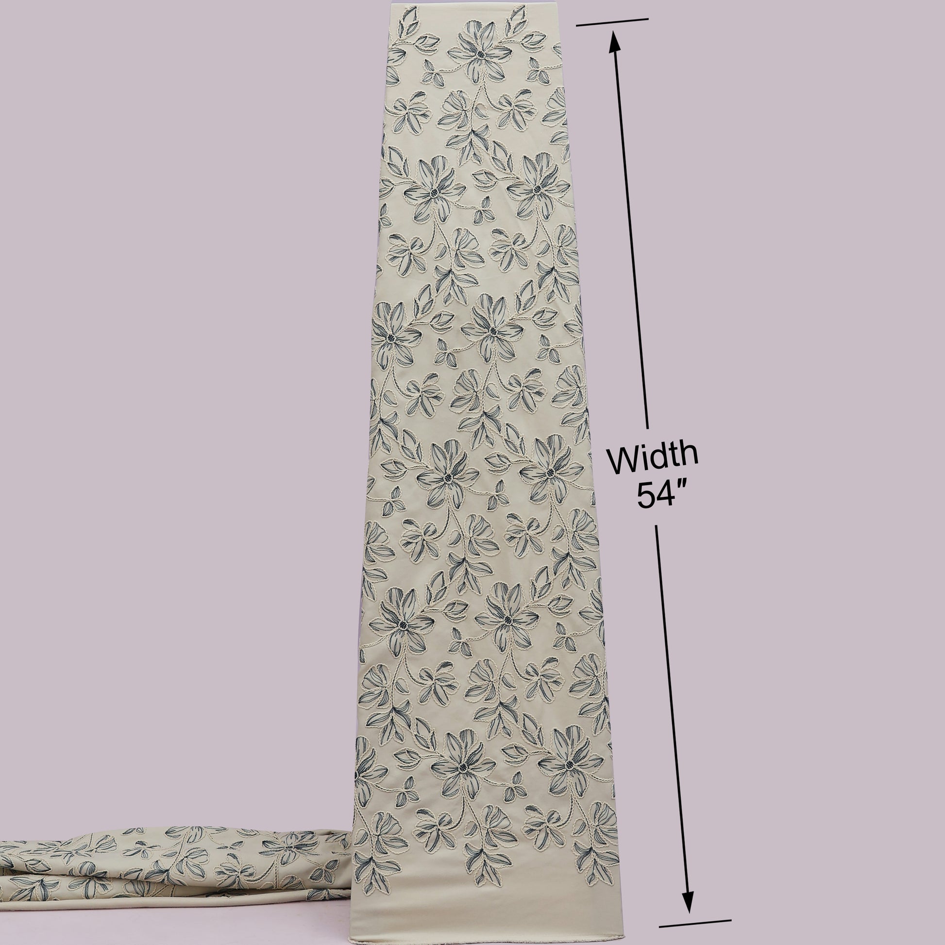 Gracefully crafted, this Spun Silk Embroidery Fabric showcases delicate threadwork on a soft spun silk base, offering a perfect balance of elegance and comfort. The fabric features finely embroidered floral and vine motifs, highlighted with subtle contrast detailing that adds depth and artisanal charm.