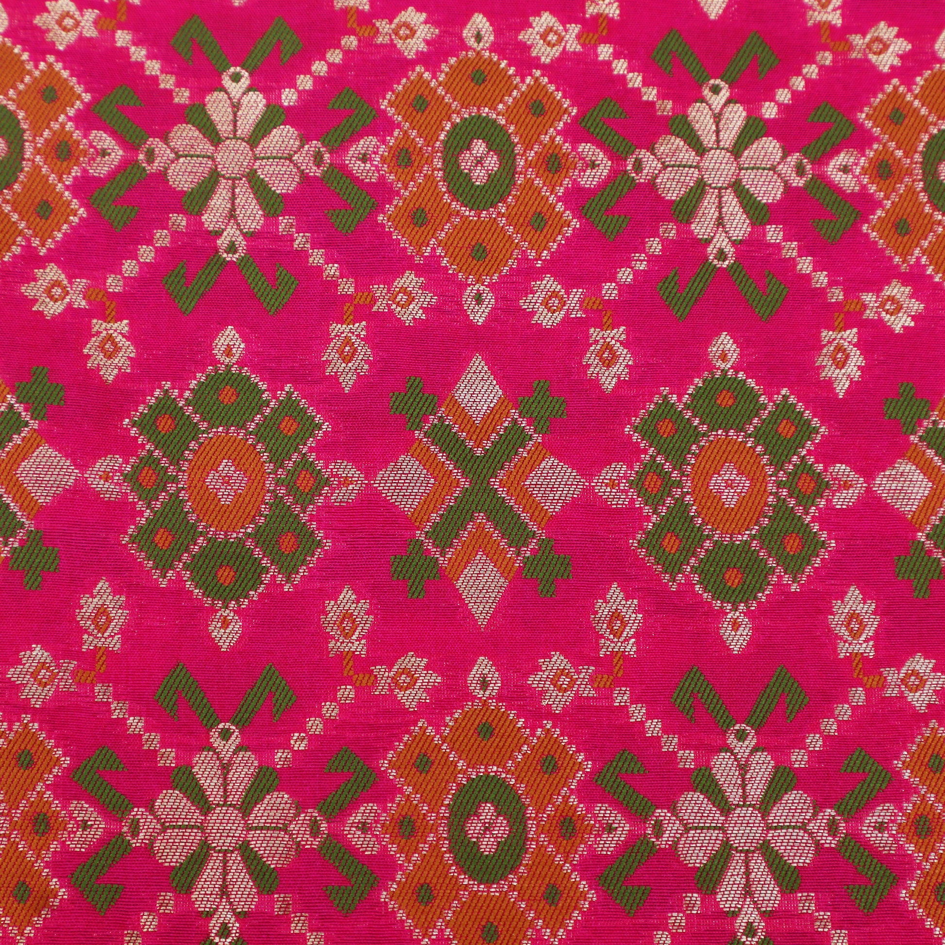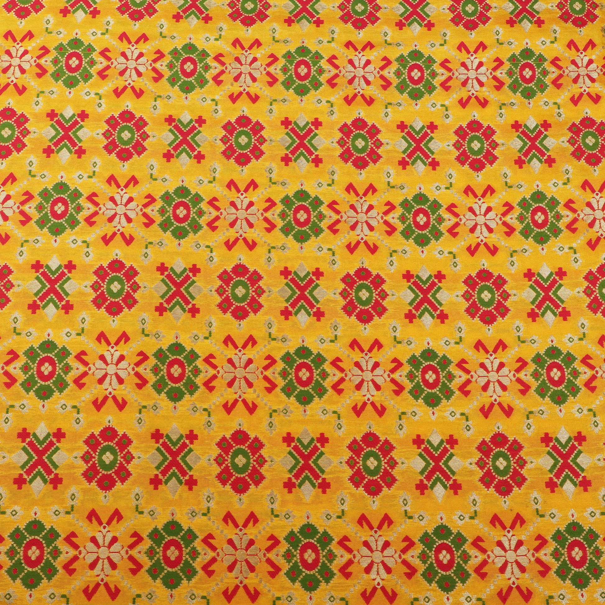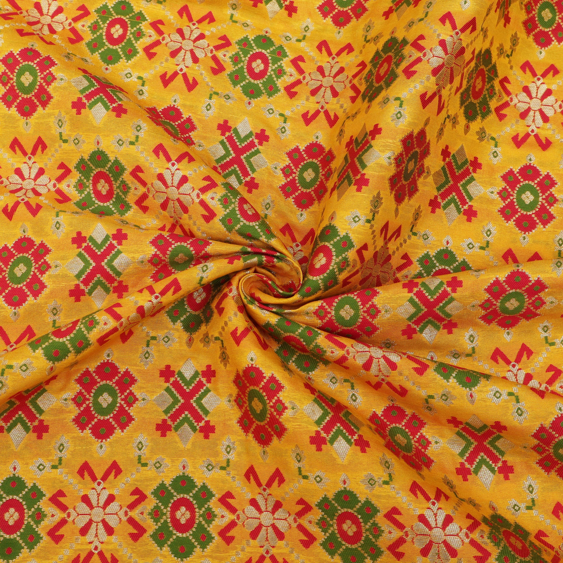 Elevate your ethnic creations with this exquisite Brocade Fabric, beautifully woven on a rich mustard yellow base. Adorned with traditional geometric and floral motifs in vibrant shades of green, red, and subtle metallic highlights, this fabric reflects timeless Indian craftsmanship. The intricate brocade weave adds a luxurious texture and a graceful sheen, making it a perfect choice for festive and ceremonial wear.