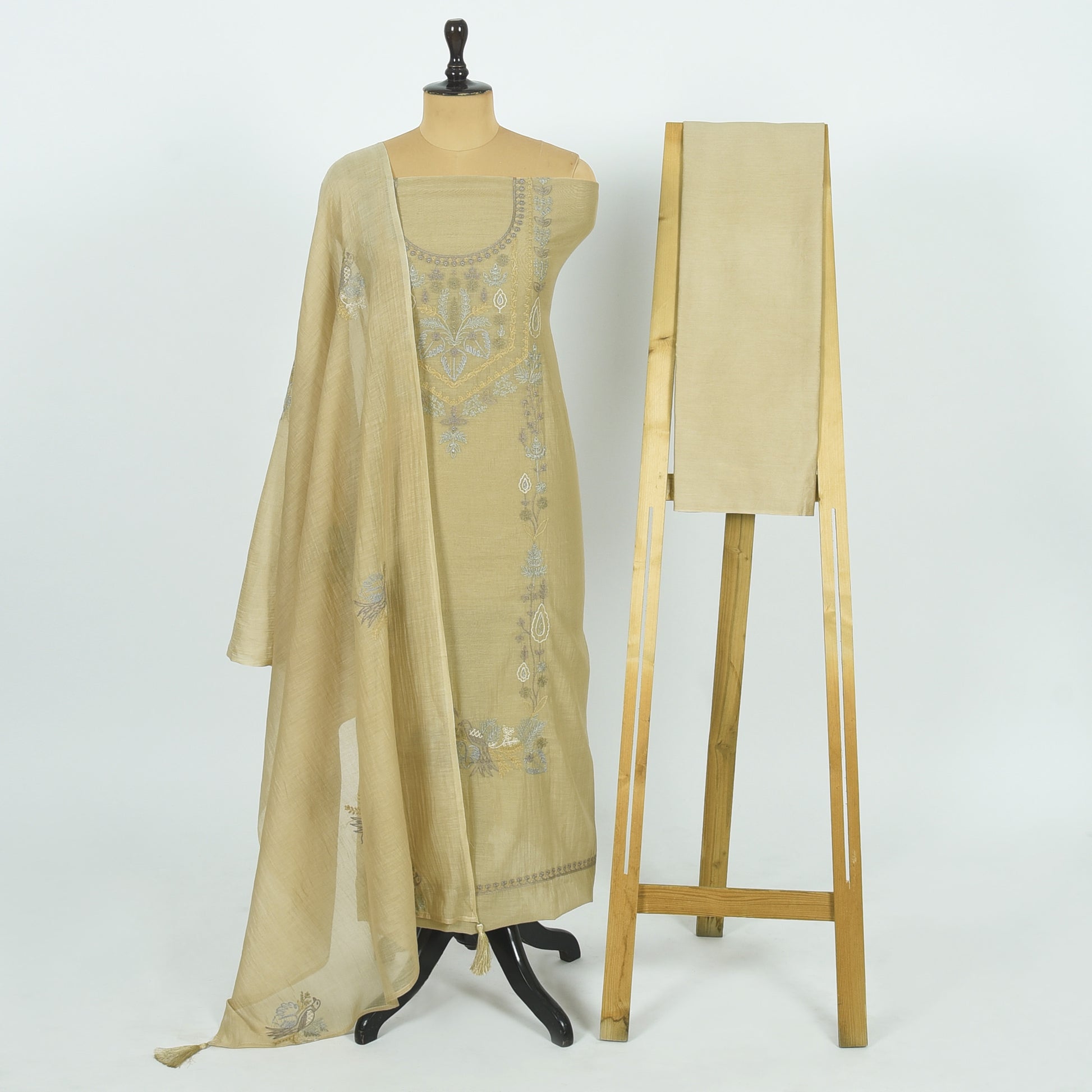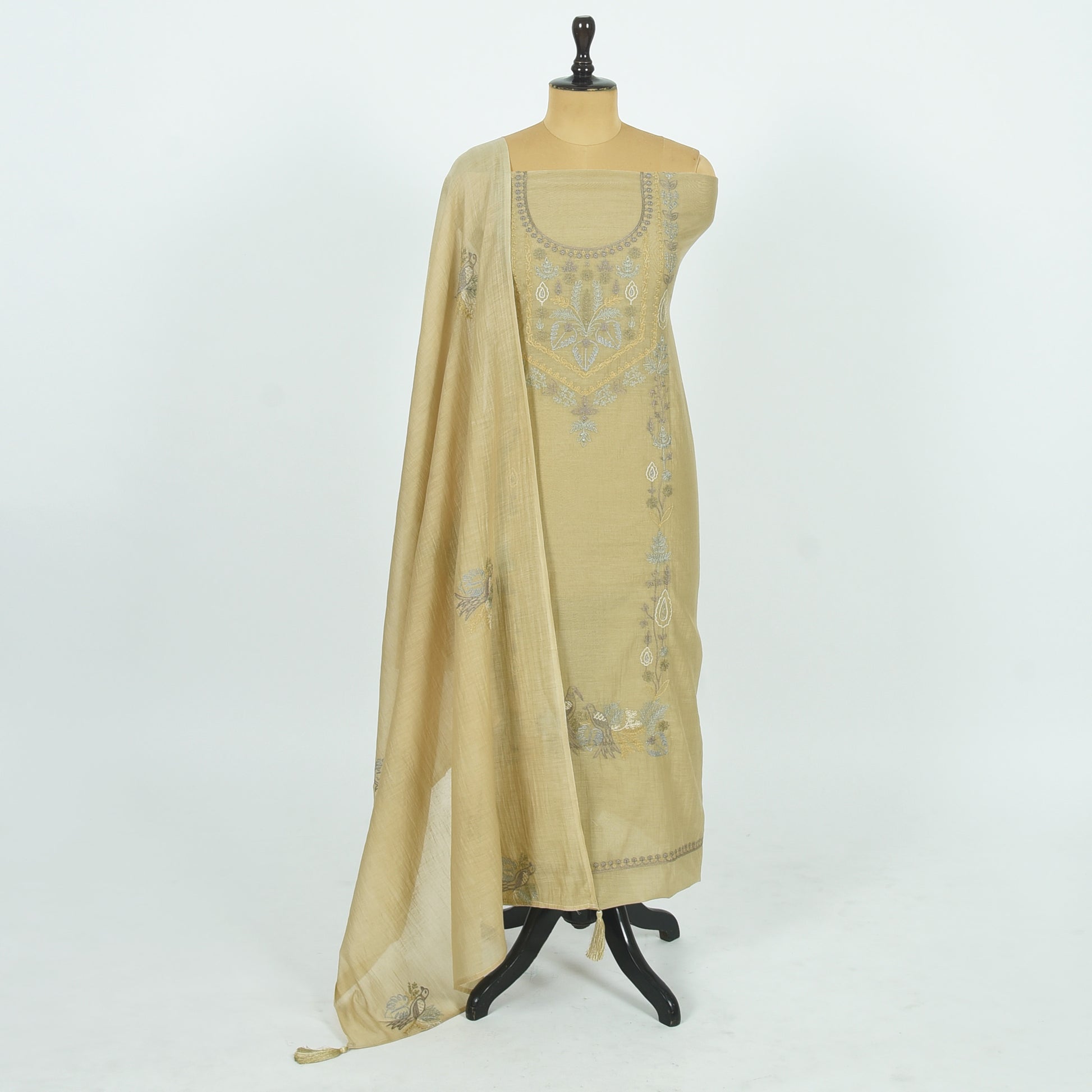 This Unstitched Chanderi Suit Set is crafted from high-quality fabric and includes a versatile top, bottom, and dupatta. Experience the comfort and elegance of this suit set as you create a unique and personalized look. Perfect for any occasion, this set will elevate your style with its timeless design.