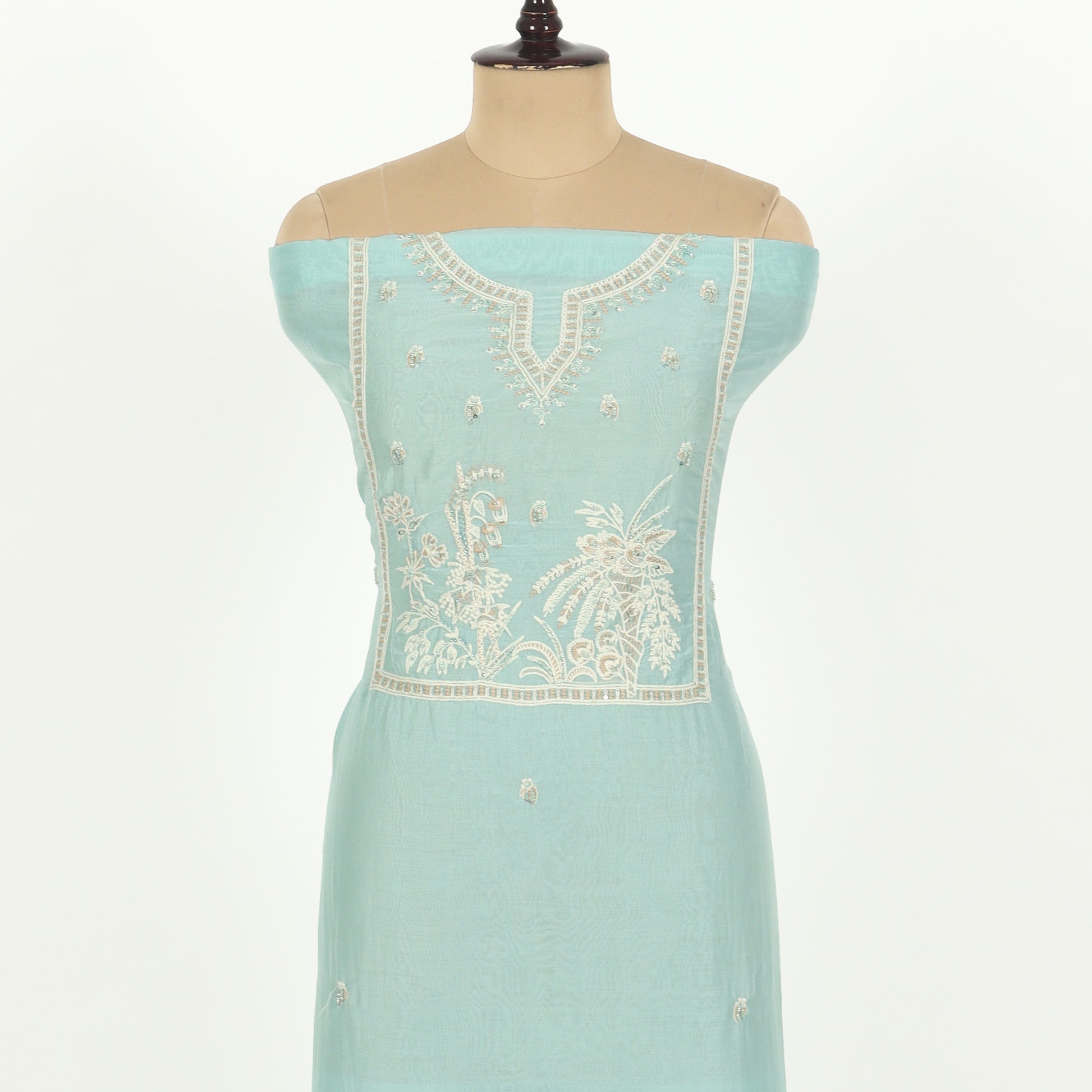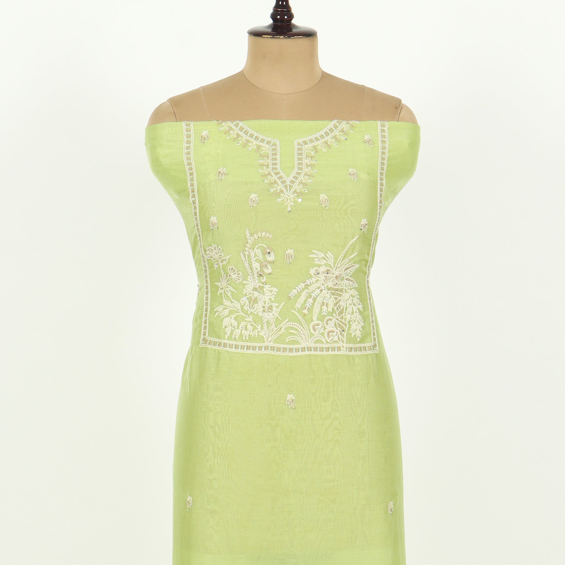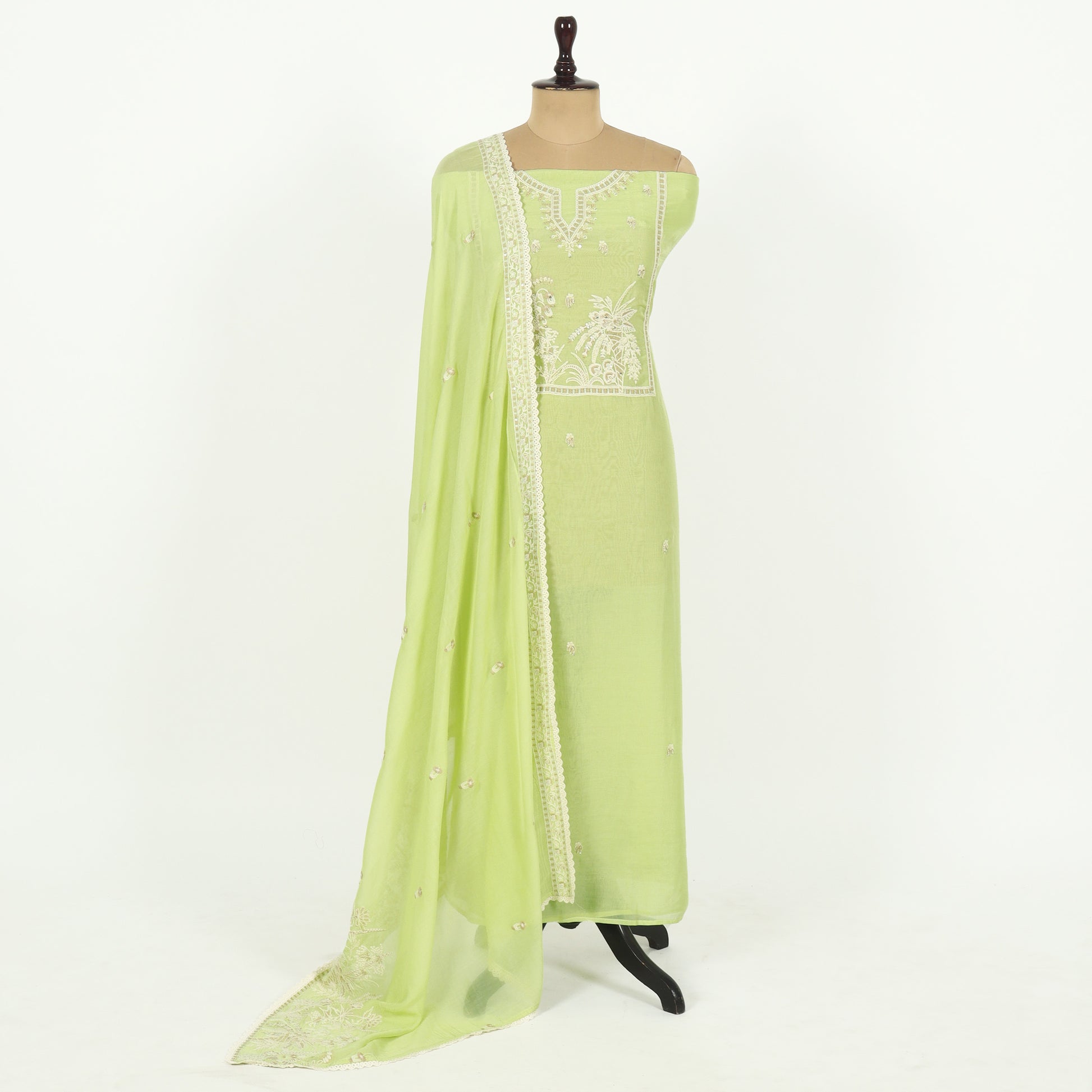 Elevate your wardrobe with our Unstitched Chanderi Suit Set. Handmade from Chanderi fabric, this set includes a top, bottom, and dupatta for ultimate customization. Impeccable craftsmanship and luxurious materials make this set a must-have for any fashion-forward individual.