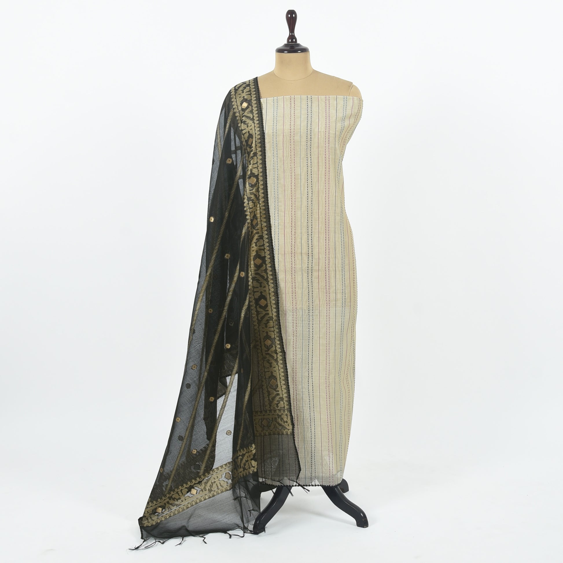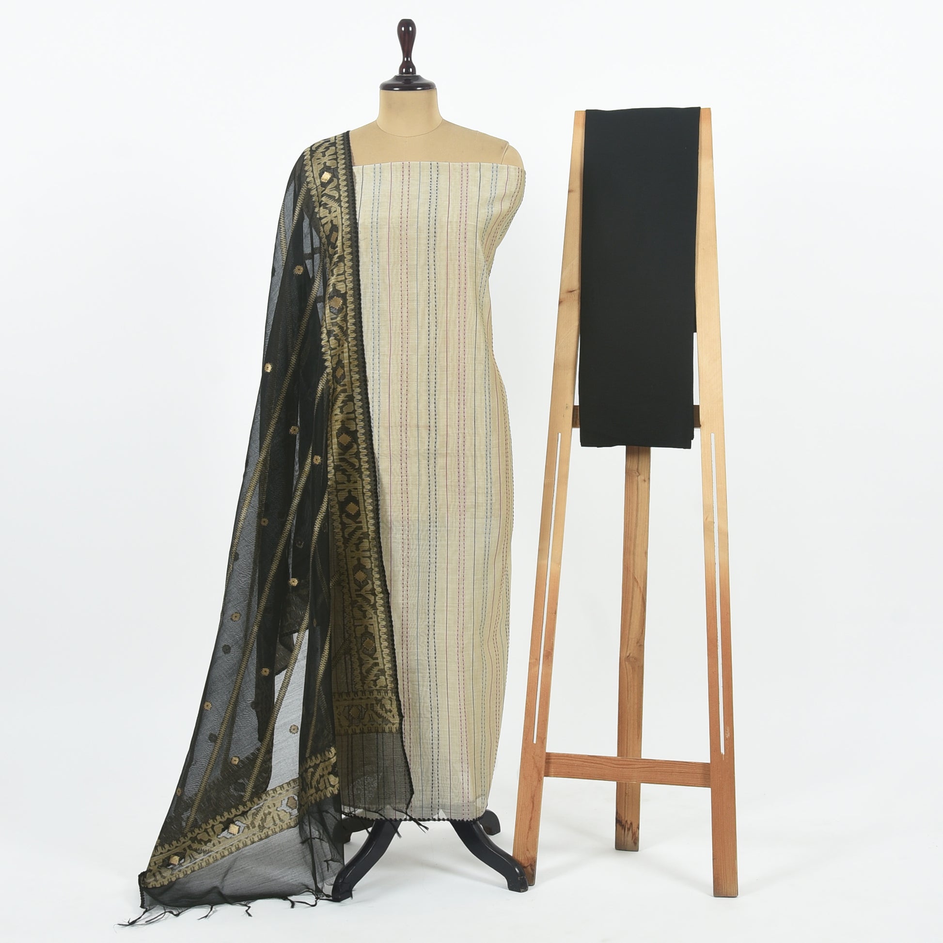 Elevate your wardrobe with this premium unstitched Chanderi suit set featuring a top, bottom, and dupatta. Crafted from authentic Chanderi fabric known for its lightweight texture and subtle sheen, this set offers versatility for customized tailoring according to your measurements and style preferences. Perfect for both festive occasions and formal gatherings.