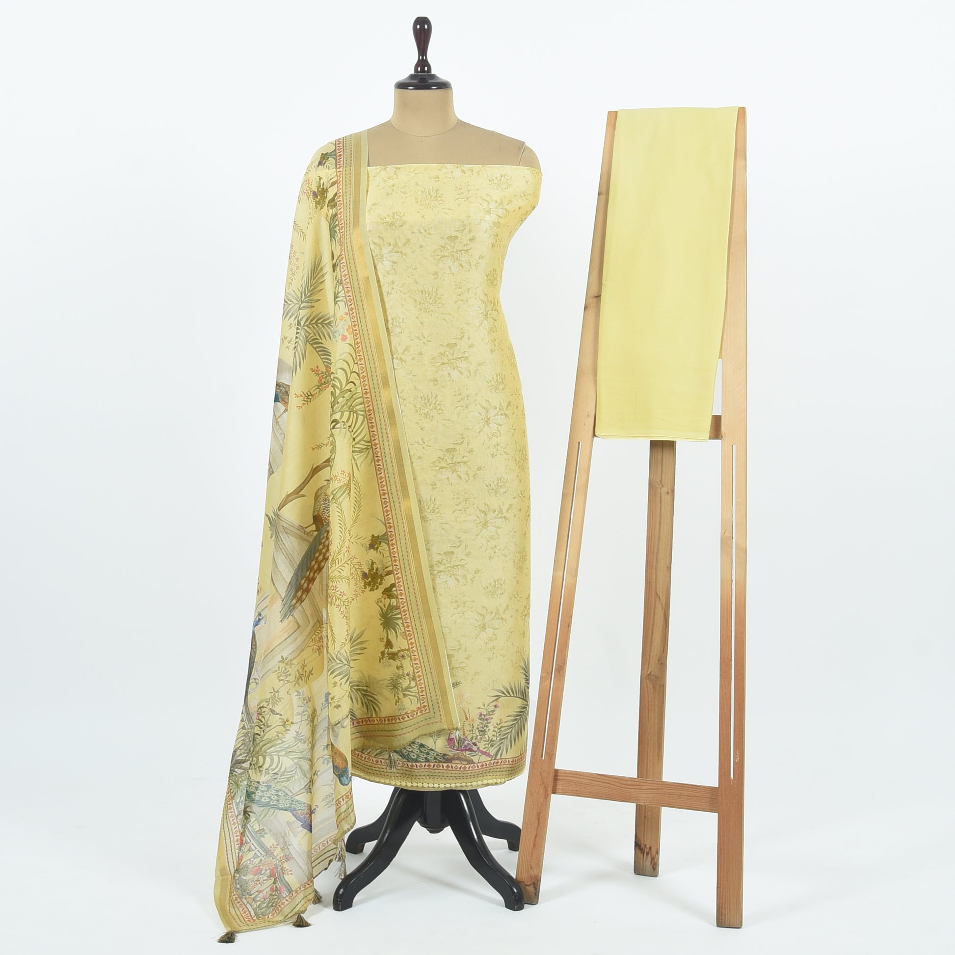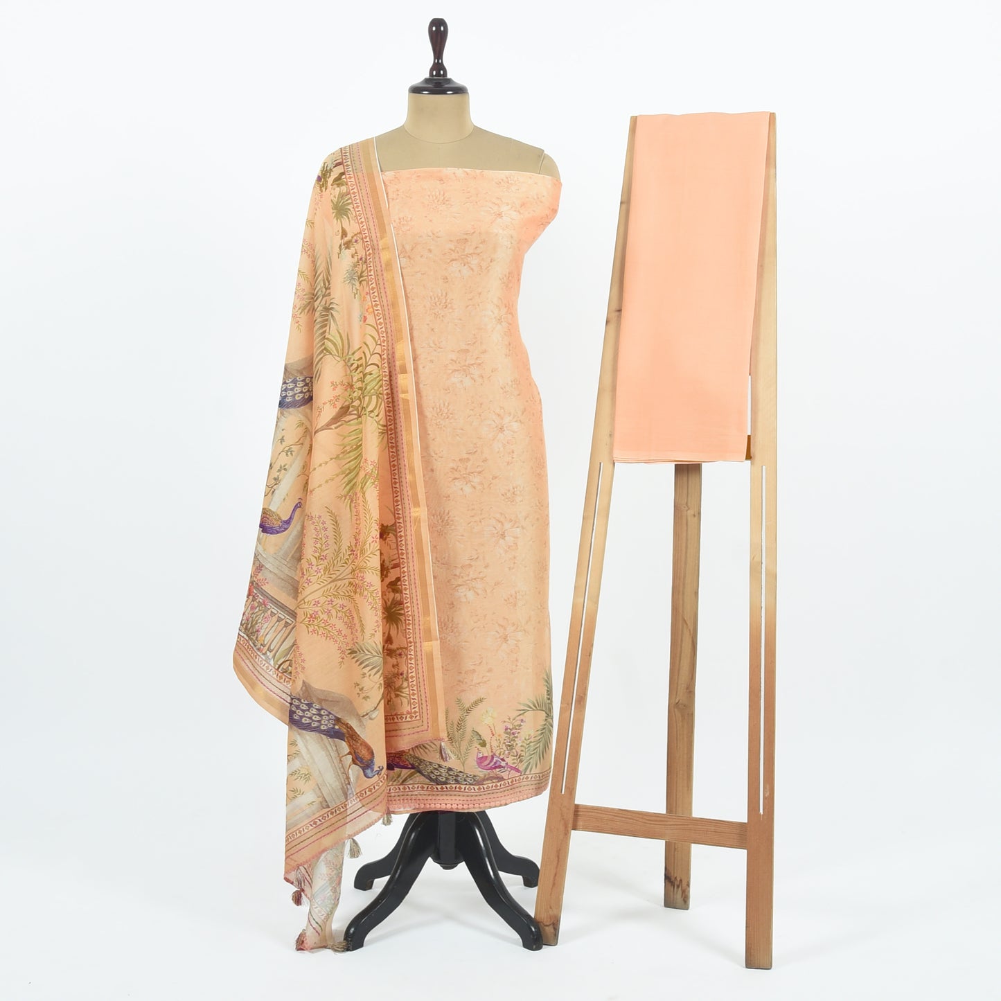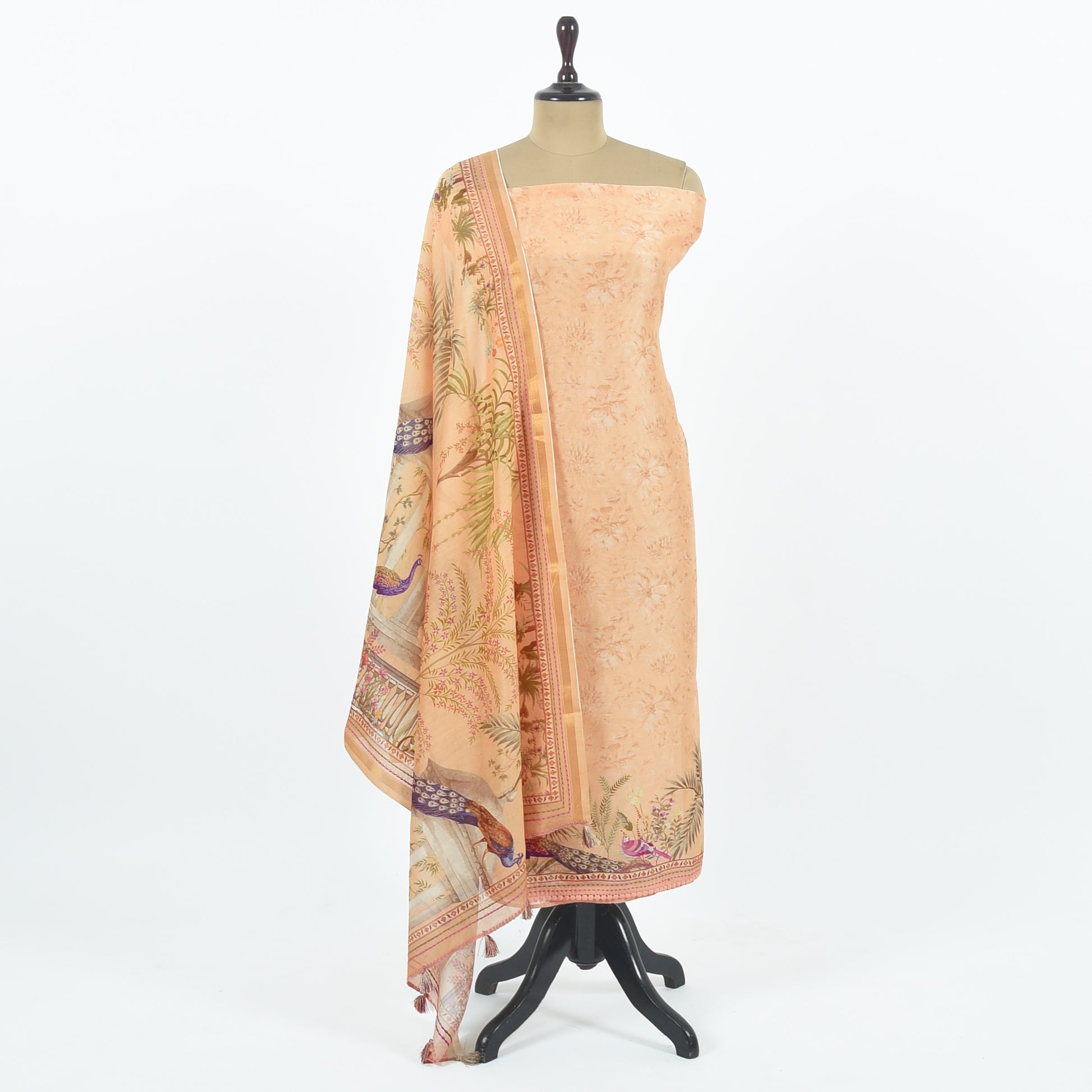 Elevate your wardrobe with our Unstitched Chanderi Suit Set. Handmade from Chanderi fabric, this set includes a top, bottom, and dupatta for ultimate customization. Impeccable craftsmanship and luxurious materials make this set a must-have for any fashion-forward individual.
