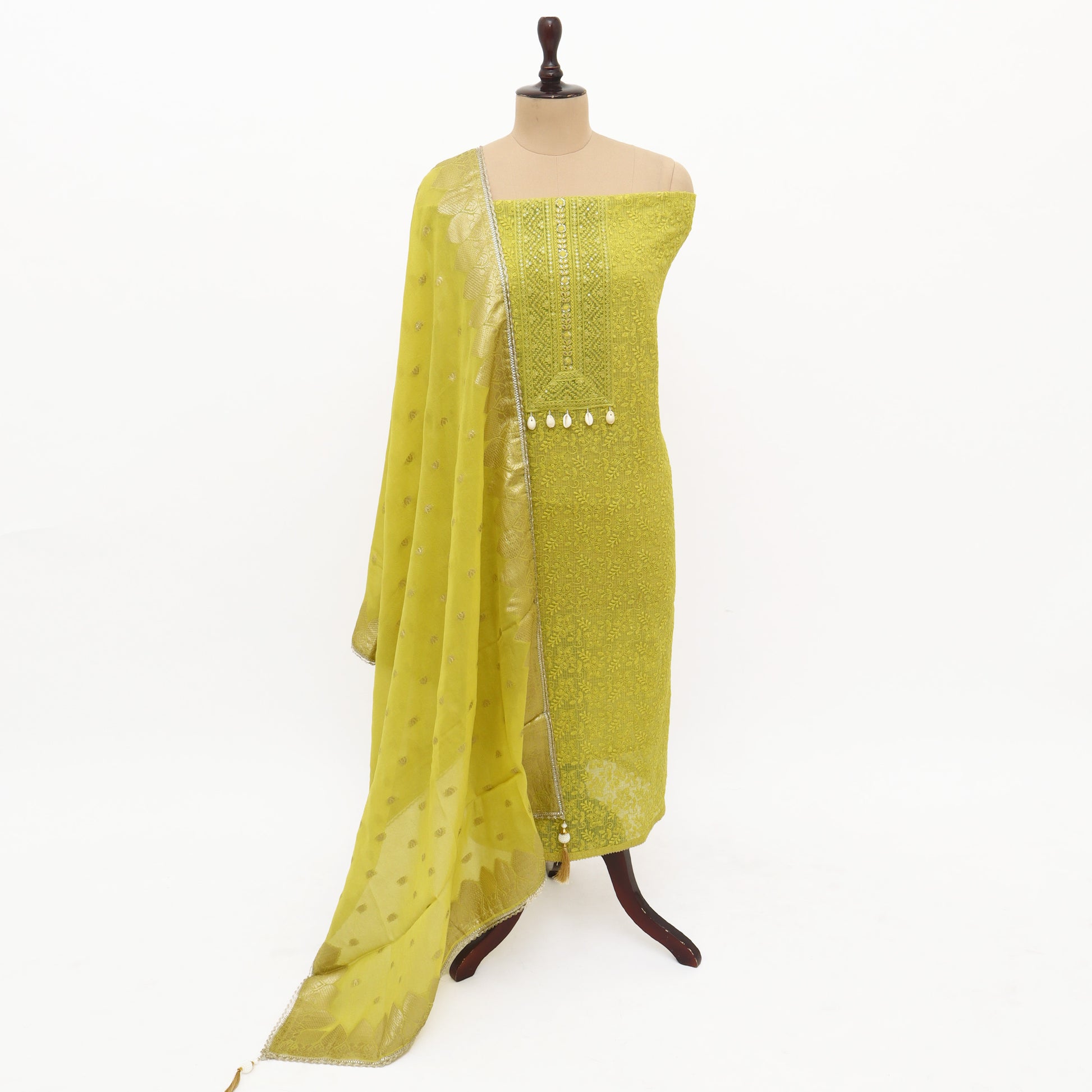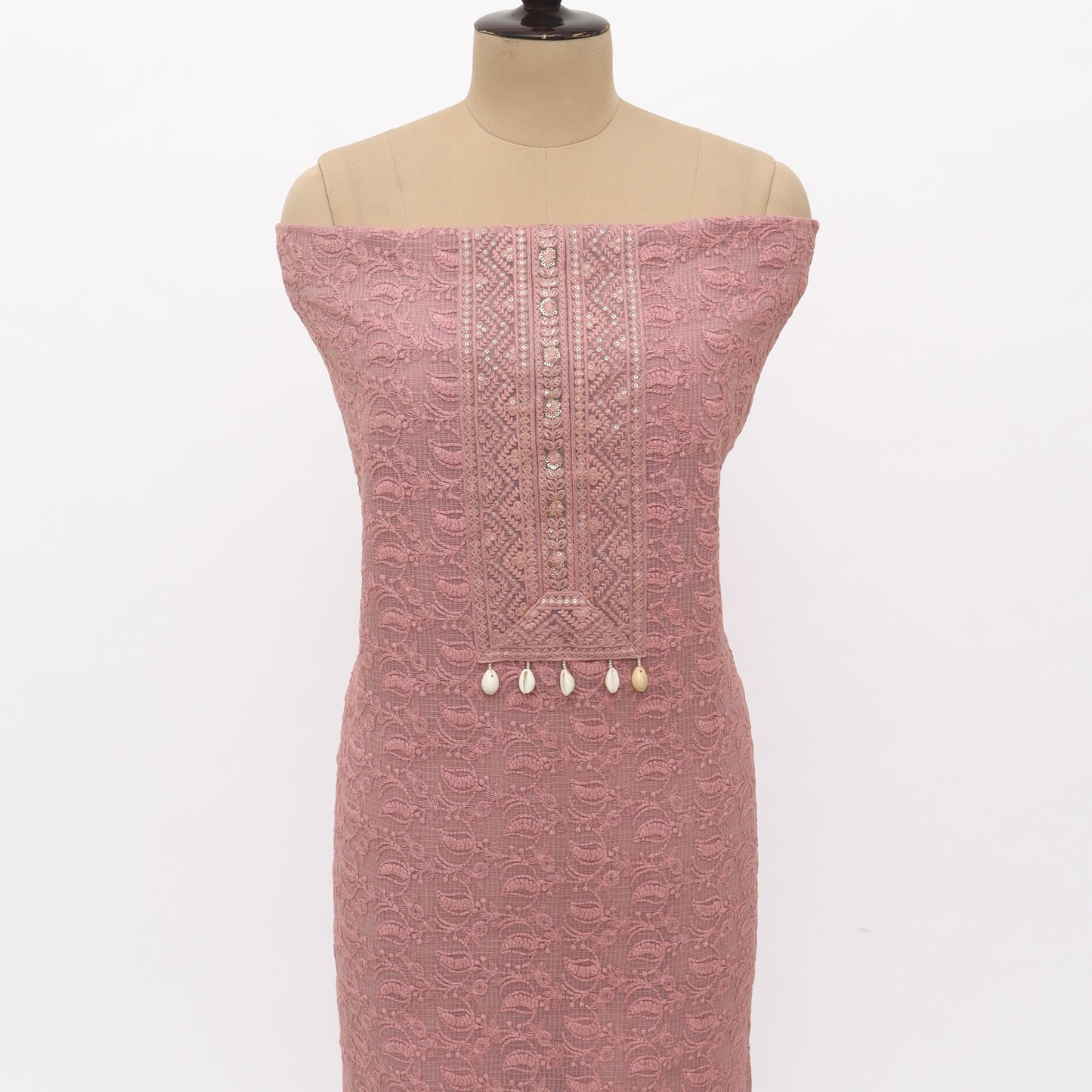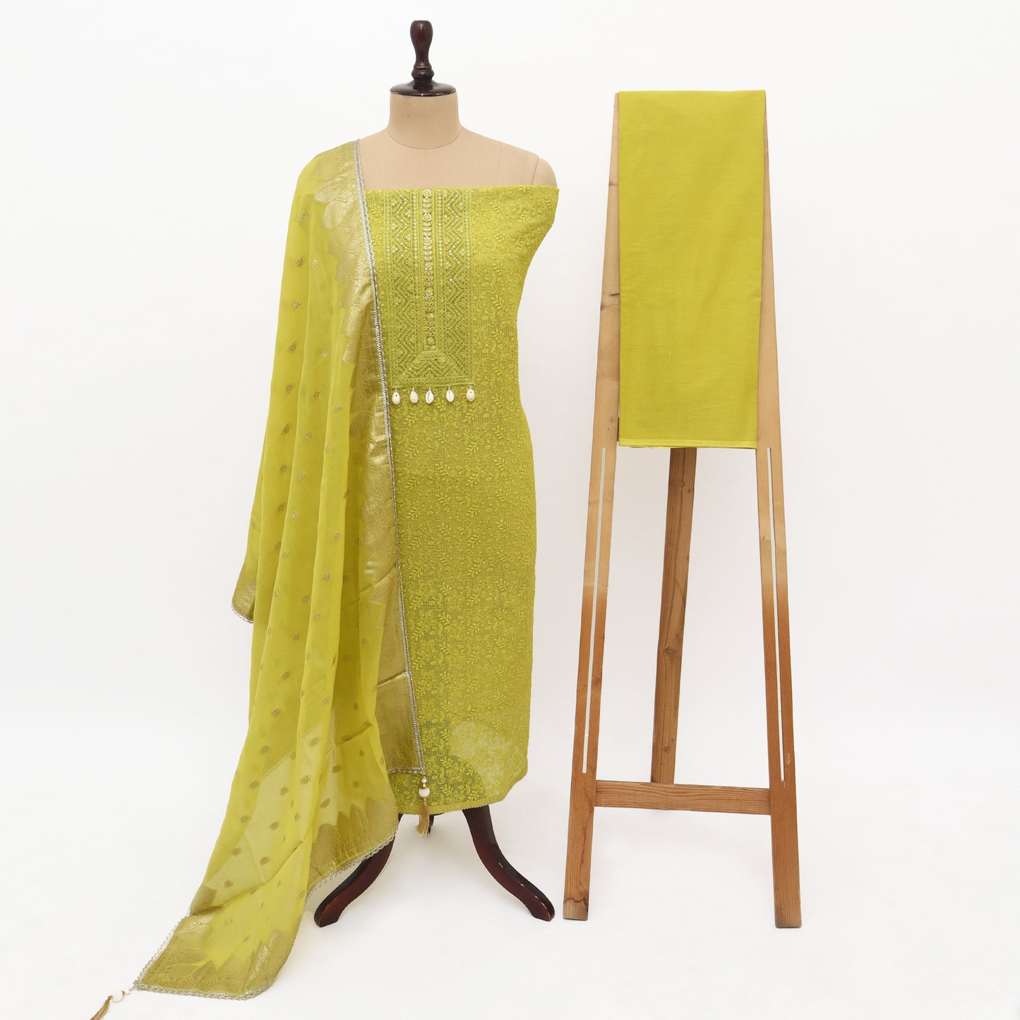 Experience the elegance of our Unstitched Kota Suit Set, featuring finely woven Kota fabric for a lightweight and breathable feel. This set includes fabric for the top, bottom, and a matching dupatta, allowing you to customize your outfit to your preferred style and fit. Ideal for warm weather, the breathable texture ensures comfort while maintaining a sophisticated look. Perfect for those who appreciate traditional craftsmanship combined with versatile styling options.