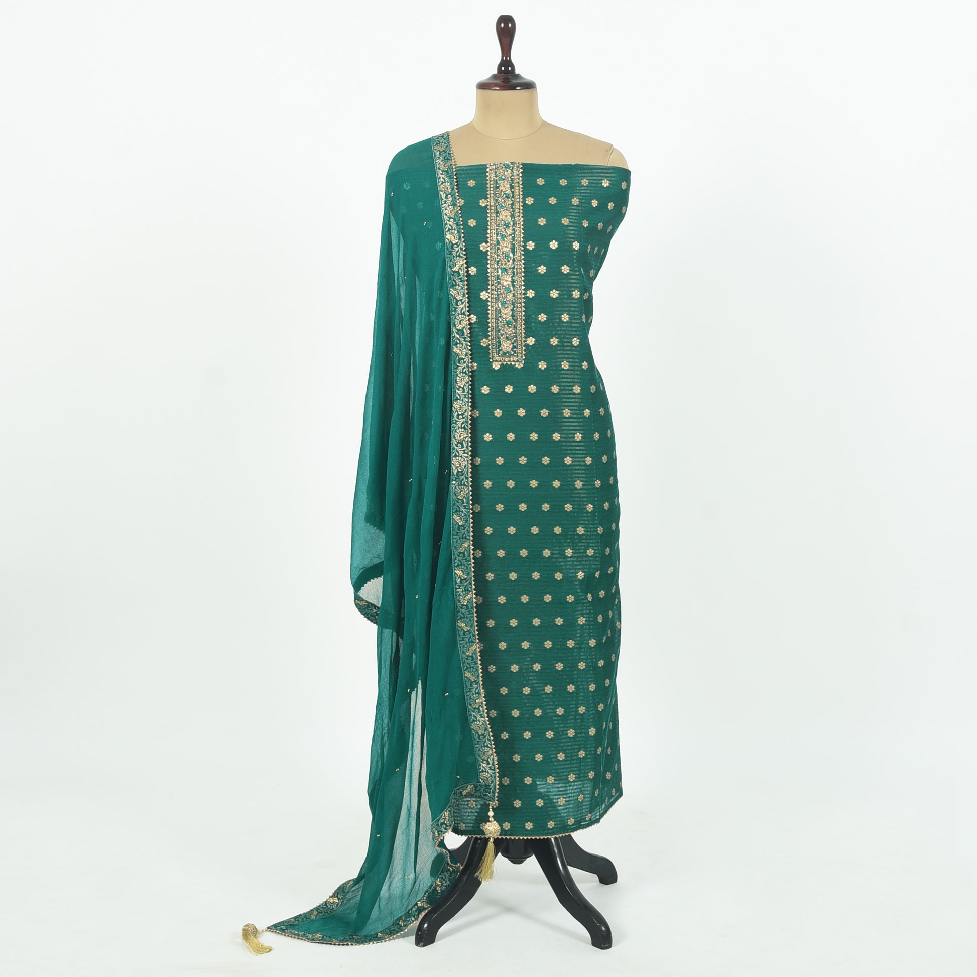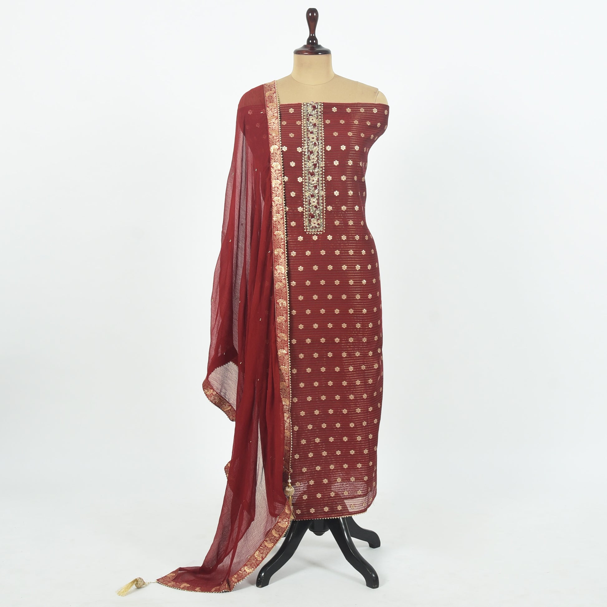 Elevate your wardrobe with this premium unstitched Organza suit set featuring a top, bottom, and dupatta. Crafted from luxurious Organza fabric known for its lightweight, sheer texture and subtle sheen. Perfect for customizing to your exact measurements and style preferences, this versatile three-piece ensemble allows for personalized tailoring while maintaining sophisticated elegance for special occasions.