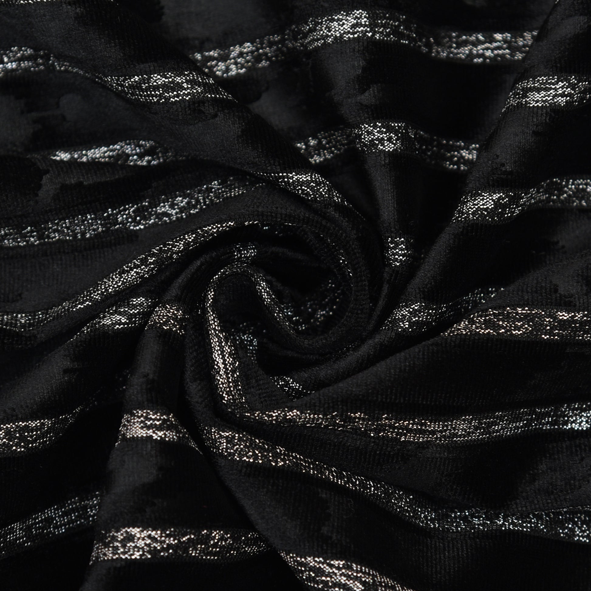 Introducing our Velvet Glitter Stripe Fabric, a luxurious addition to any project. The soft velvet texture is enhanced with a subtle shimmer, adding a touch of elegance and sophistication. Perfect for creating eye-catching garments and home décor items. Upgrade to this high-quality fabric for a truly refined finish.