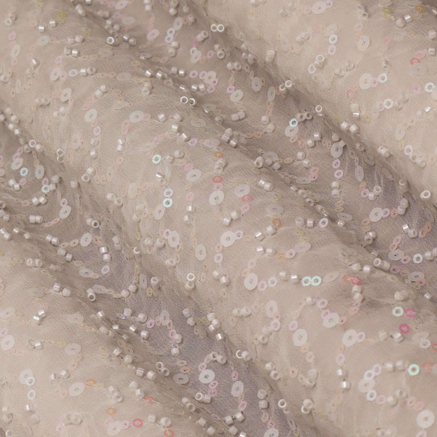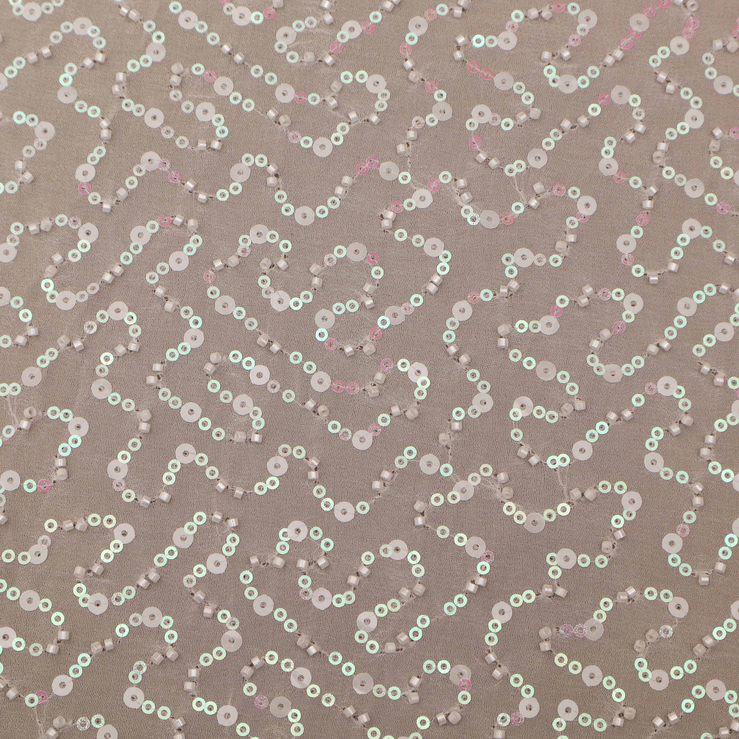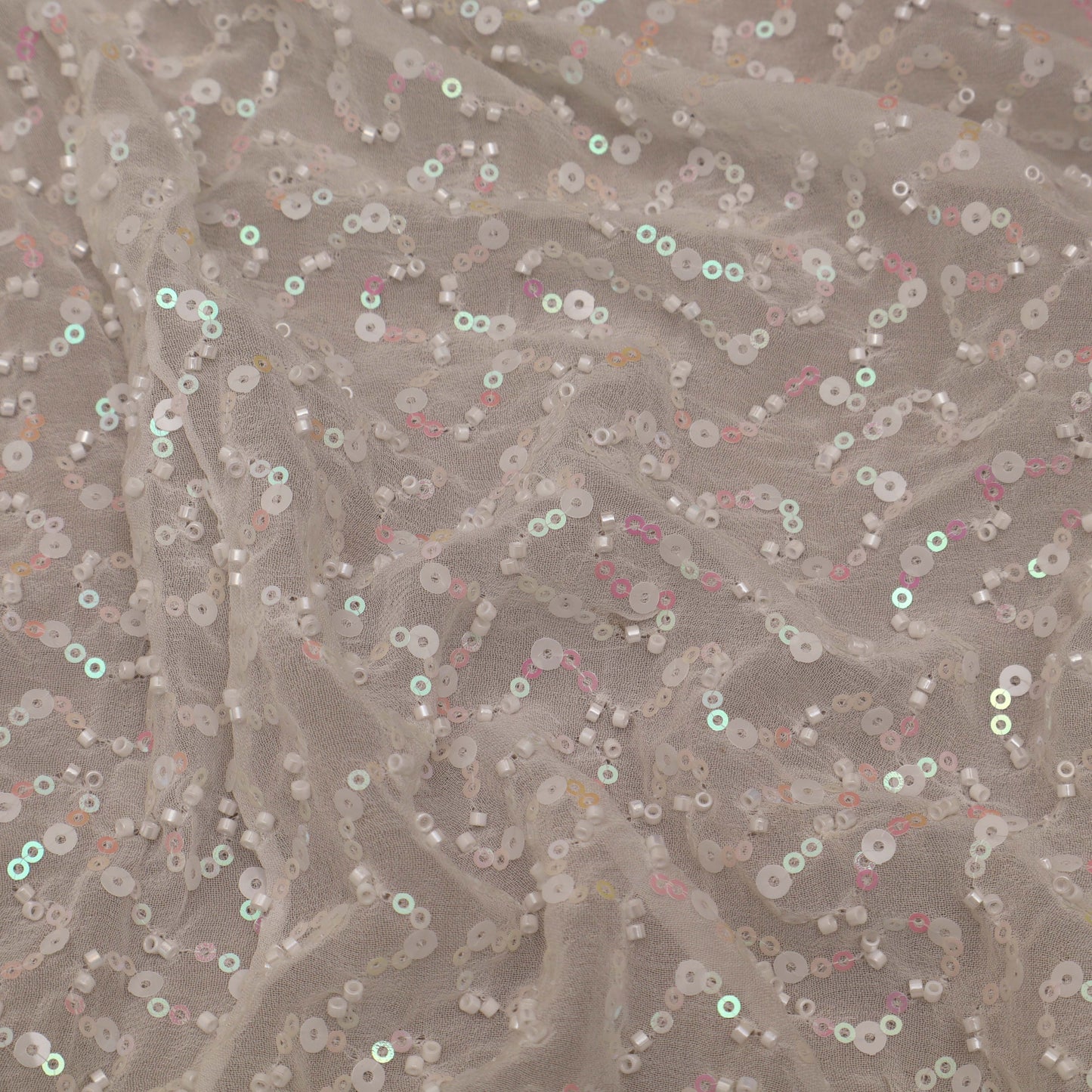This white georgette fabric features delicate embroidery, resulting in an elegant and luxurious fabric. The light-weight material is smooth and breathable, making it perfect for creating stunning dresses and other garments. Experience the beauty and sophistication of this fabric for yourself.