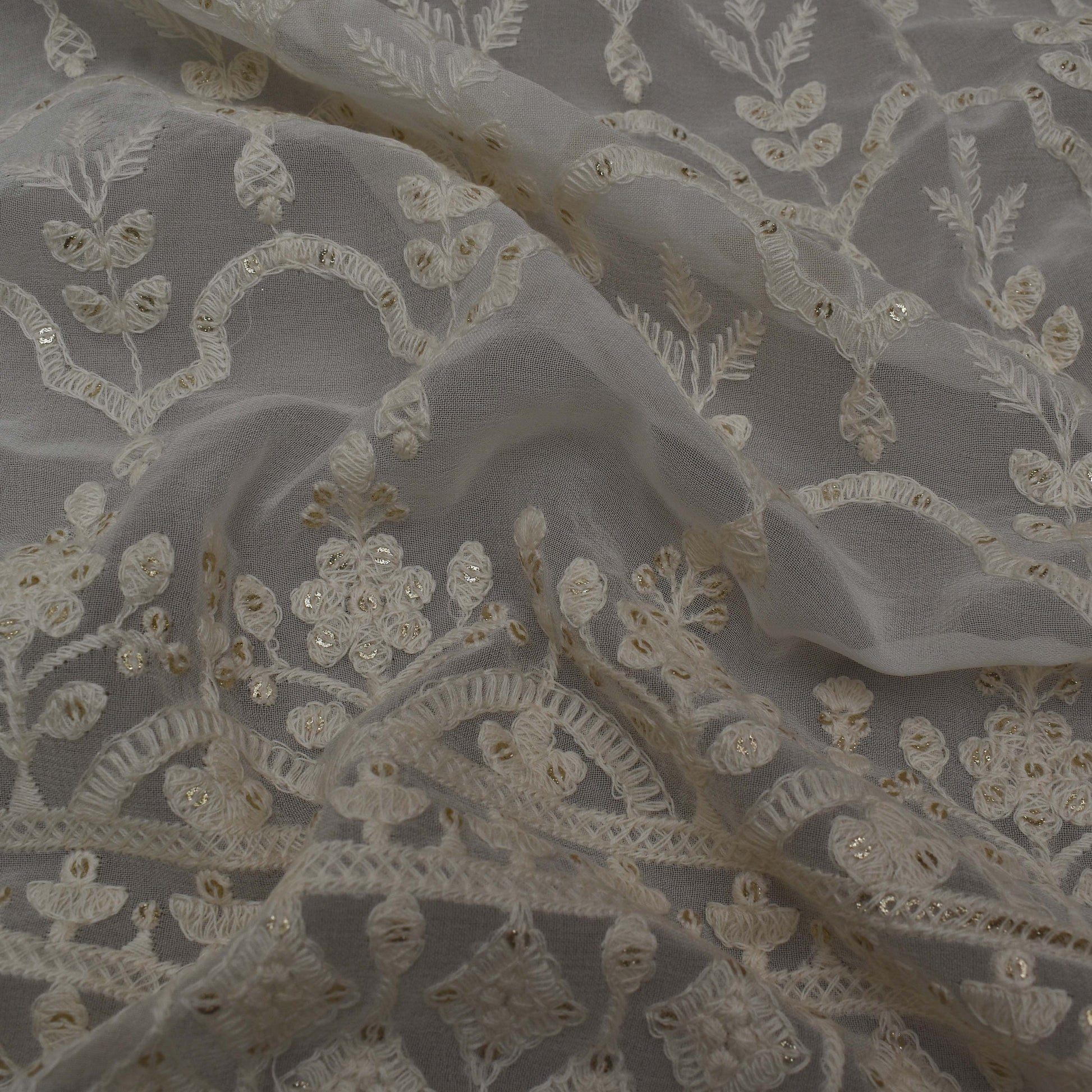 This white georgette fabric features delicate embroidery, perfect for adding a touch of elegance to any garment. Made with high-quality materials, it offers a soft and lightweight feel with a beautiful drape. Elevate your next project with this luxurious fabric.
