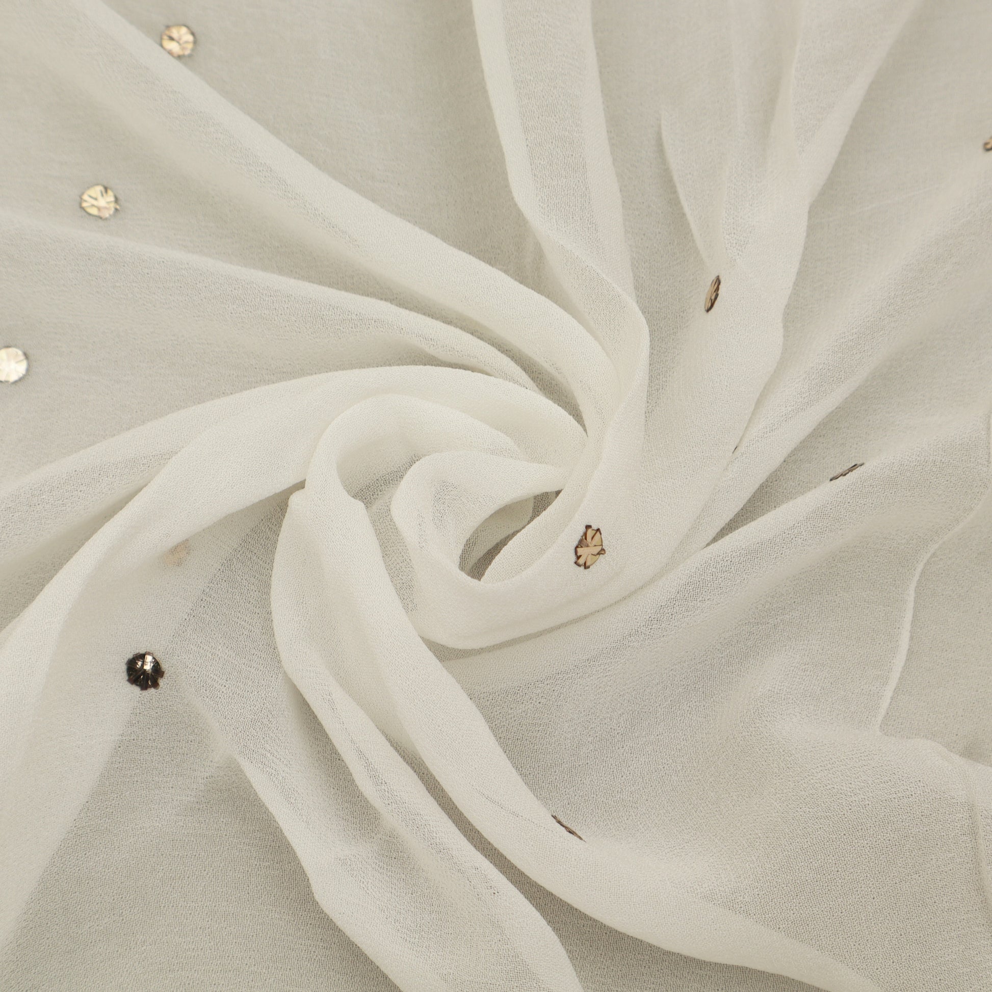 This White Color Georgette Mukesh Fabric is a must-have for any fashion-forward wardrobe. Made from high-quality materials, this fabric offers a luxurious feel and elegant look. Its lightweight and breathable properties make it perfect for all seasons. Elevate your style with this versatile and timeless fabric.